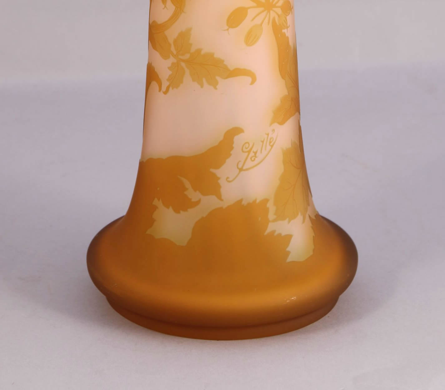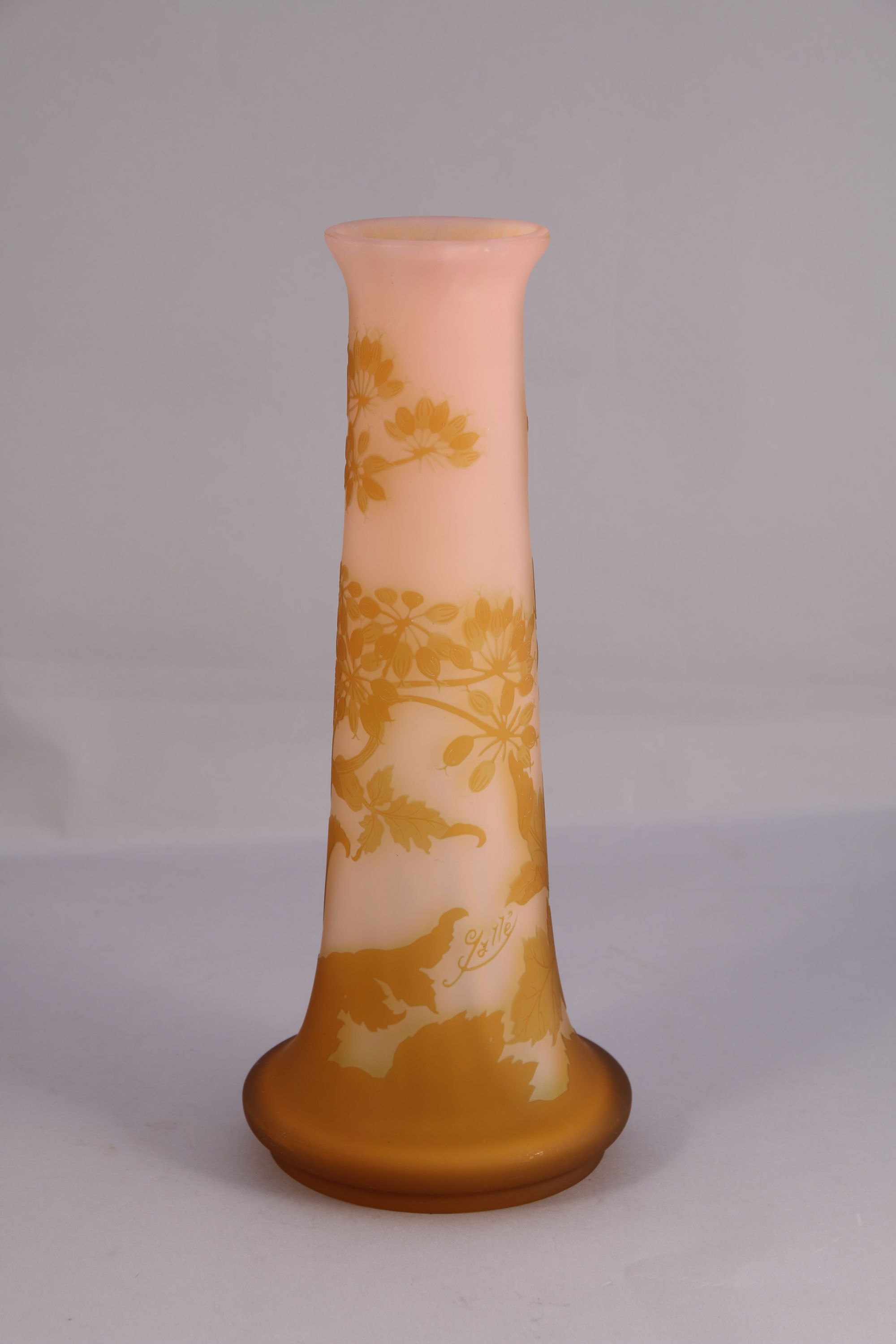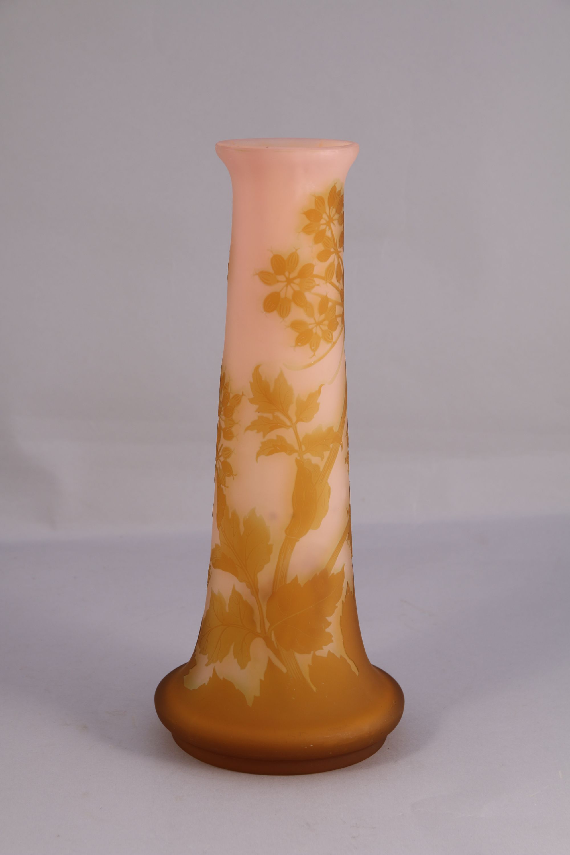 à panse aplatie et col évasé en verre multicouche à décor orangé dégagé à l'acide d'angéliques sur fond rosé.