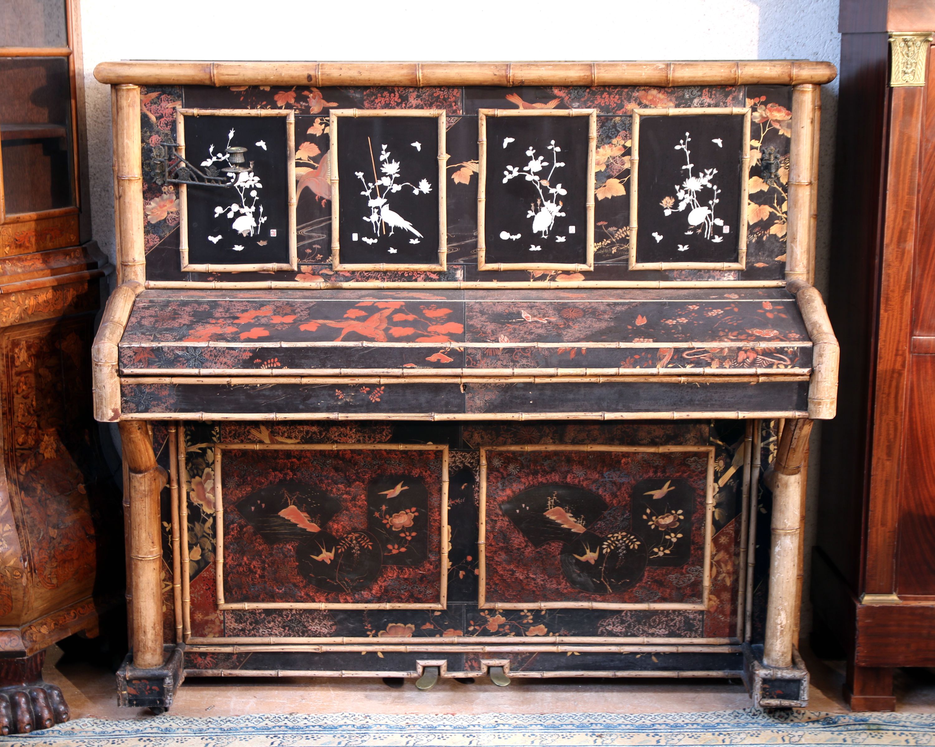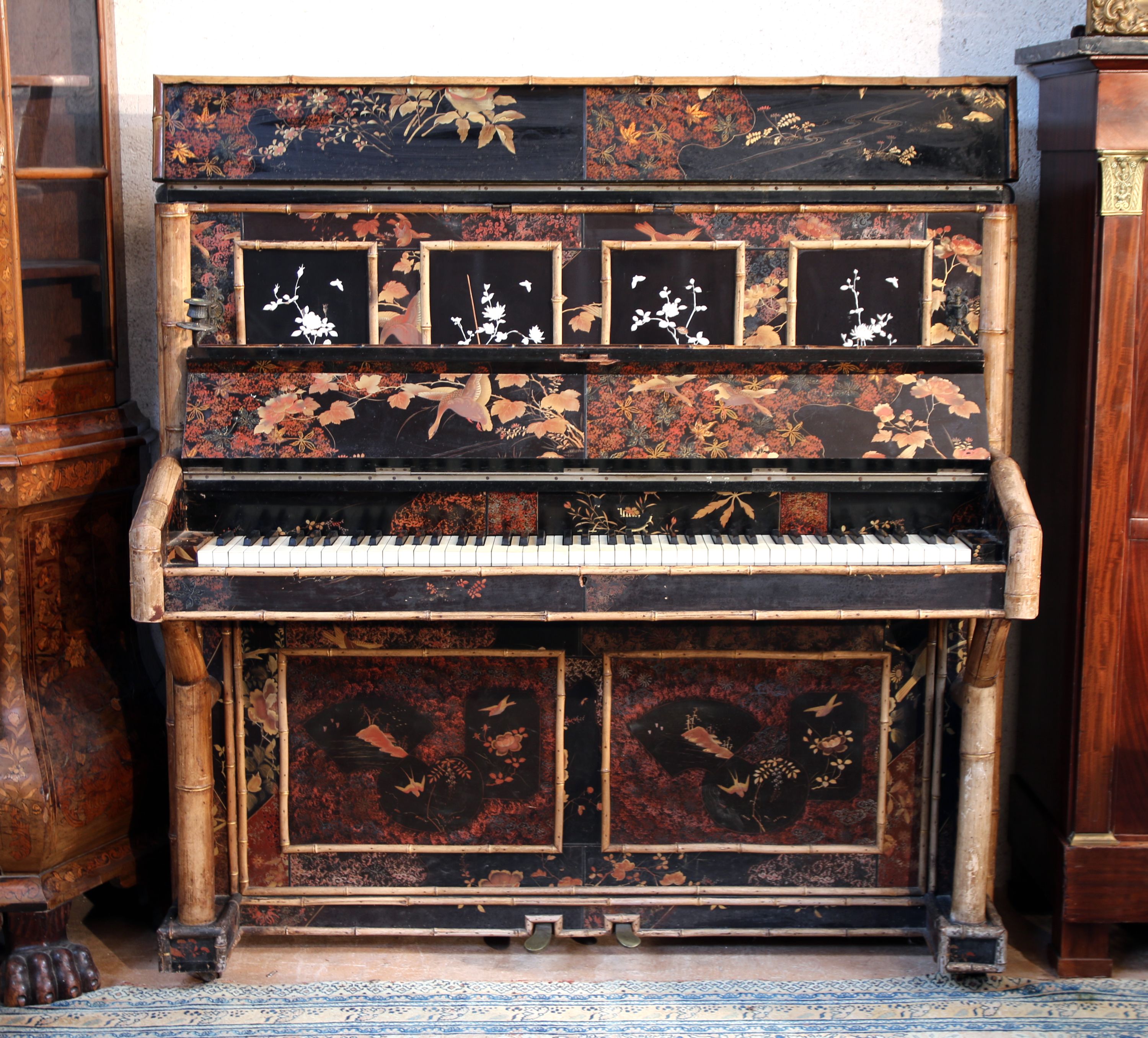 Deux pédales, bois et bambou appliqué dans tous les angles, touches en ivoires.