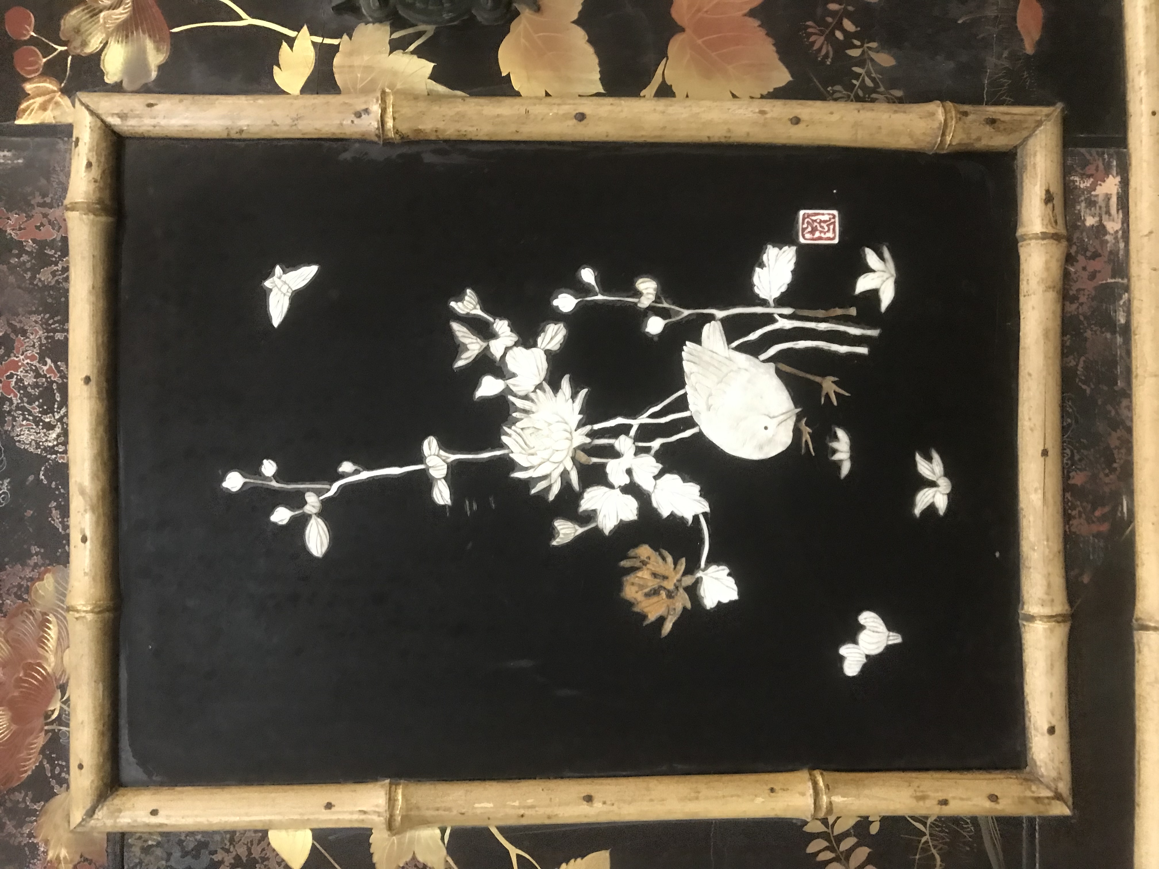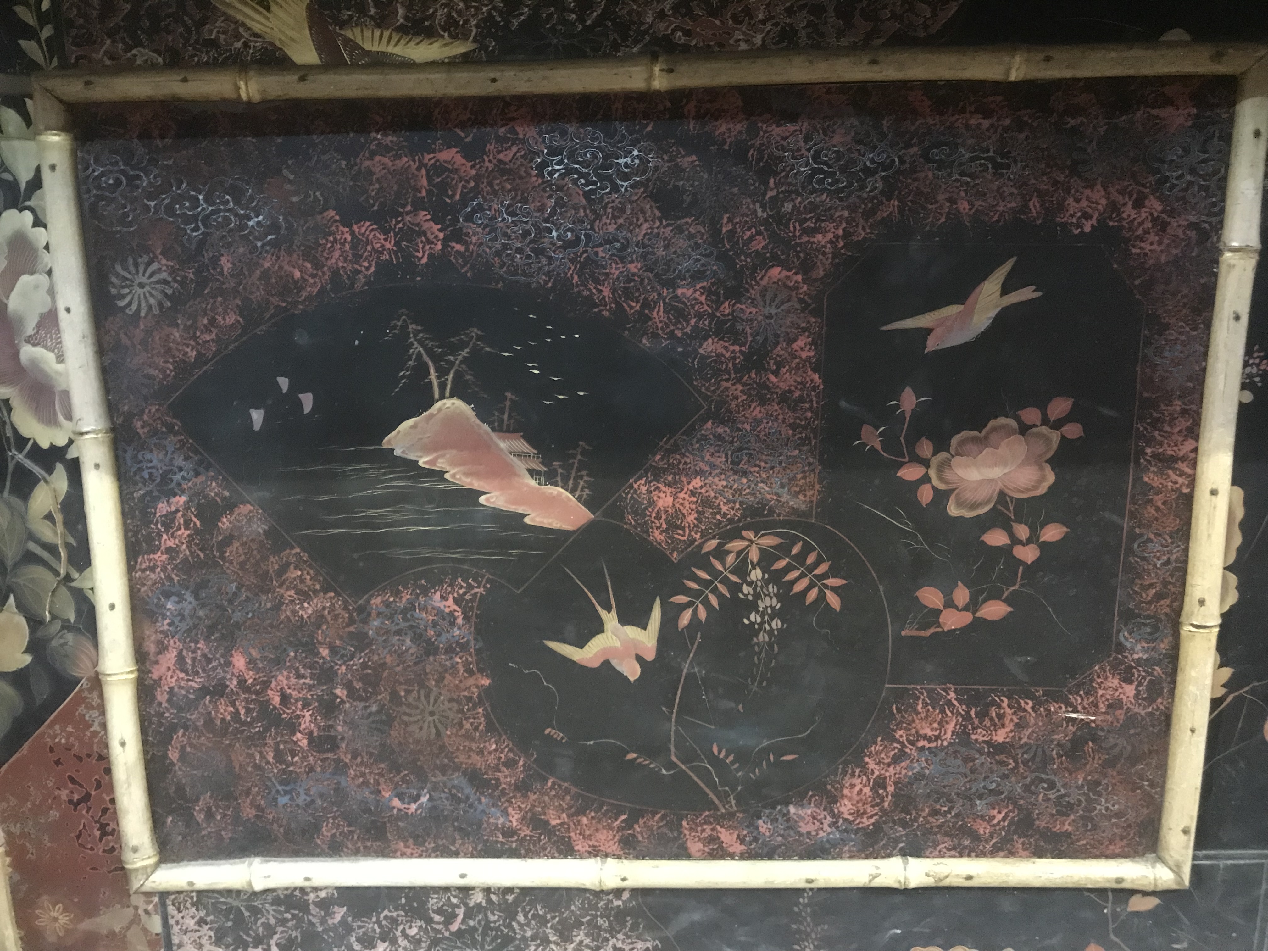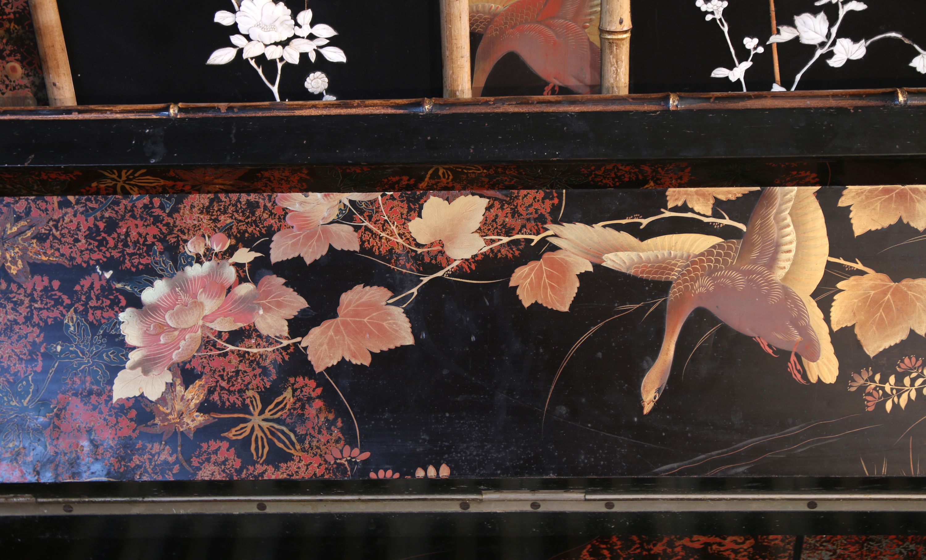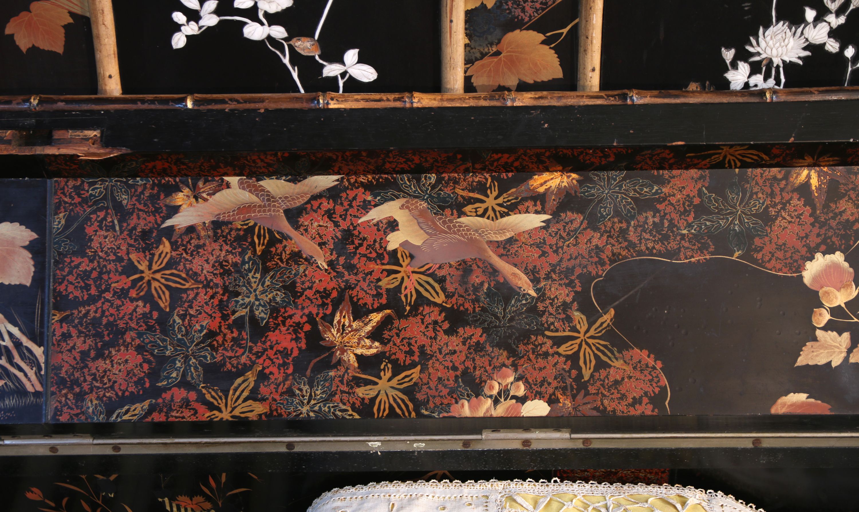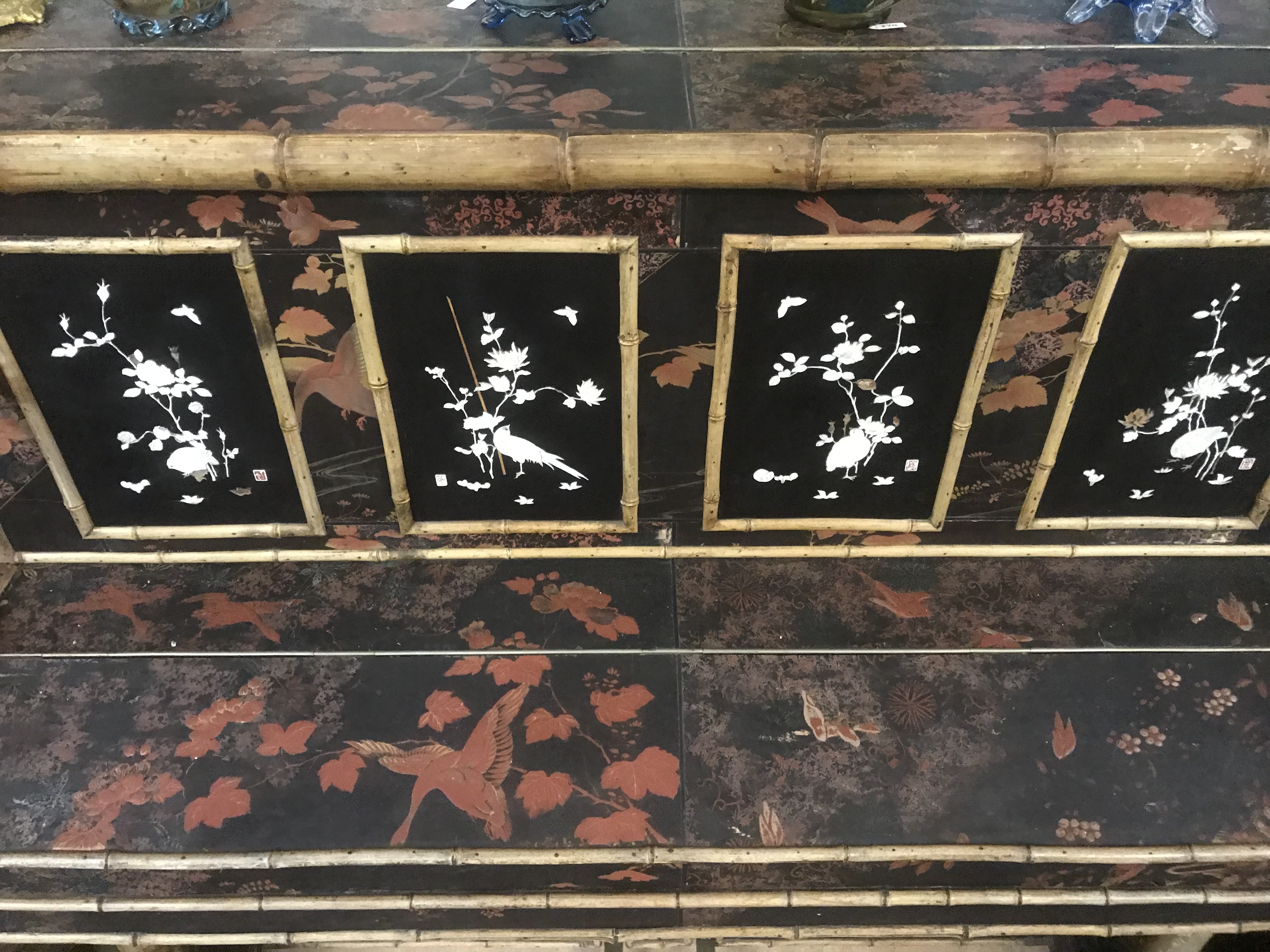 Laqué sur trois cotés, le revers du pupitre et le revers du sommet de la caisse, d'un décor de volatiles dans un paysage de montagnes et de fond de végétation, dont des panneaux provenant de paravents anciens. Quatre tableaux incrustés sur fond laqué noir avec cartouches rouge de l'artiste, figurant des volatiles, des papillons et des branches fleuries, ornent la face avant de la caisse.