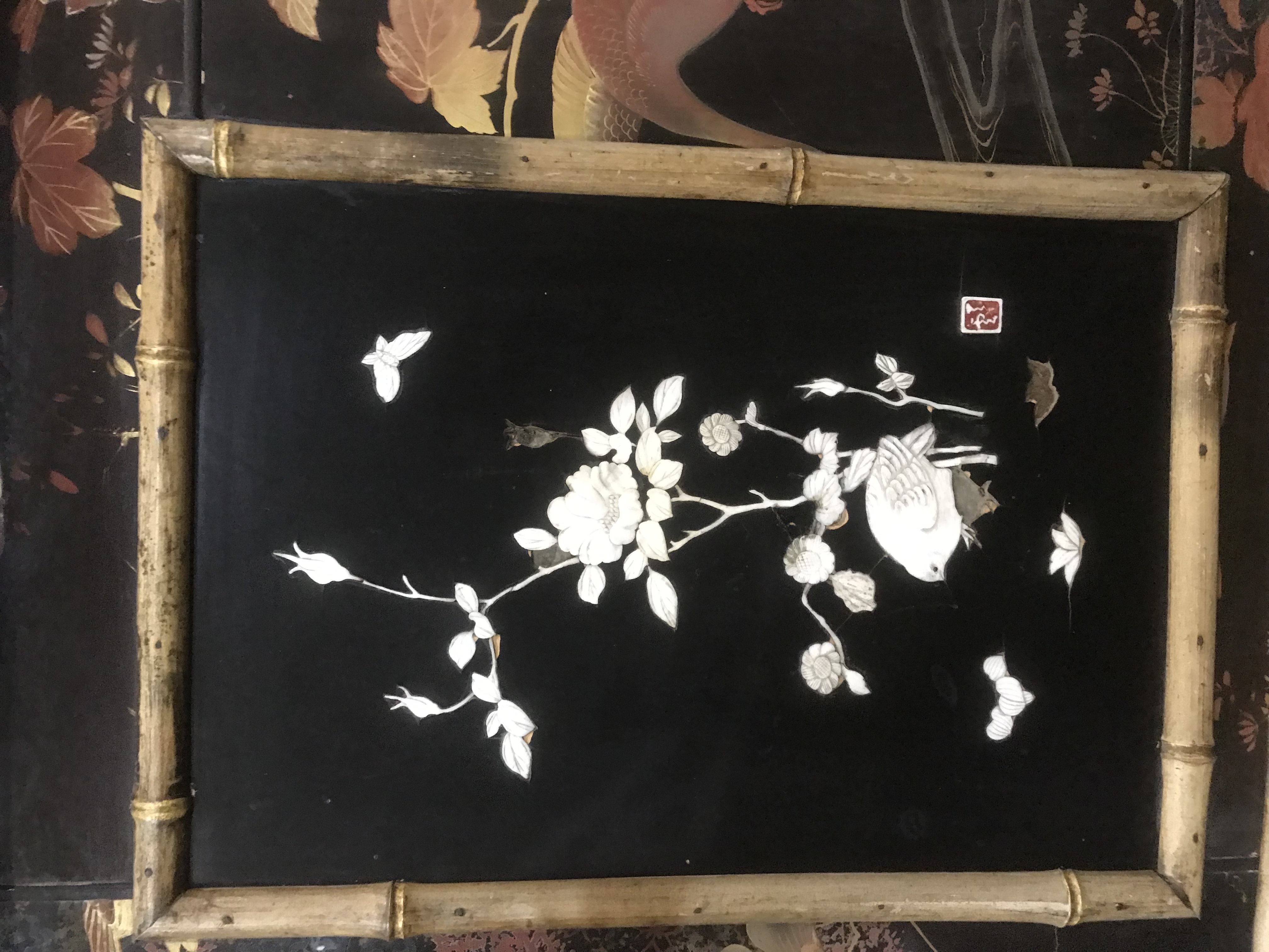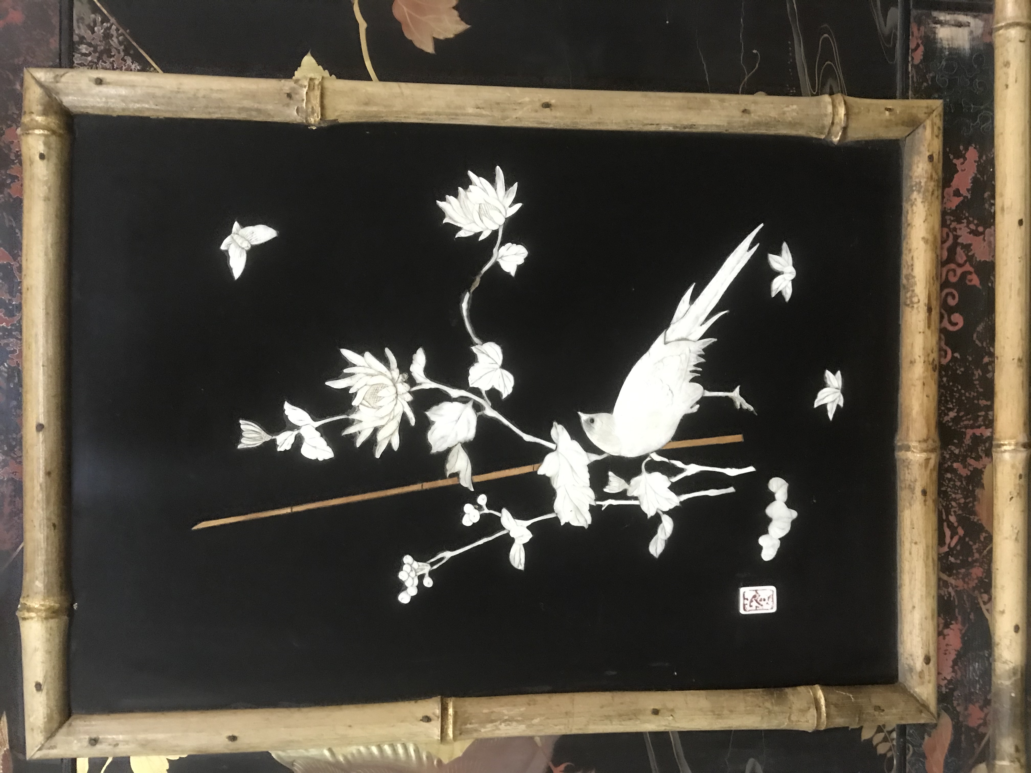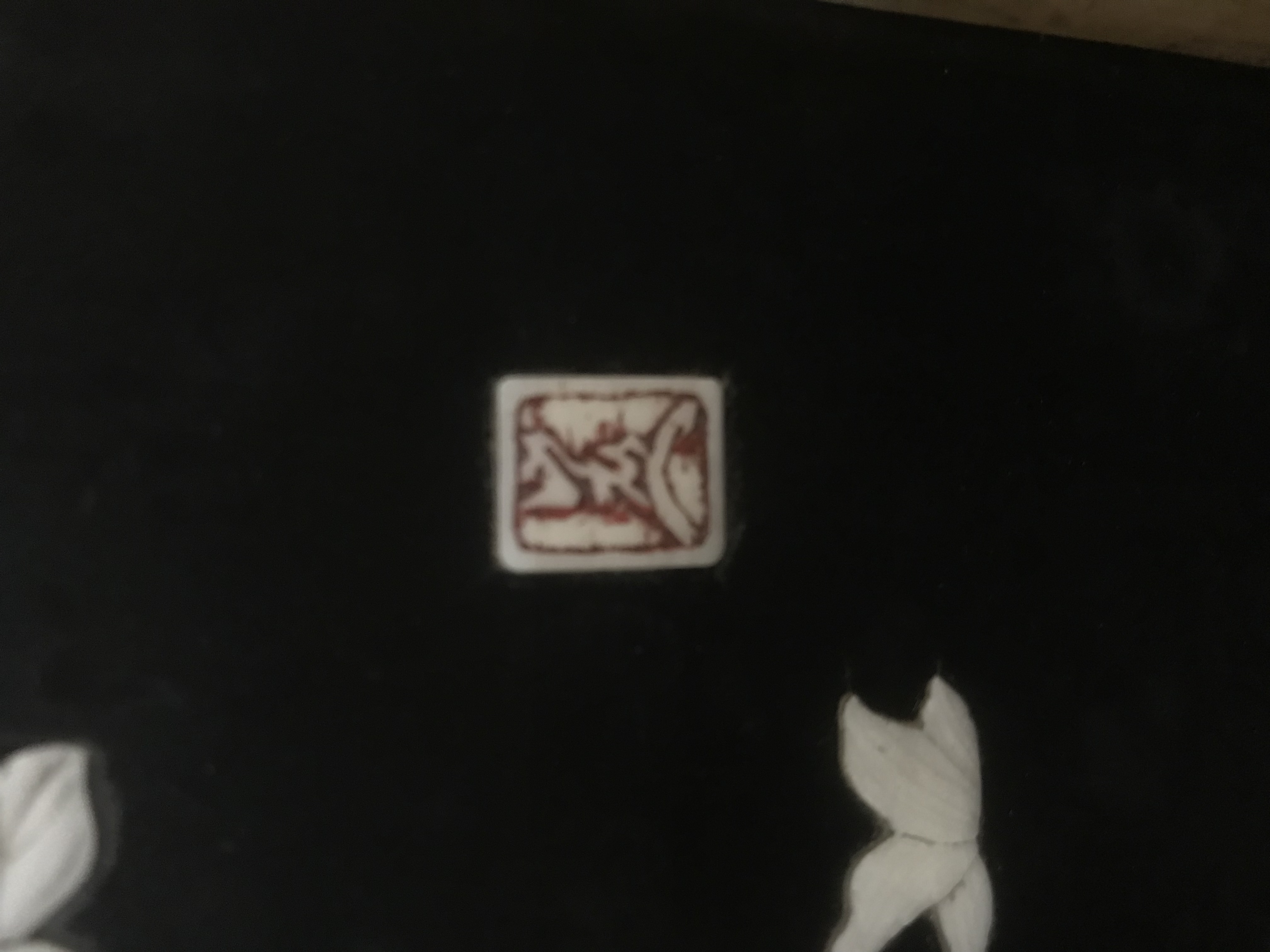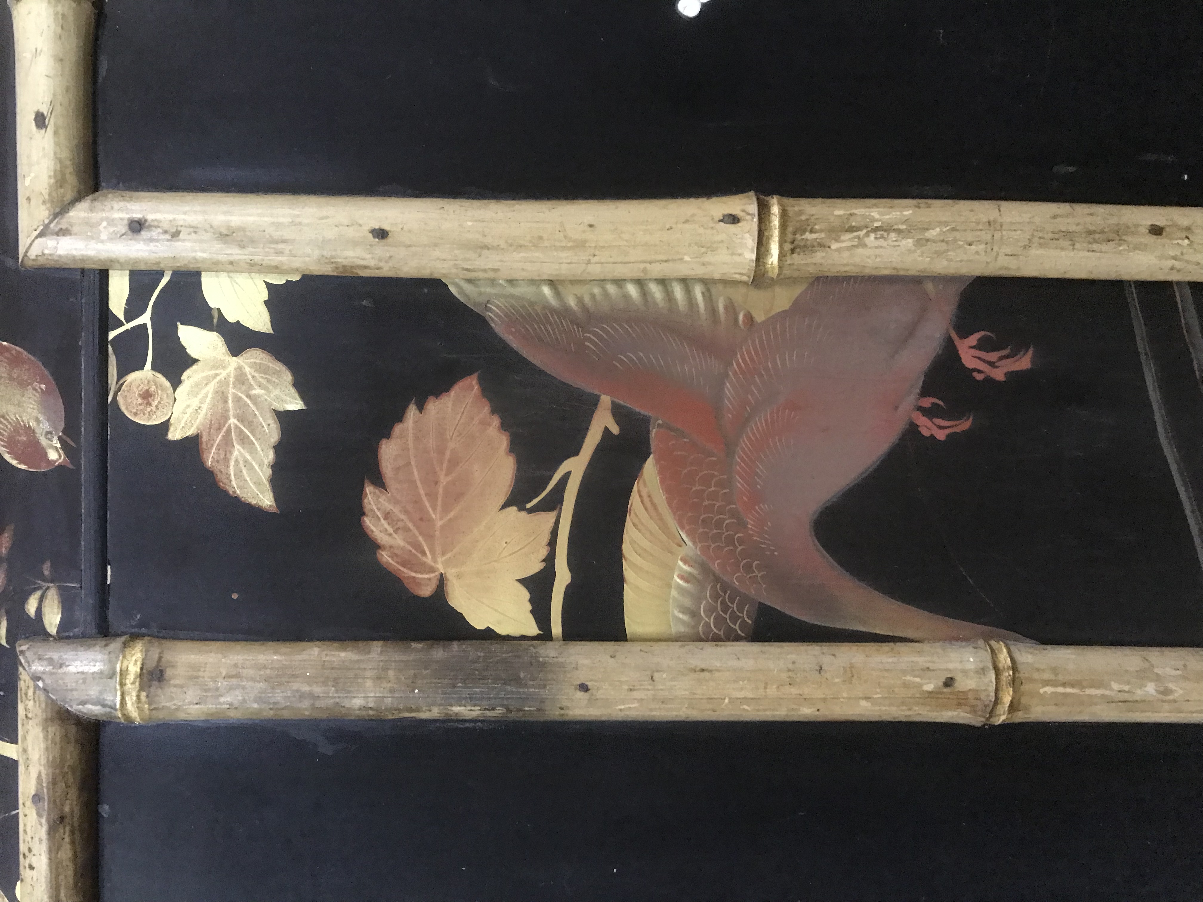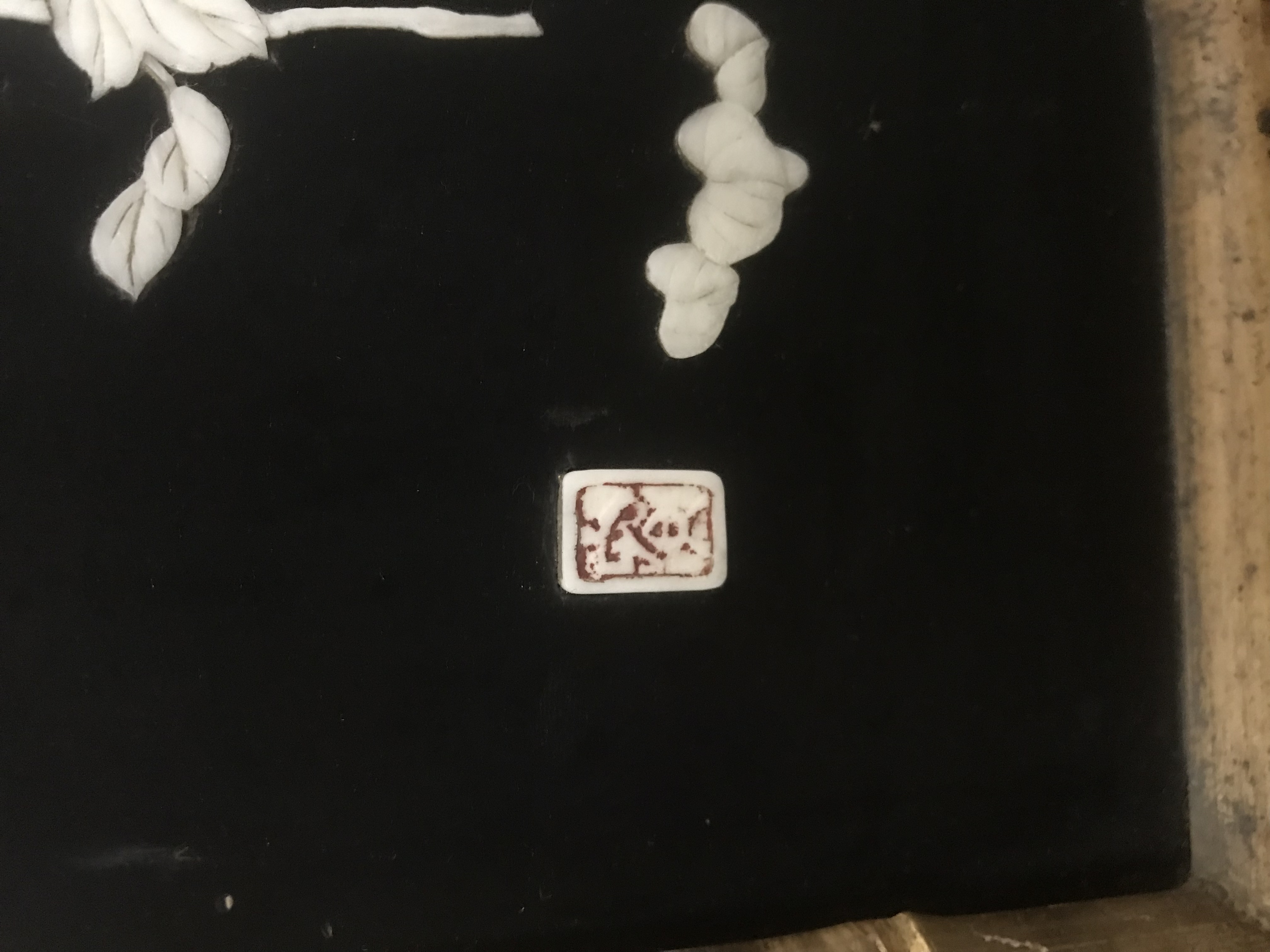 Laqué sur trois cotés, le revers du pupitre et le revers du sommet de la caisse, d'un décor de volatiles dans un paysage de montagnes et de fond de végétation, dont des panneaux provenant de paravents anciens. Quatre tableaux incrustés sur fond laqué noir avec cartouches rouge de l'artiste, figurant des volatiles, des papillons et des branches fleuries, ornent la face avant de la caisse.