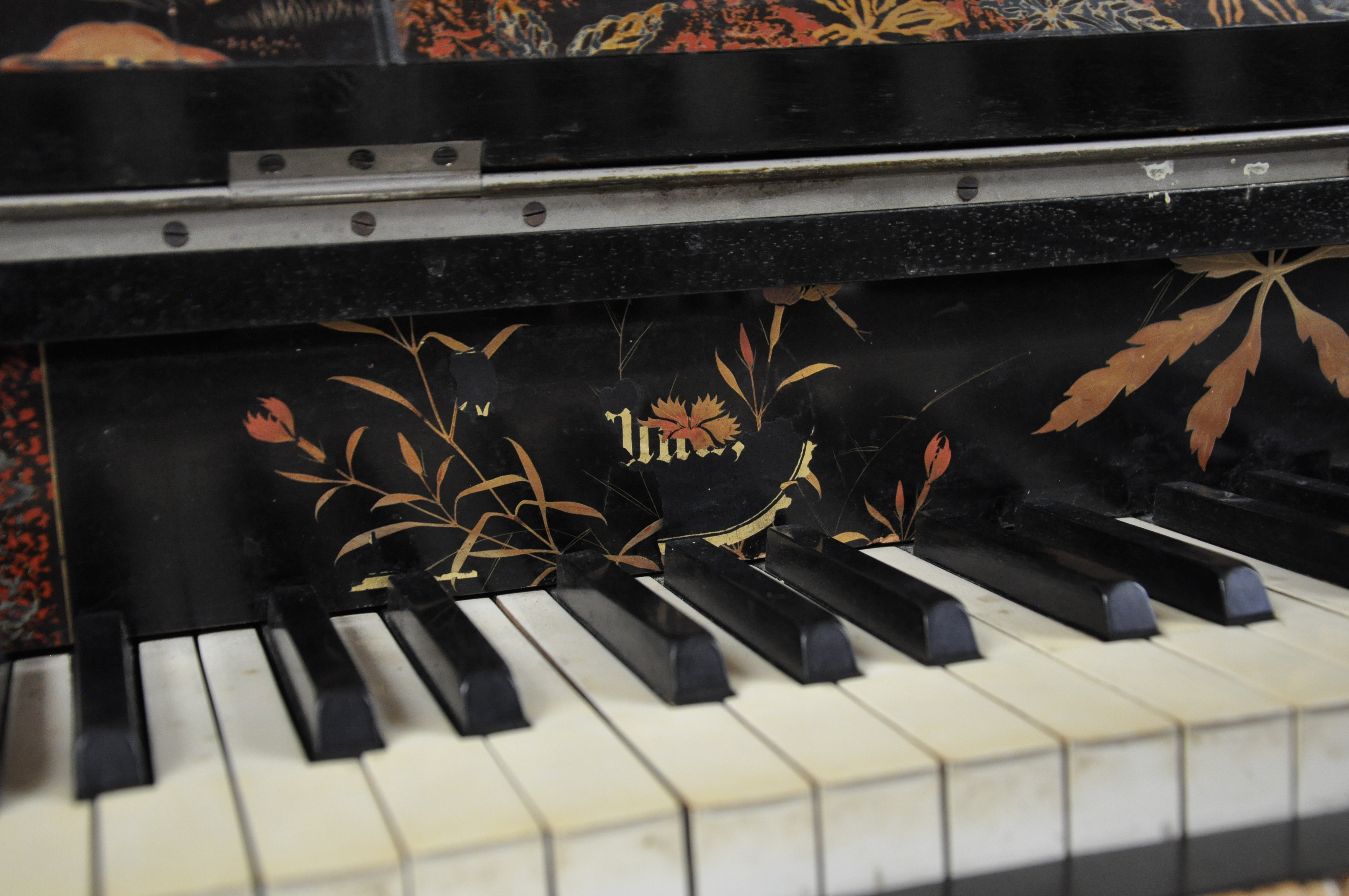 PIANO DROIT à décor de laques et marqueterie.