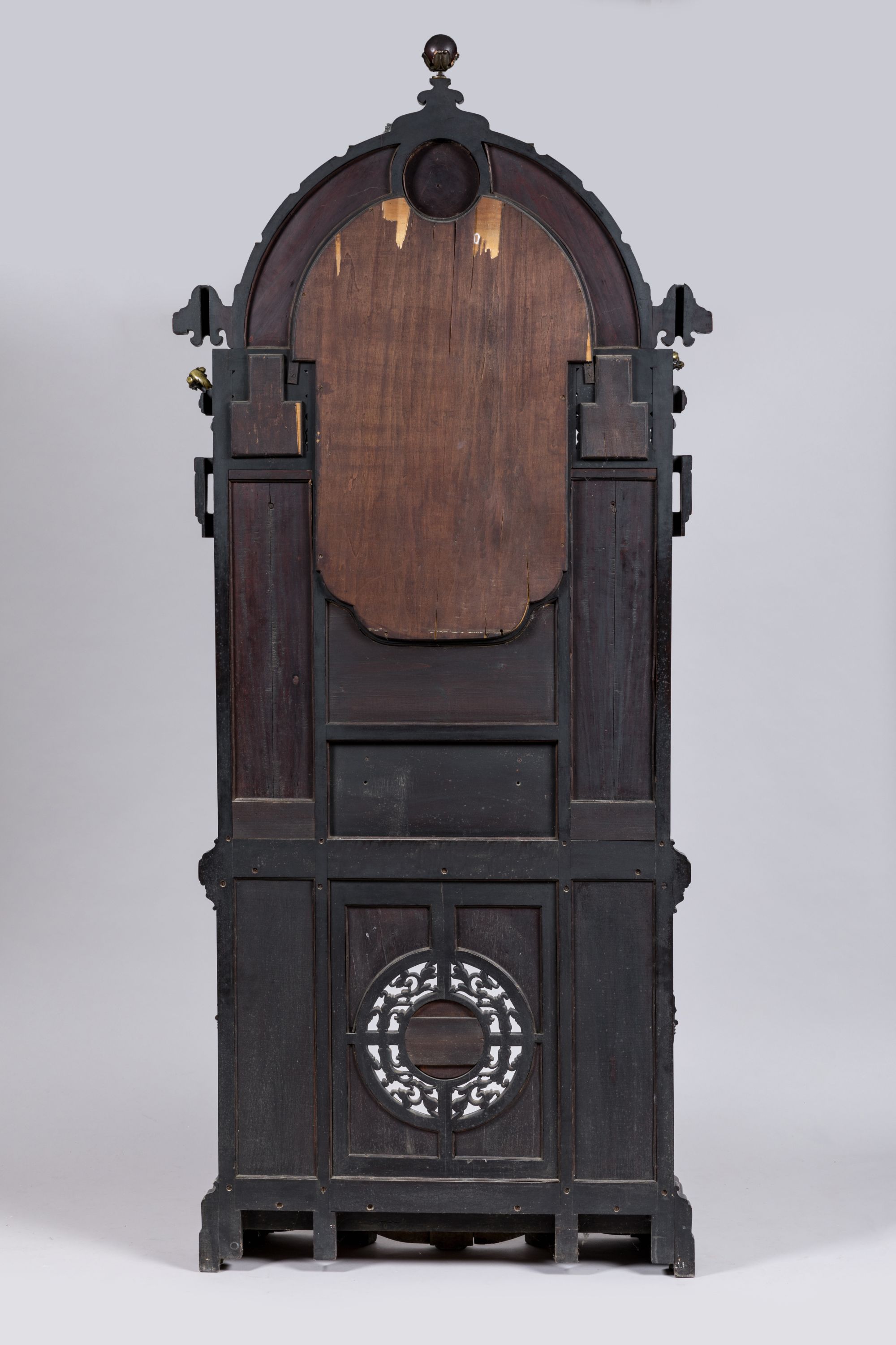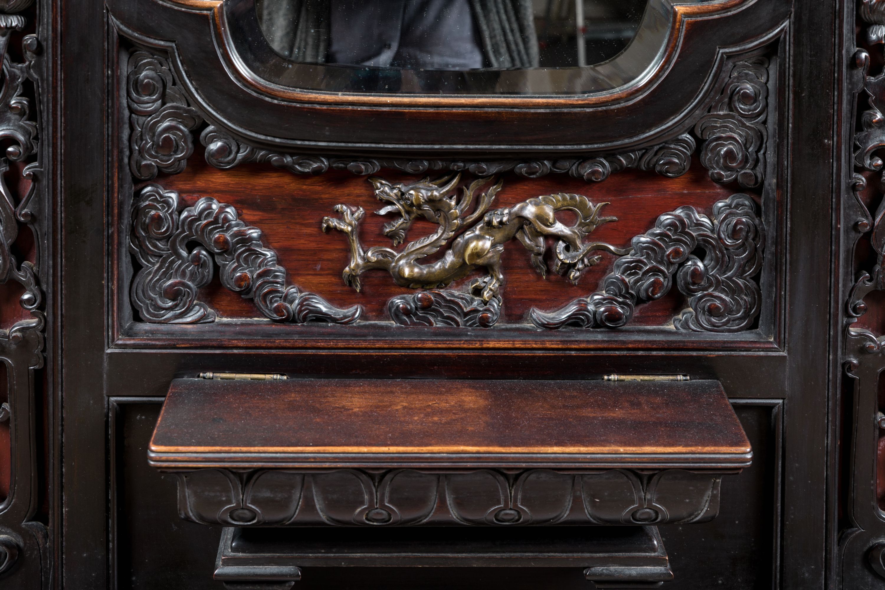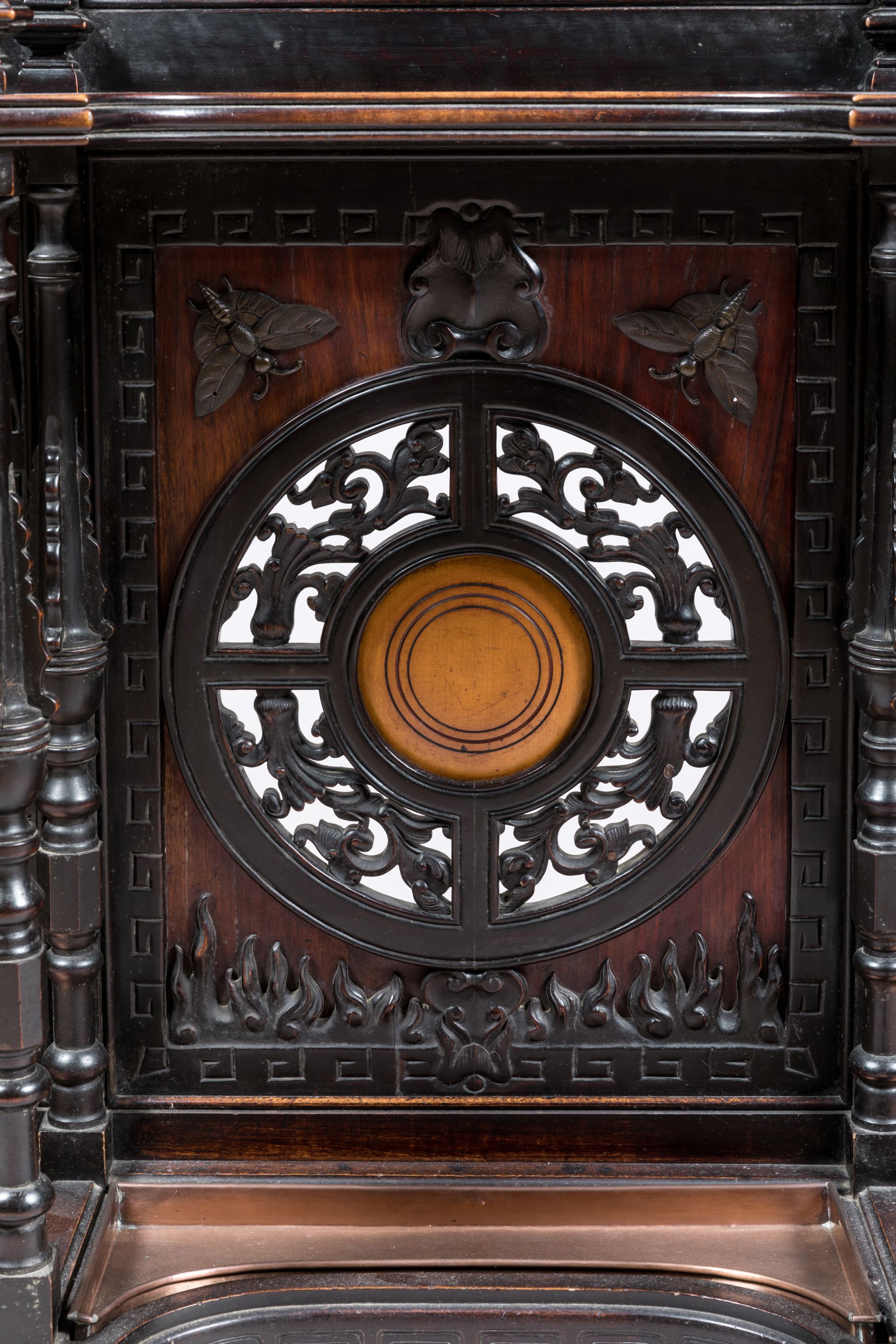 à large bâti en bois noirci au décor ajouré de dragons, papillons et entrelacs végétaux sur un bois teinté rouge. Le meuble est aménagé au centre d'un miroir et de deux mascarons aux gueules jaillissantes de serpents tricéphales formant porte-chapeaux. La partie inférieure permettant de loger six cannes et douze parapluies retenus par des bases en cuivre. Reposant sur une plinthe reliée par six colonnettes.
