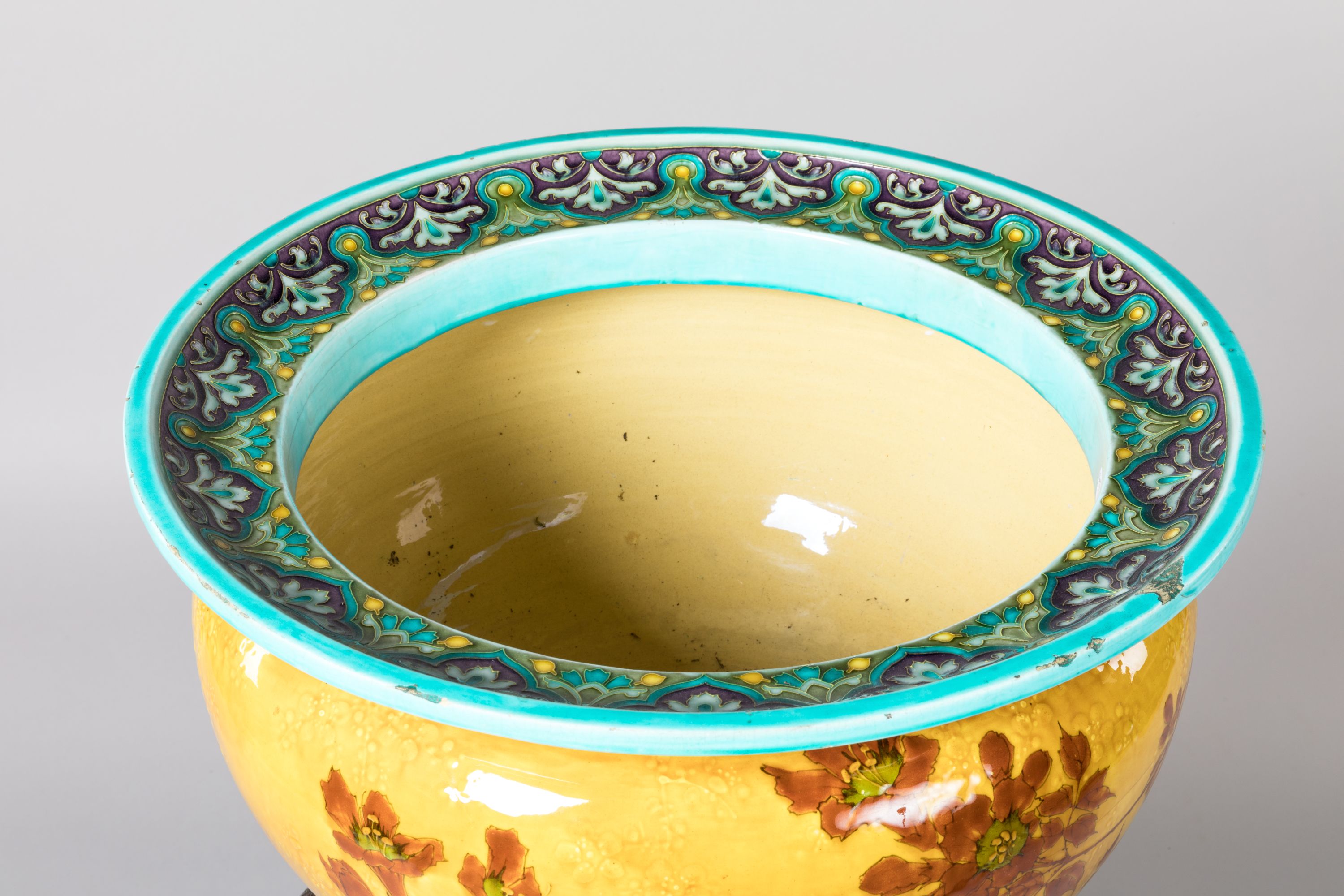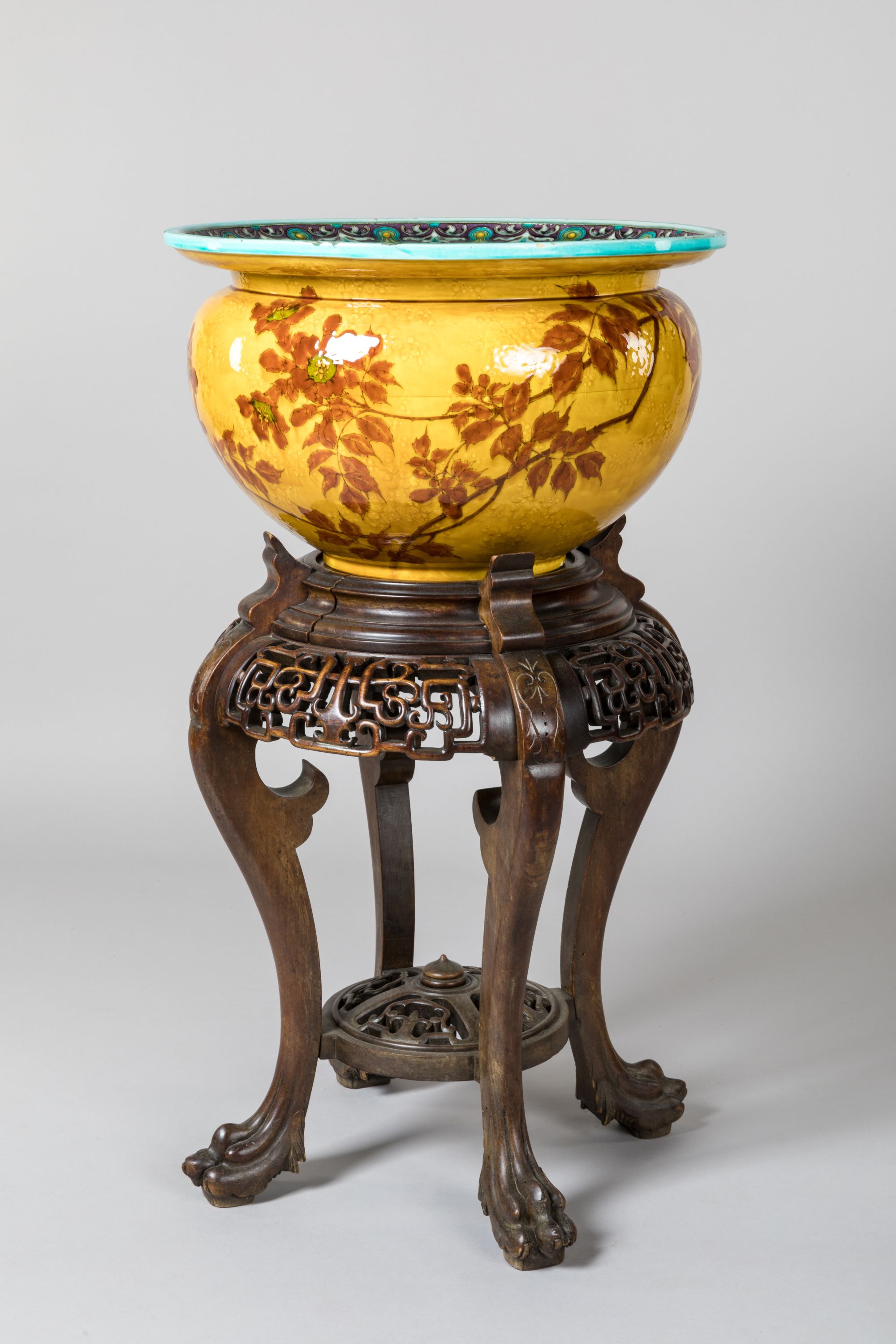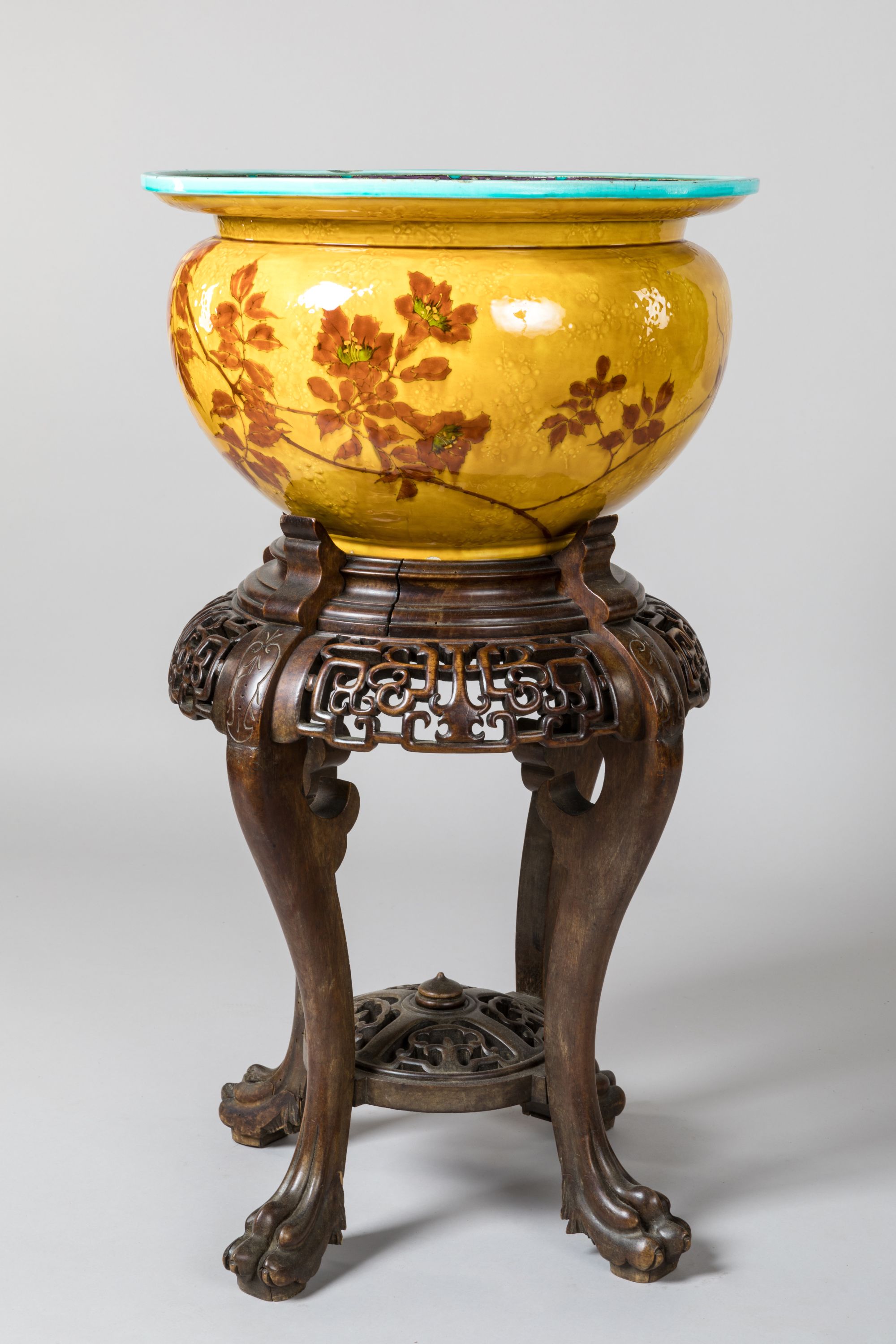 JAPANESE-INSPIRED enameled limestone BASIN and wooden STAND. After Théodore DECK, by MILET, DIFFLOTH and VIARDOT. The basin signed by Diffloth and Milet, Sèvres. Provenance: according to the owner's family, ordered to Viardot by Charles Quartero (born in Medea in 1866), landowner in Cherchell (Algeria). By descent.