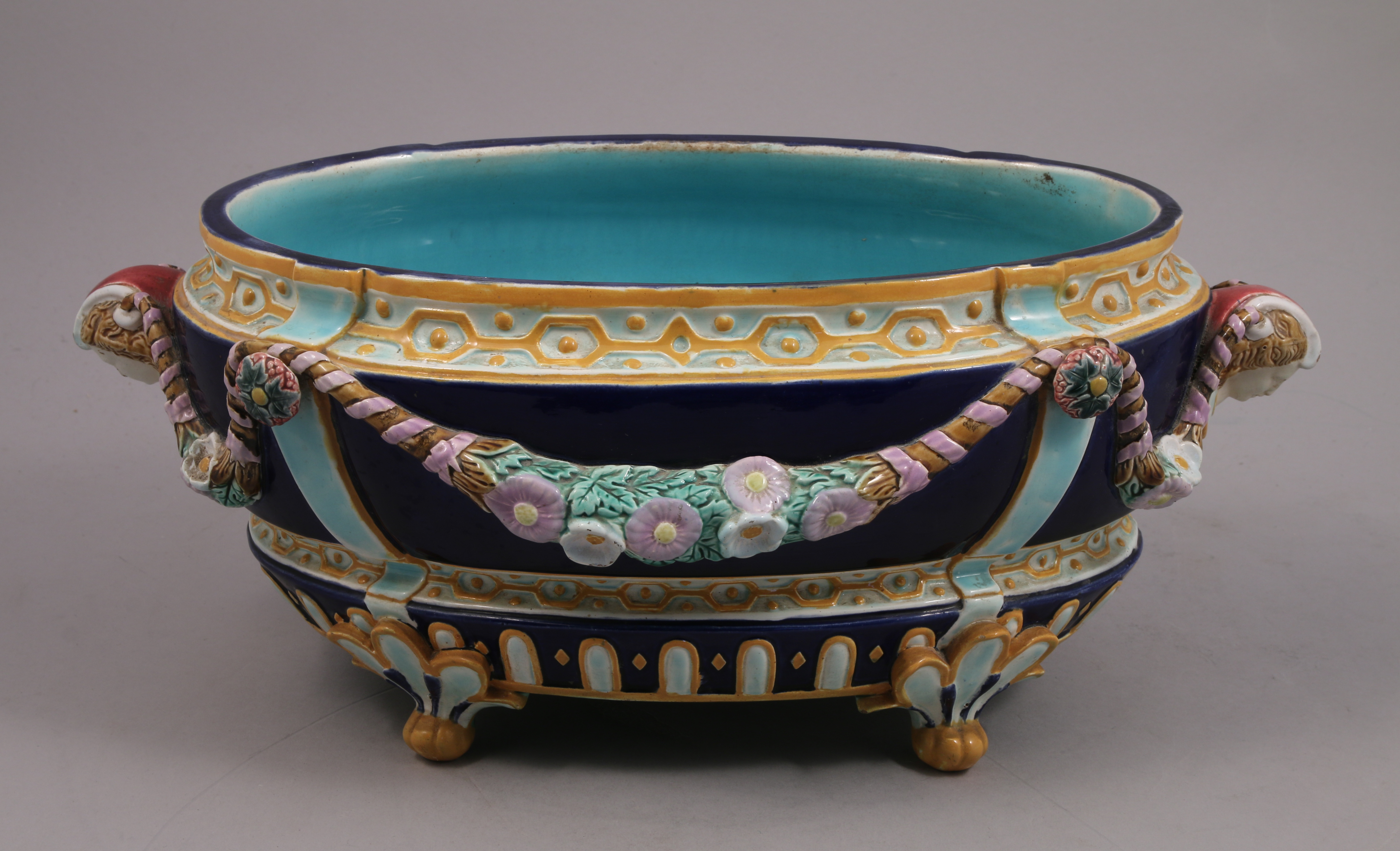 La panse à fond cobalt, ornée de guirlandes de fleurs retenues par des boutons de fleurs et des têtes de femmes formant prises. La jardinière repose sur quatre pieds griffes à palmettes. Marque "J.HOLDCROFT" en creux au revers.