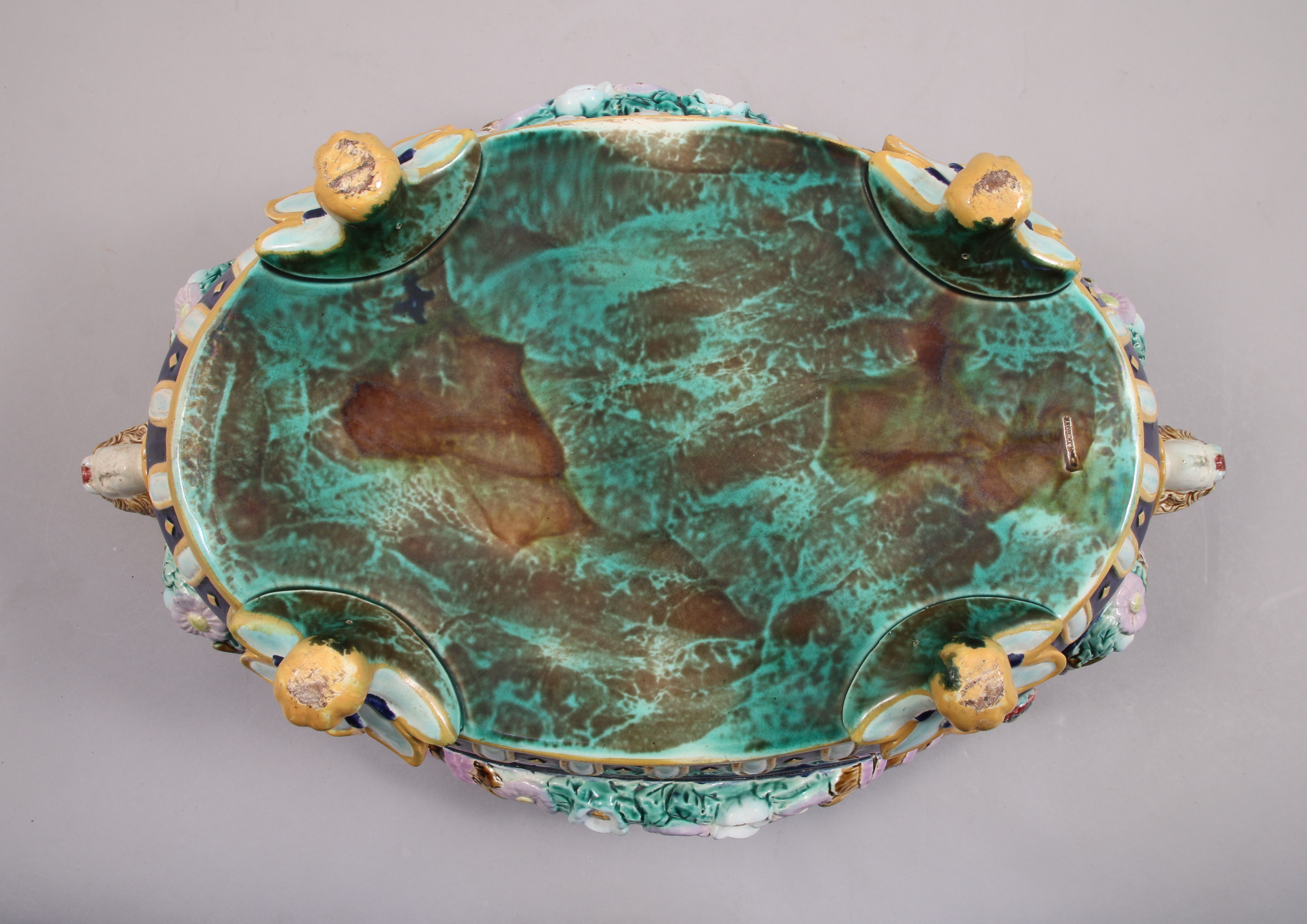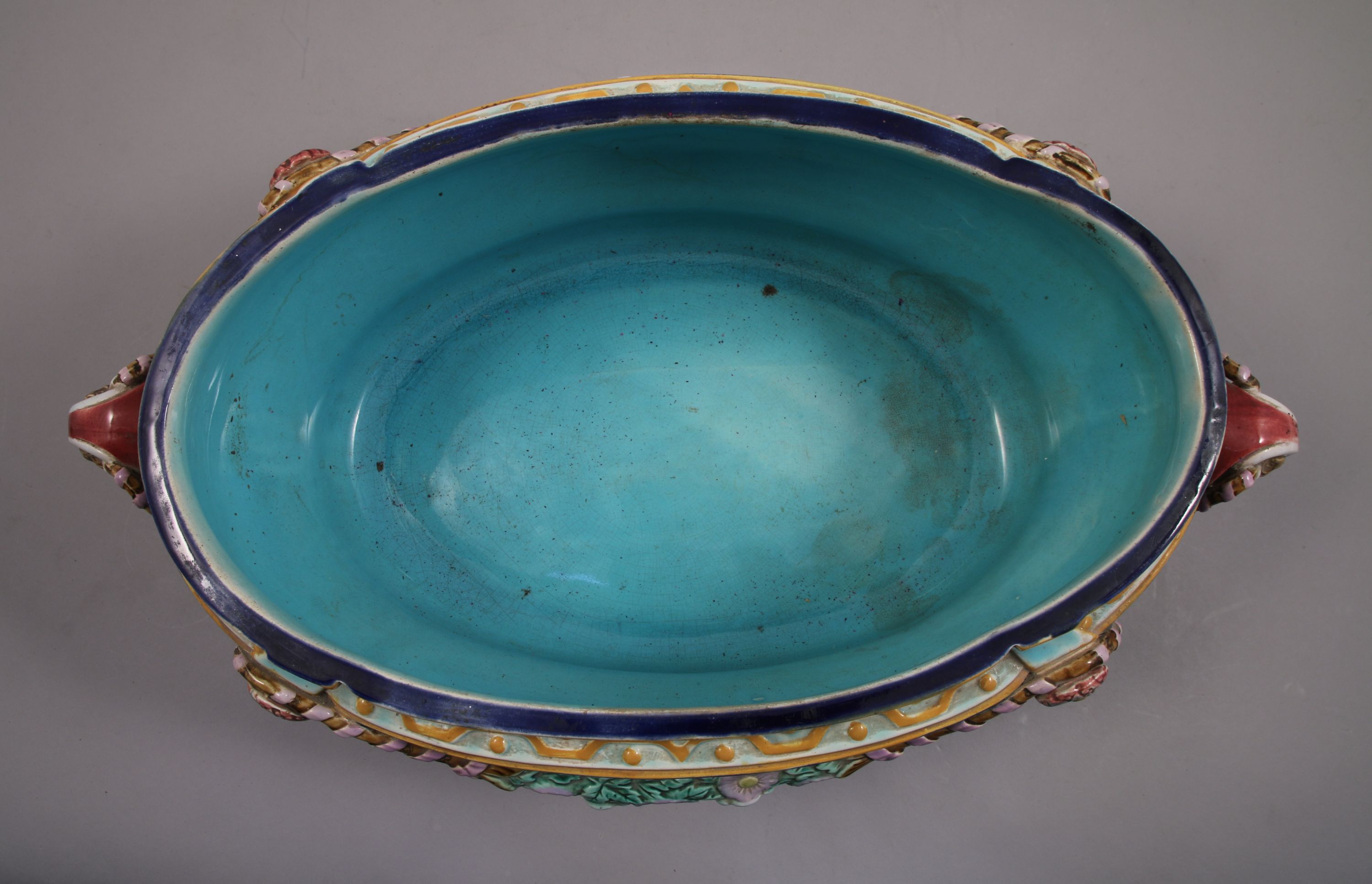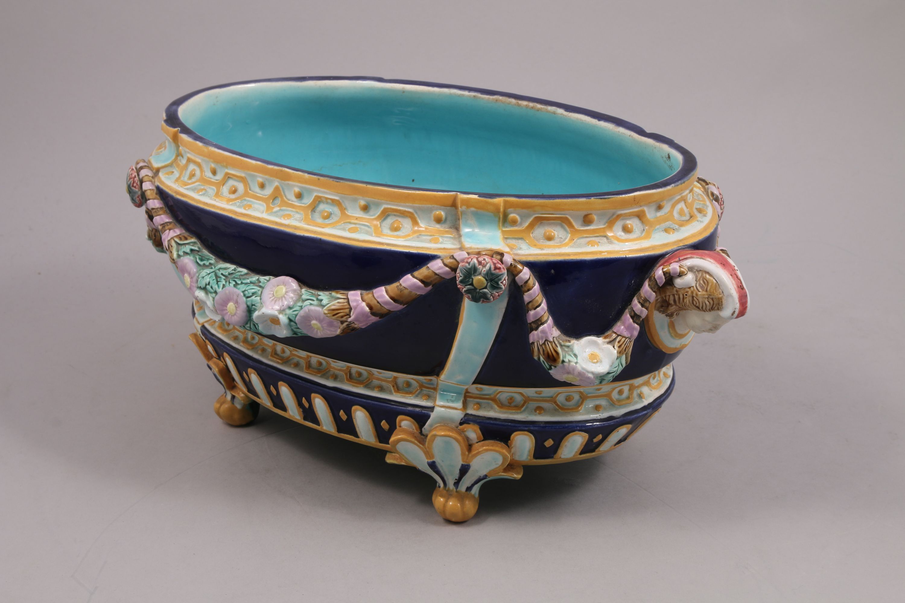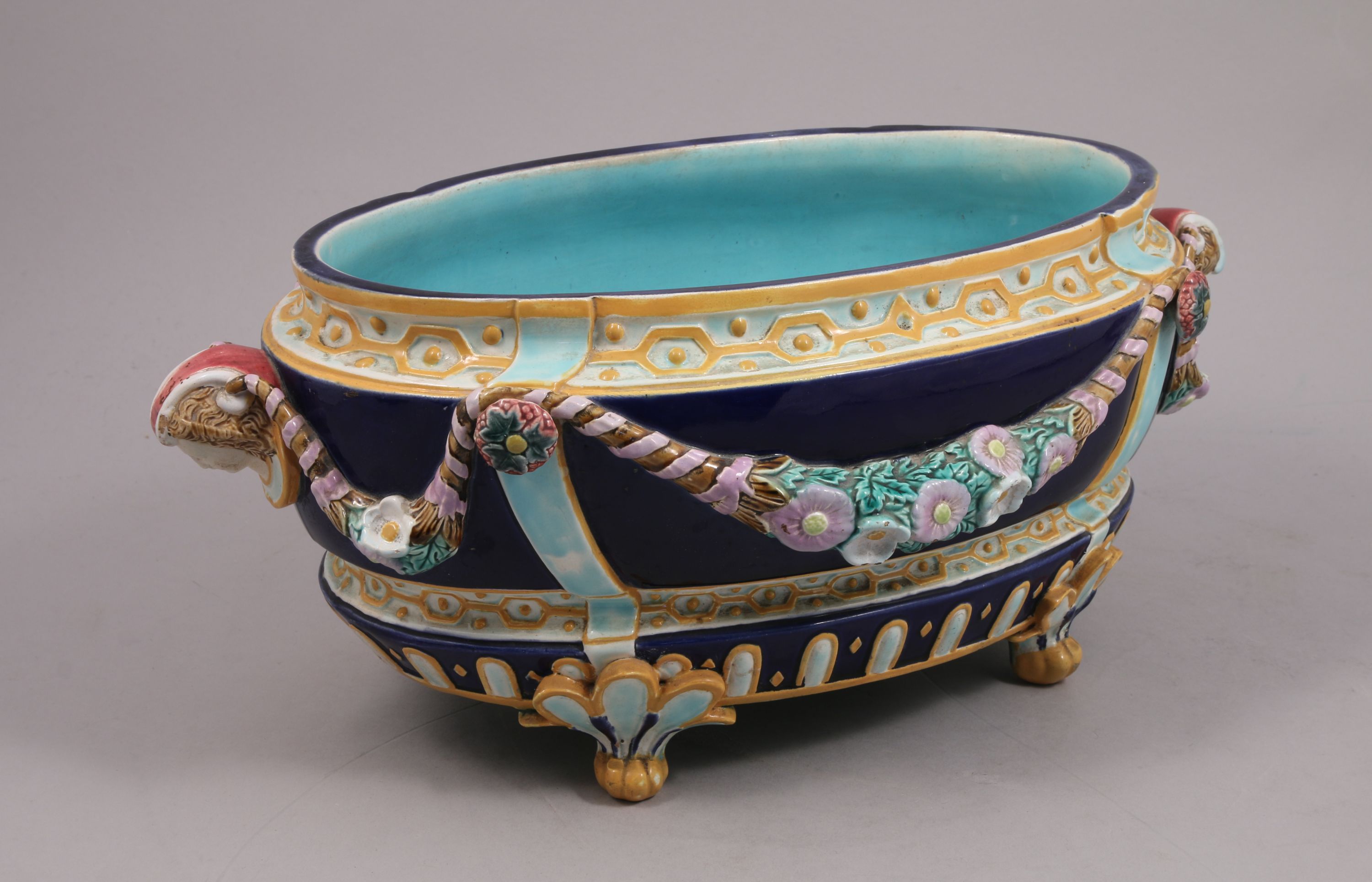 JARDINIÈRE de forme oblongue en barbotine polychrome.