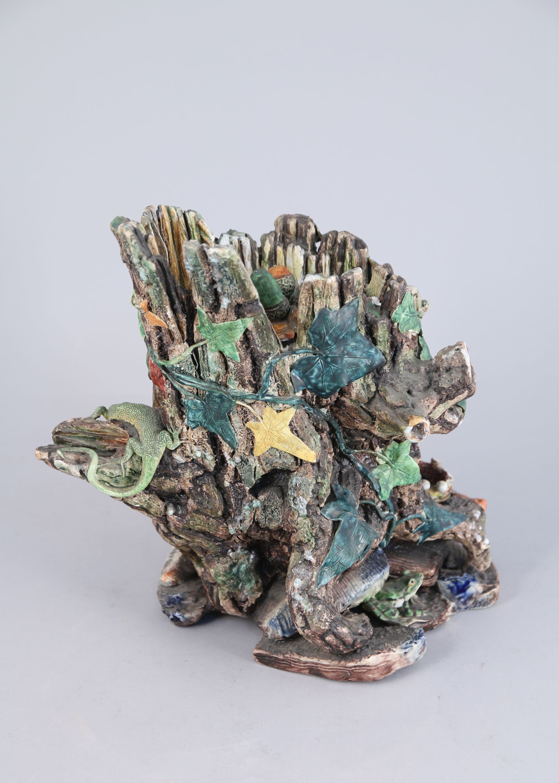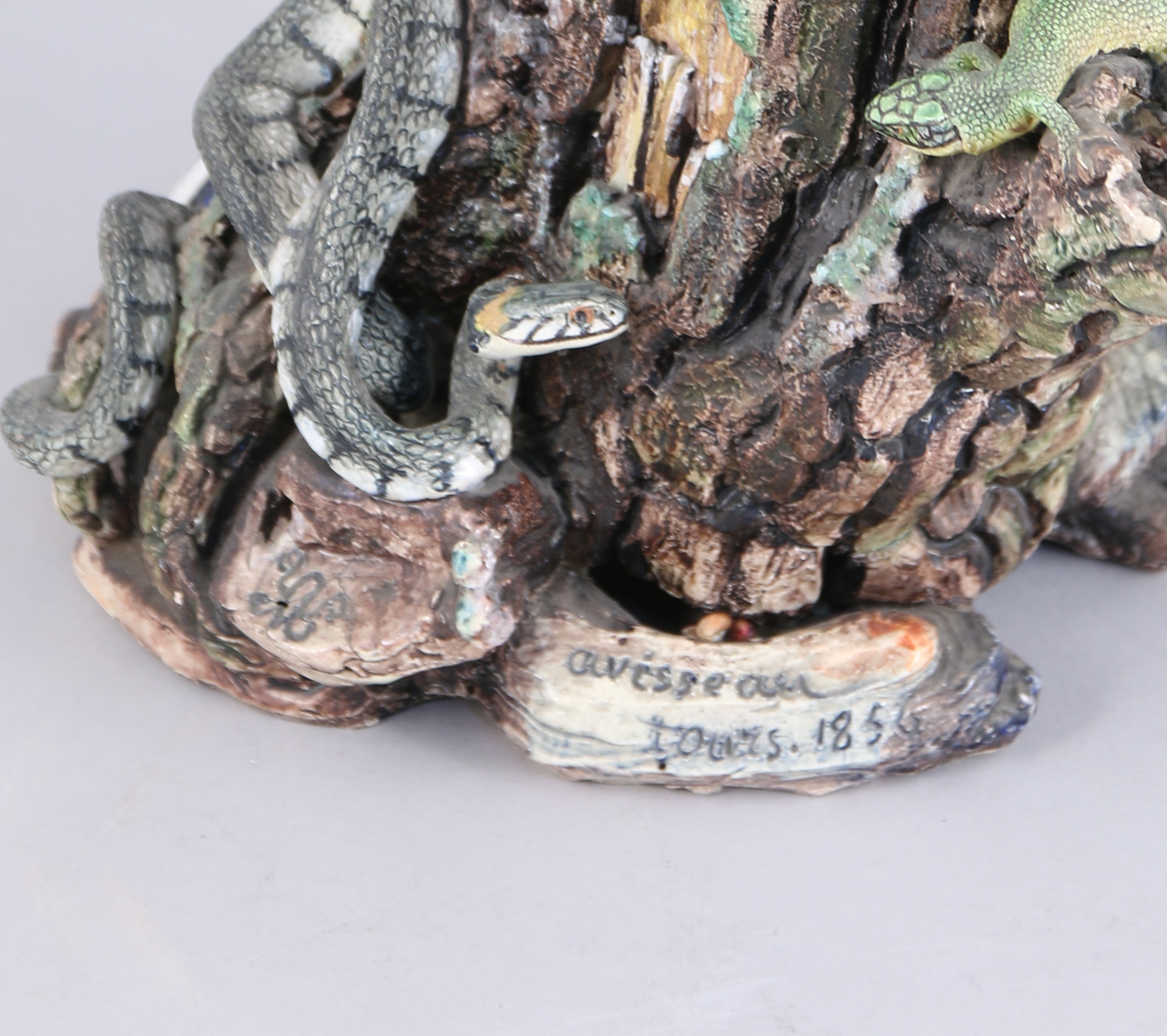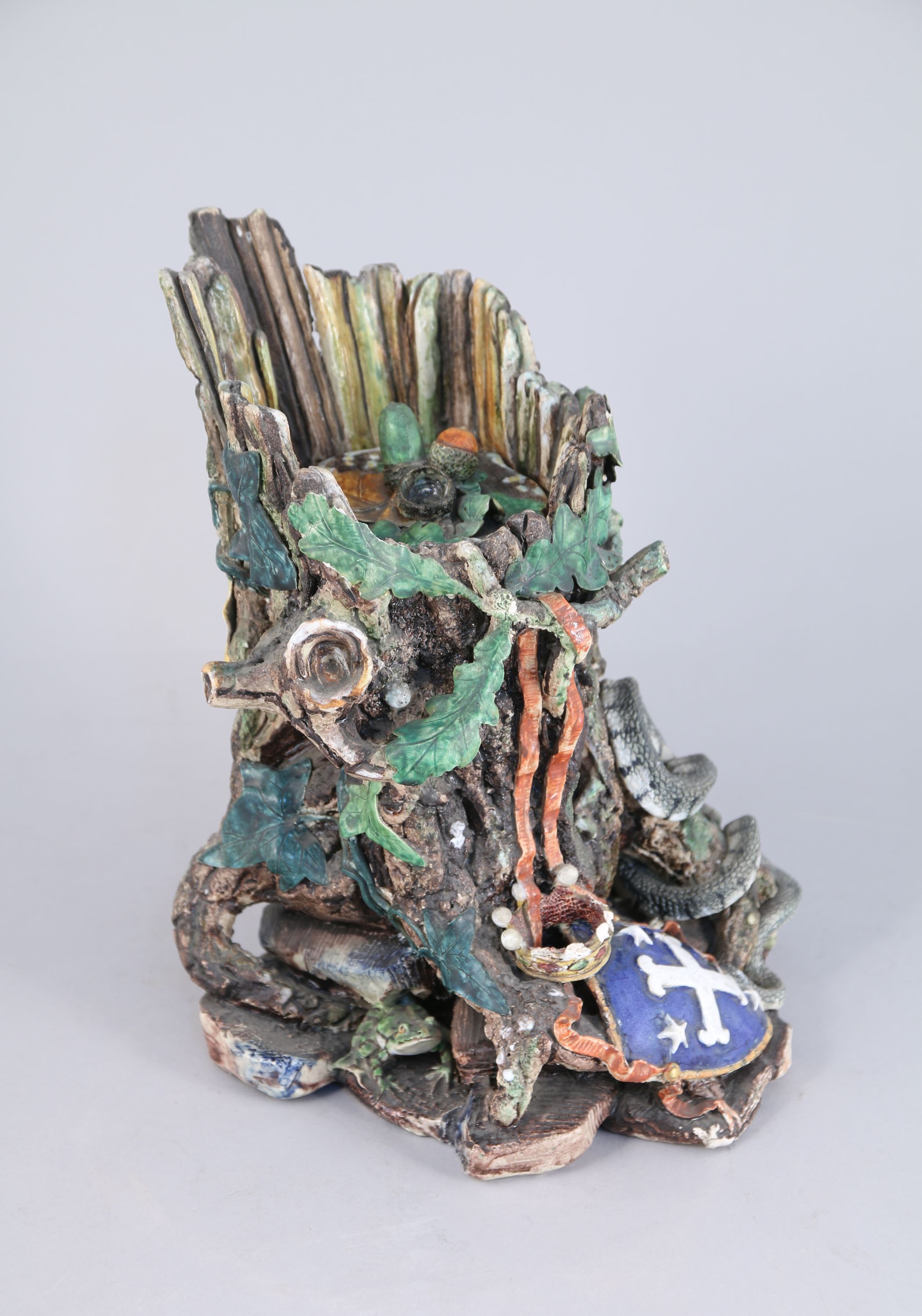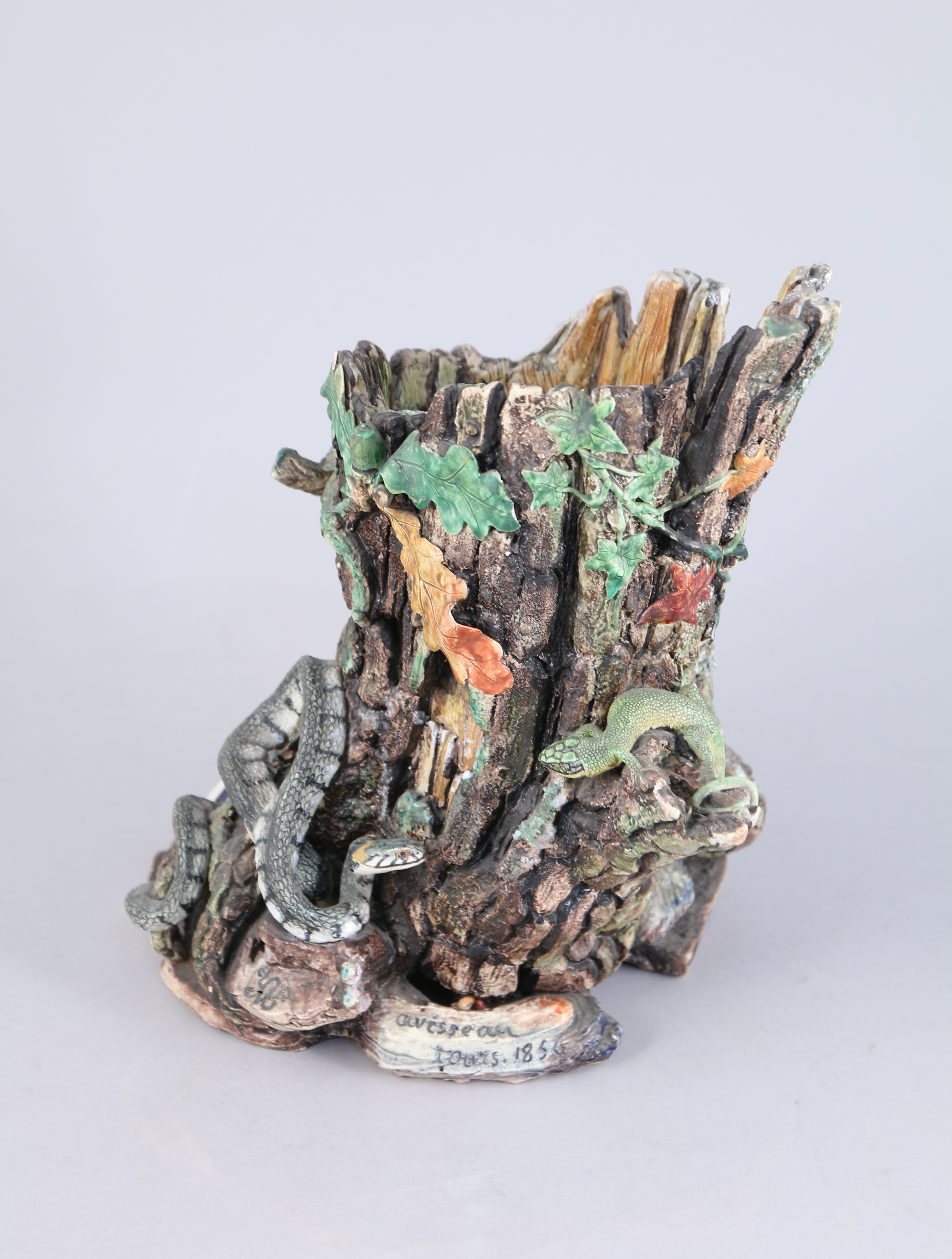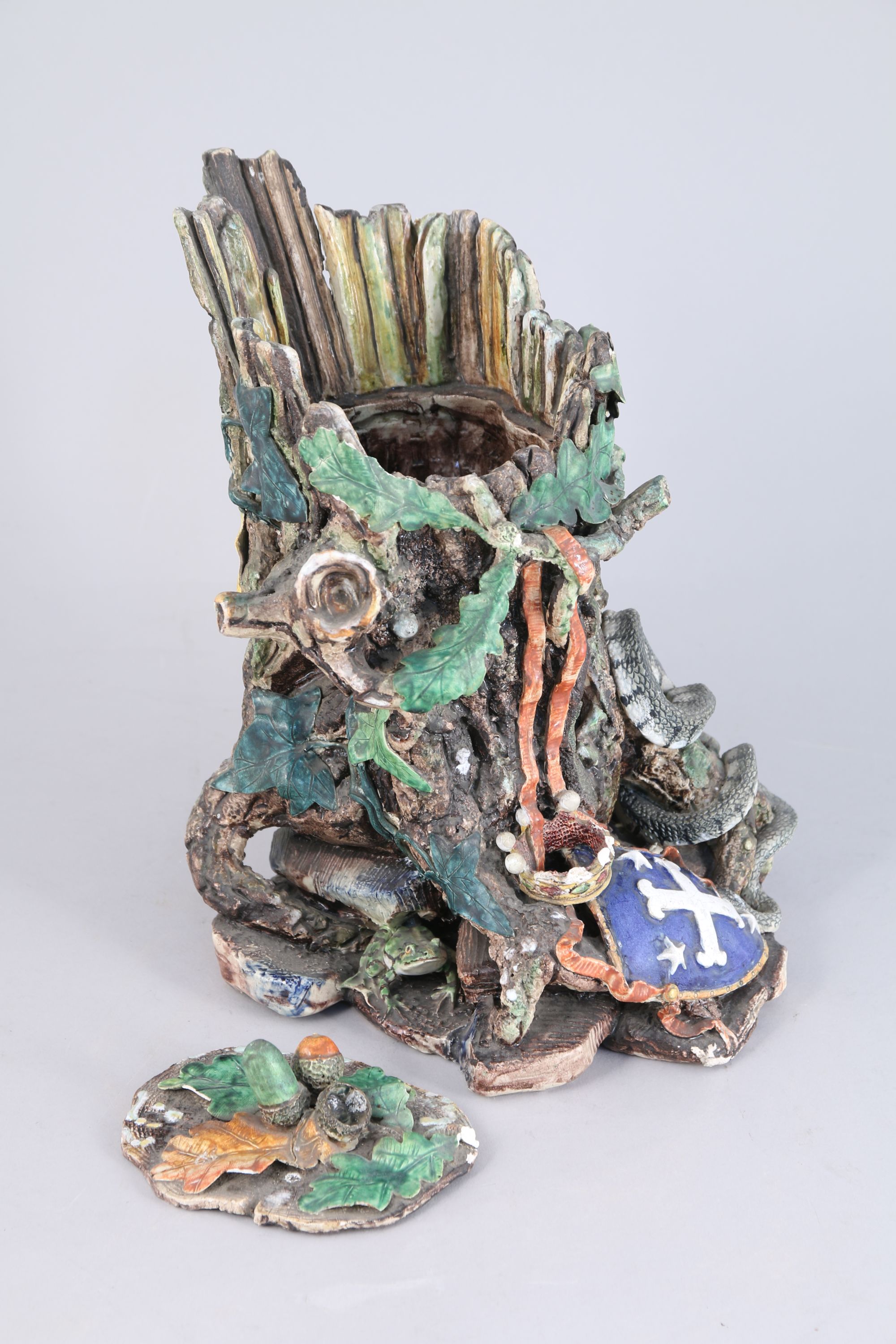 Charles-Jean AVISSEAU. POT-À-TABAC en faïence émaillée polychrome au naturel figurant une souche. Elle est appliquée de "rustiques figulines": couleuvre, lézard et grenouille, ainsi que d'armoiries (d'azur, à la croix ancrée d'argent, accompagnée de 3 étoiles du mesme, 2 et 1) timbrées d'une couronne comtale. Le fretel est composé de glands sur une terrasse feuillagée.