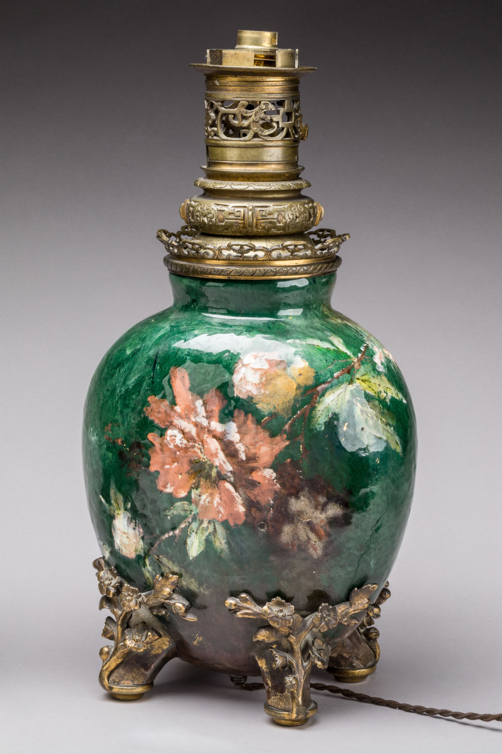 Décor de fleurs de cerisier sur un fond vert, en forme de gourde reposant sur quatre petits pieds. Spectaculaire MONTURE en bronze à motifs de branches fleuries de cerisier enveloppant chacun des pieds. Le col monté pour un éclairage à l'huile avec des cuivres gravés de fleurs de cerisiers et à motifs de chinoiseries.