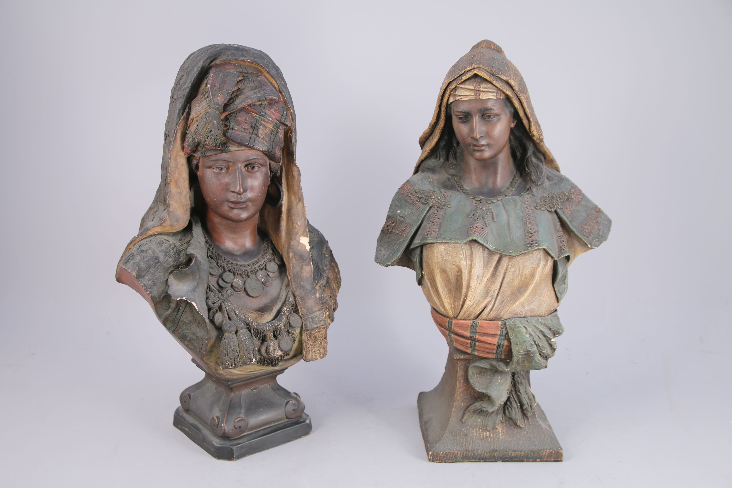 Deux plâtres patinés polychrome sur piédouche. L'un numéroté "512 / 41" et l'autre "527 / 33" avec une plaque "F.Golscheider / Repoduction réservée".