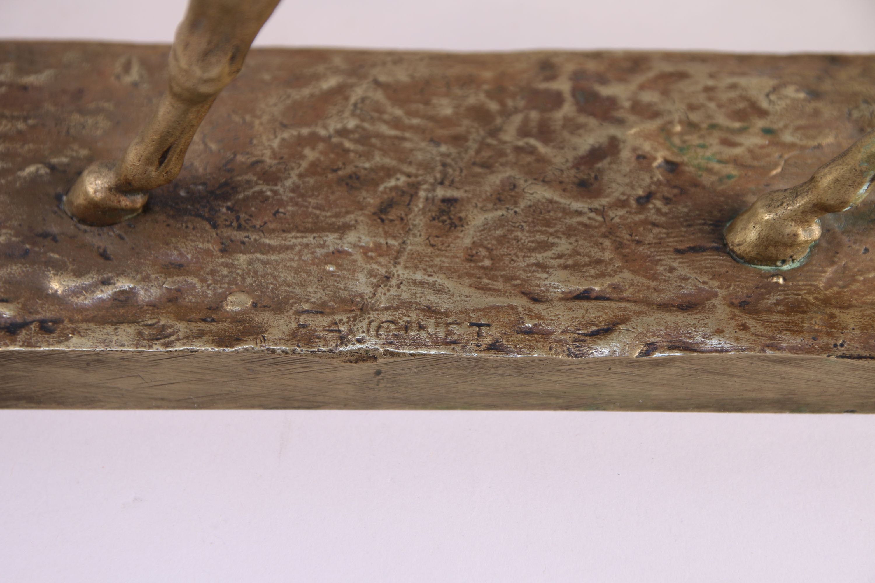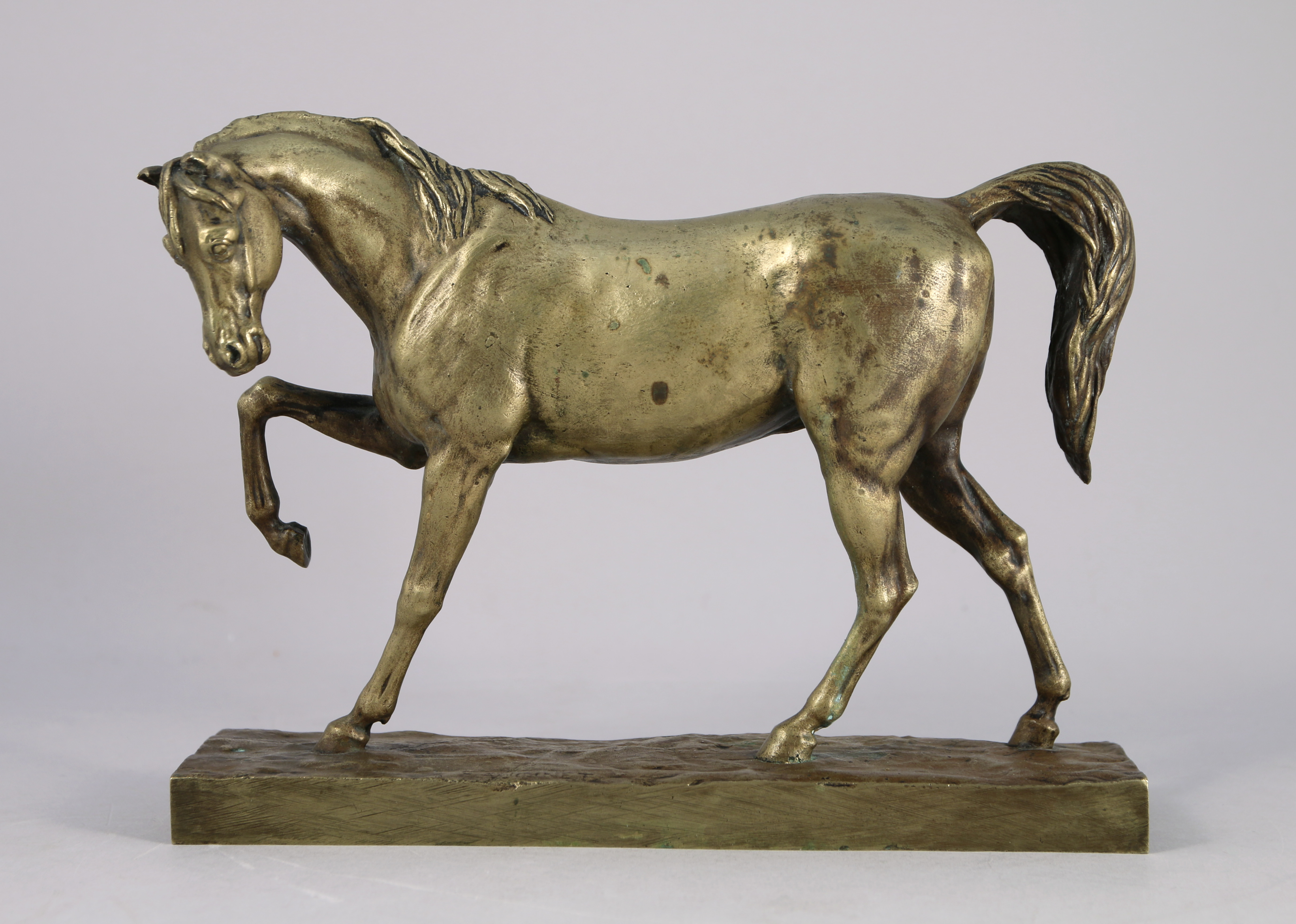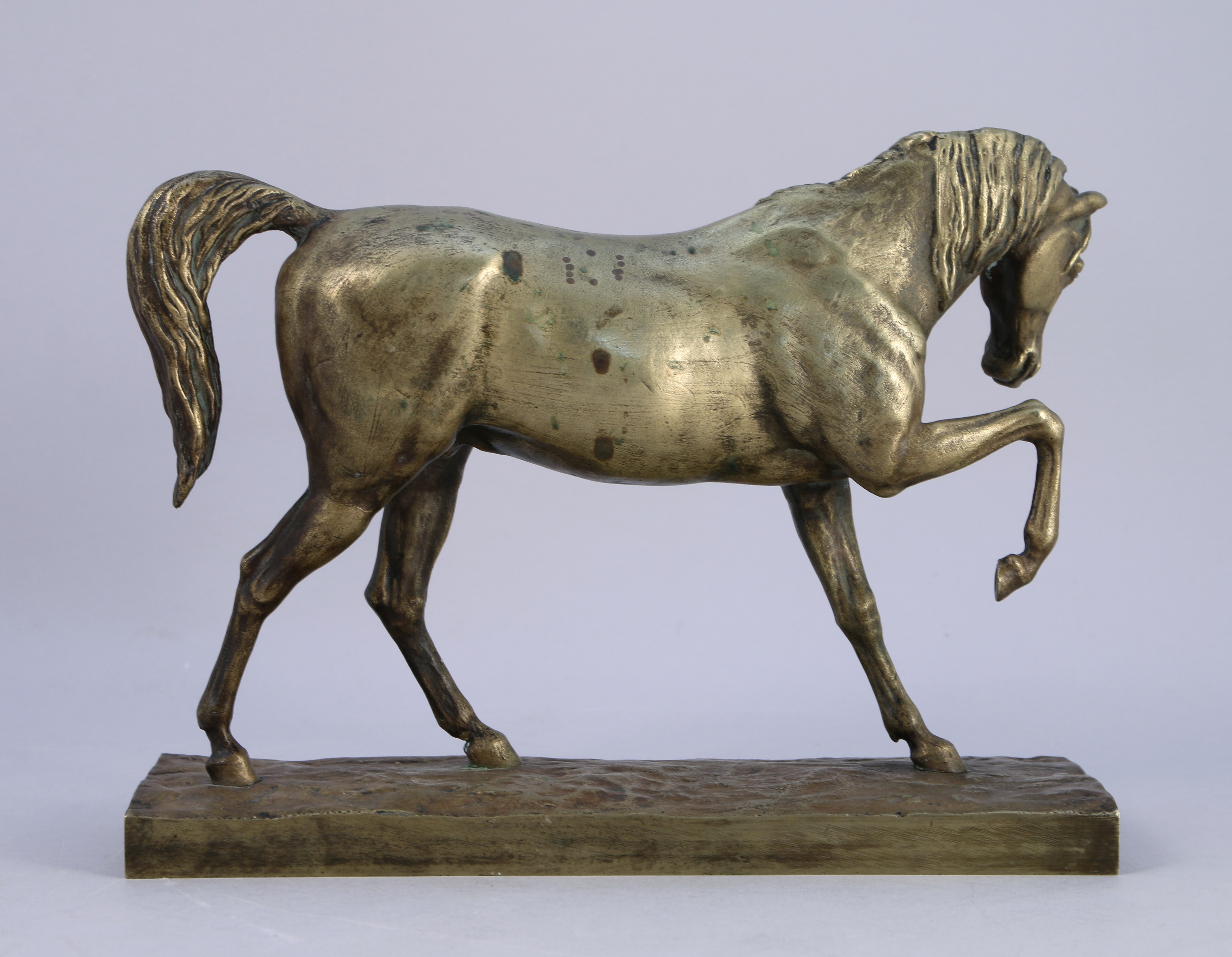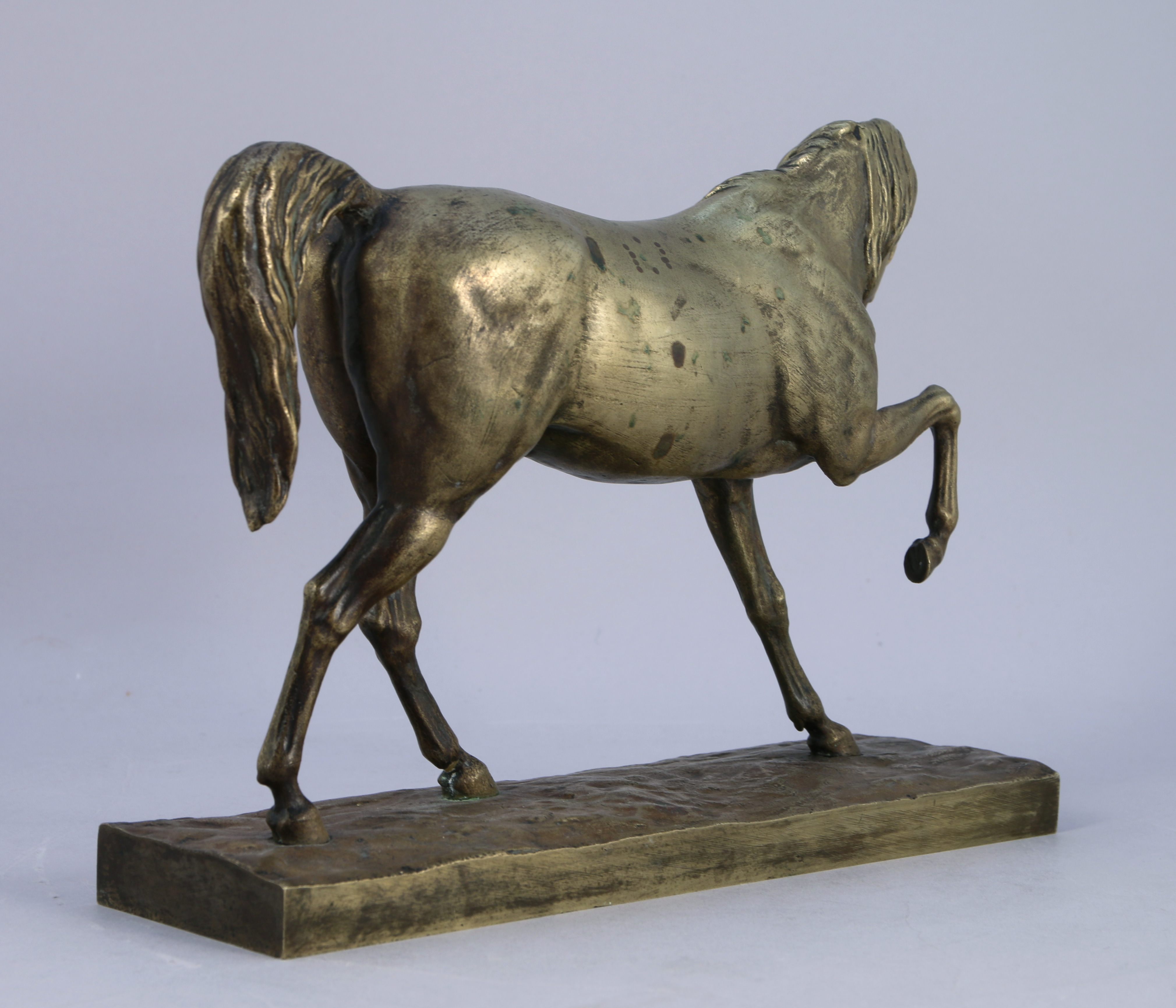 - Étienne Maurice FALCONET (1716-1791), d'après. Étalon. Bronze. Porte une signature sur la terrasse. Haut. 19, Long. 25,5 cm. (manque la patine).