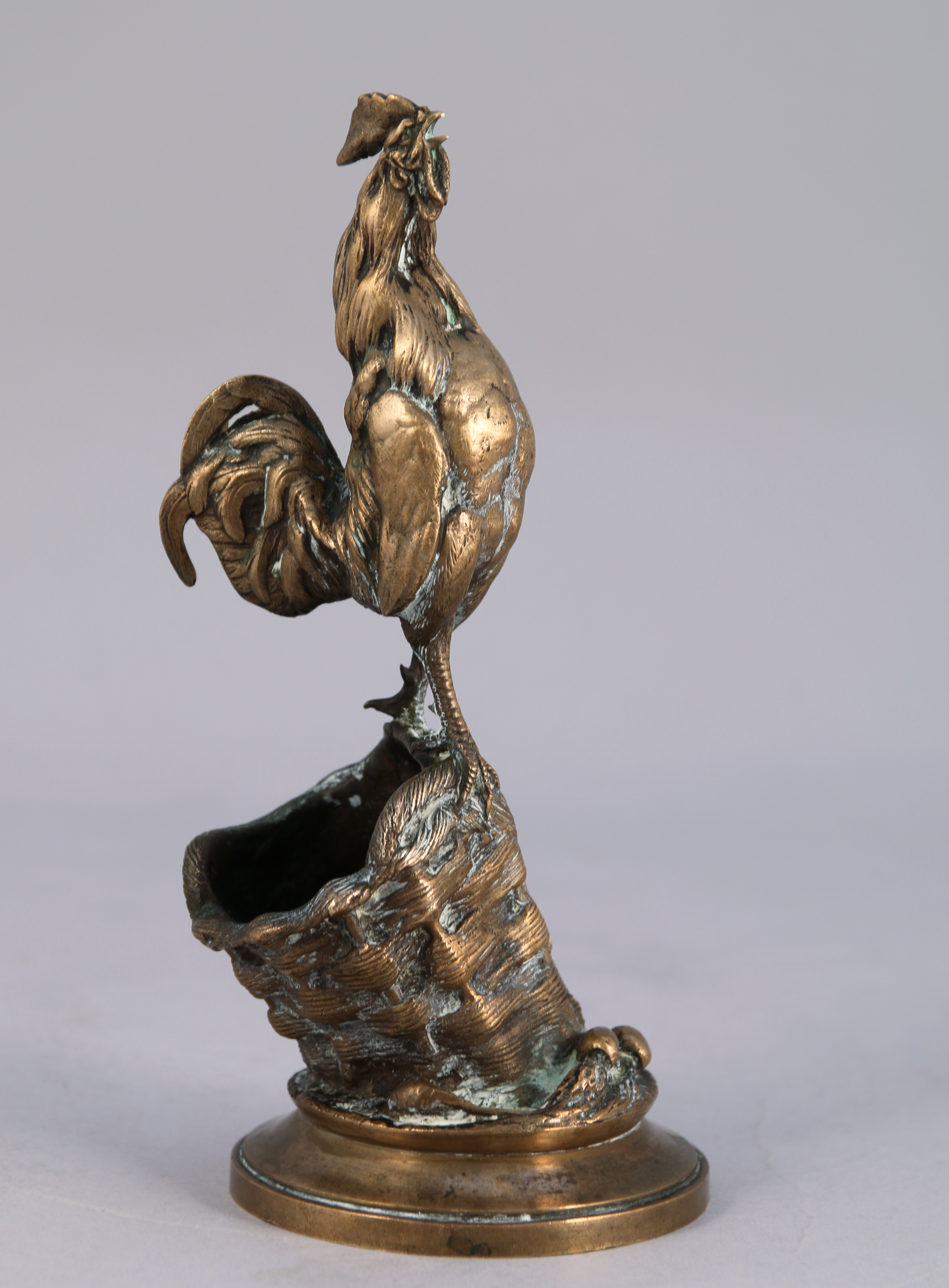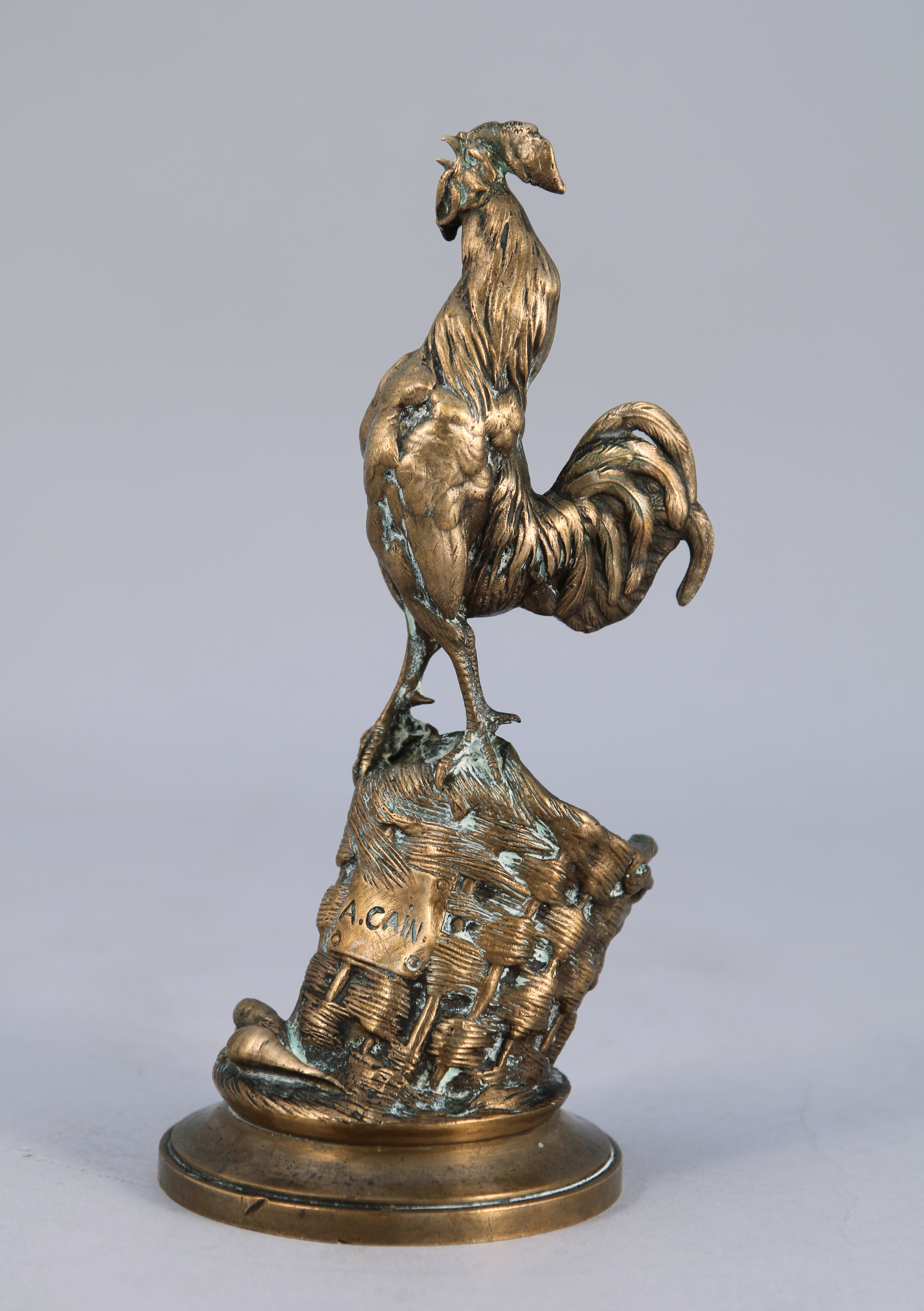 - Auguste Nicolas CAIN (1821-1894). Coq chantant sur un panier. Bronze. Haut. 17,5, Diam. 7,5 cm. (manque la patine)