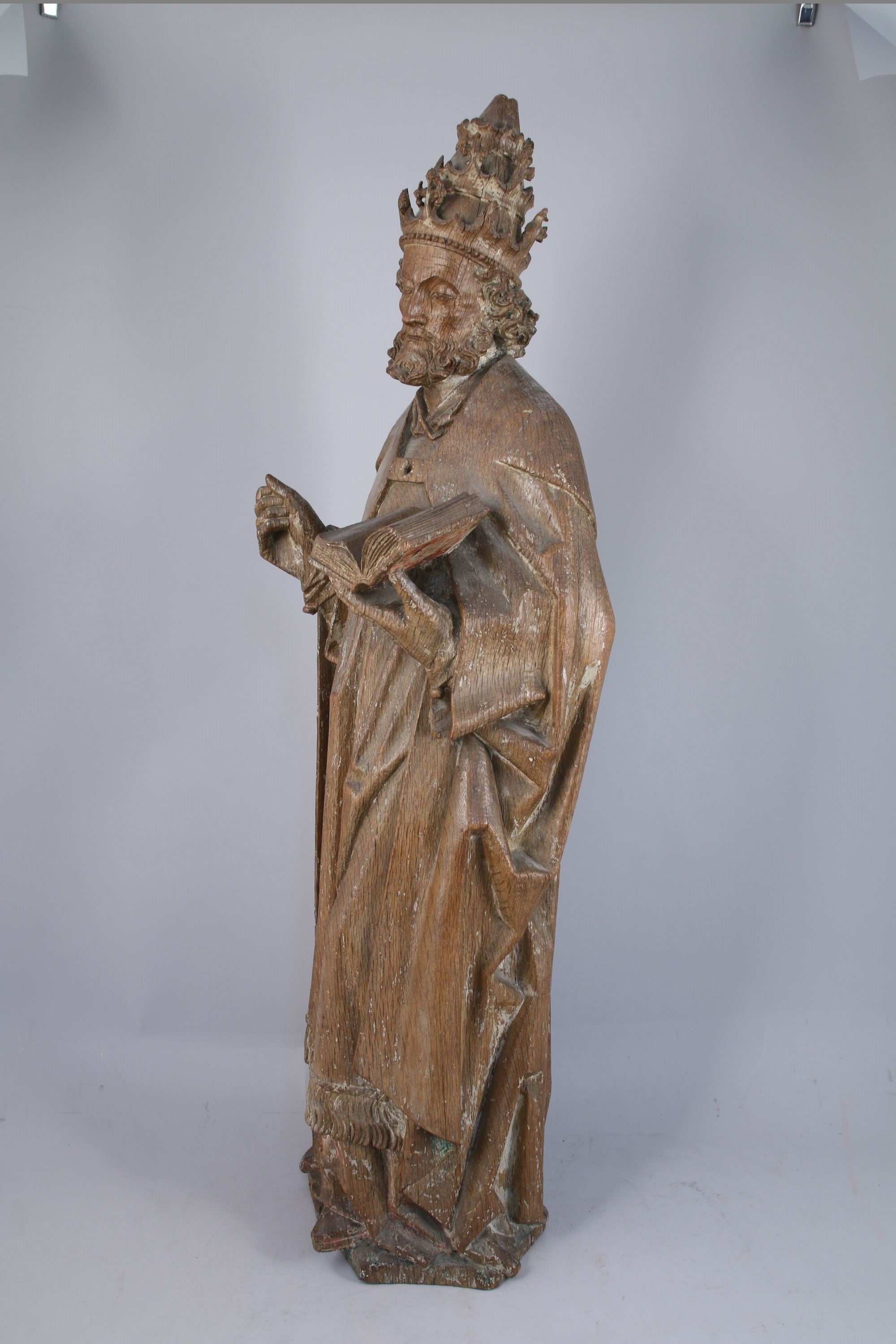 Statue en pied, saint personnage portant la tiare pontificale, tenant un livre dans la main gauche et attribut manquant dans la droite (peutêtre la férule?).