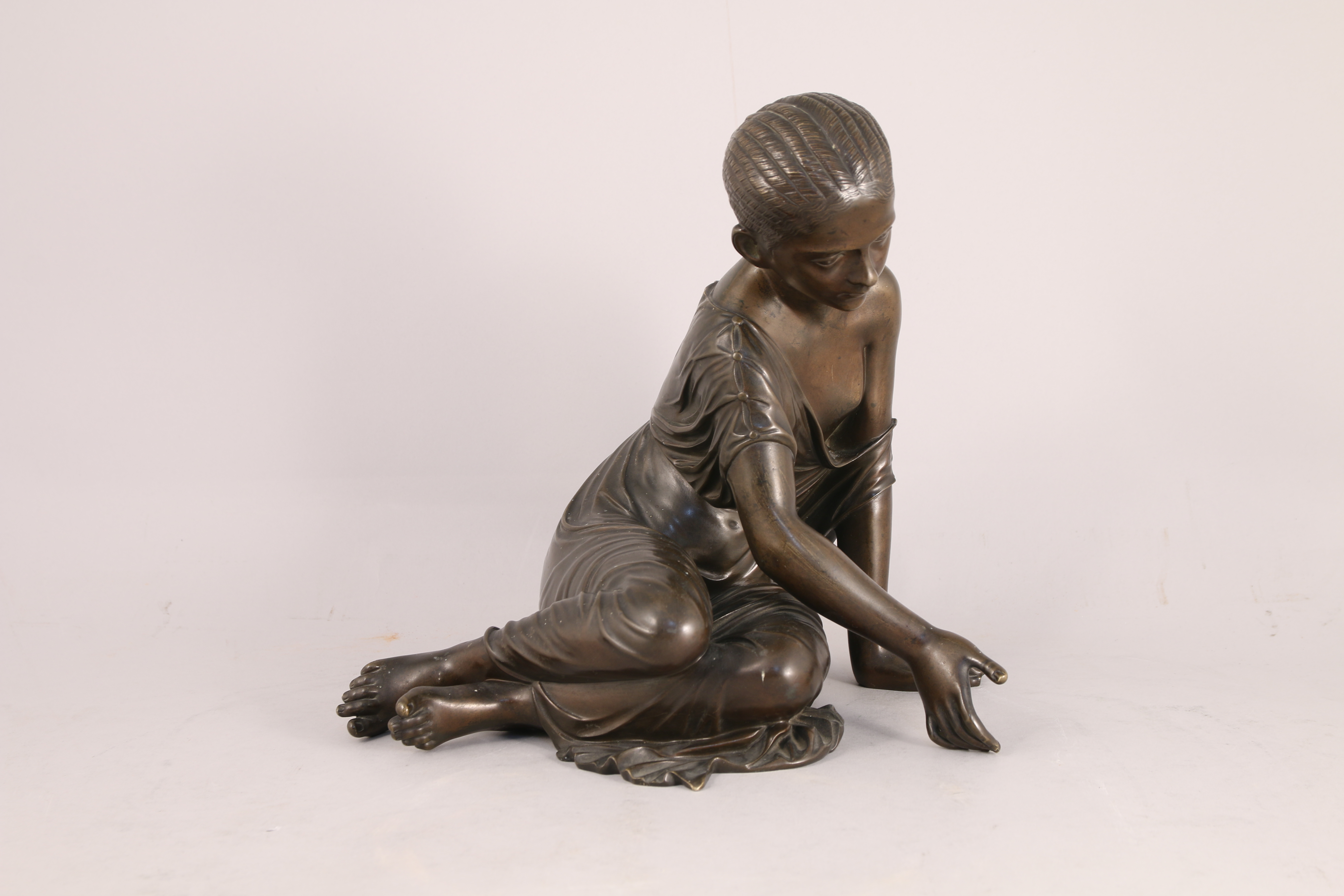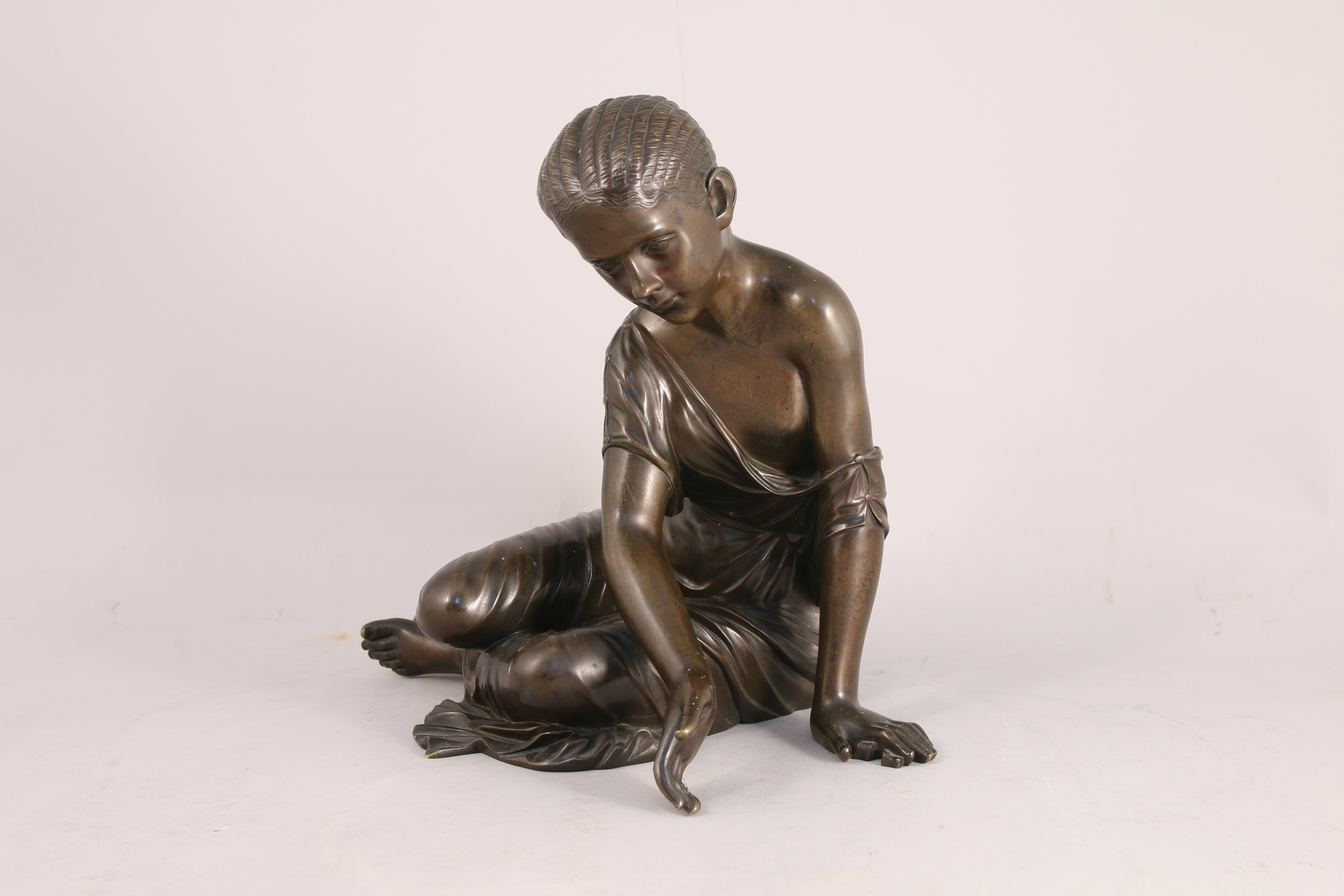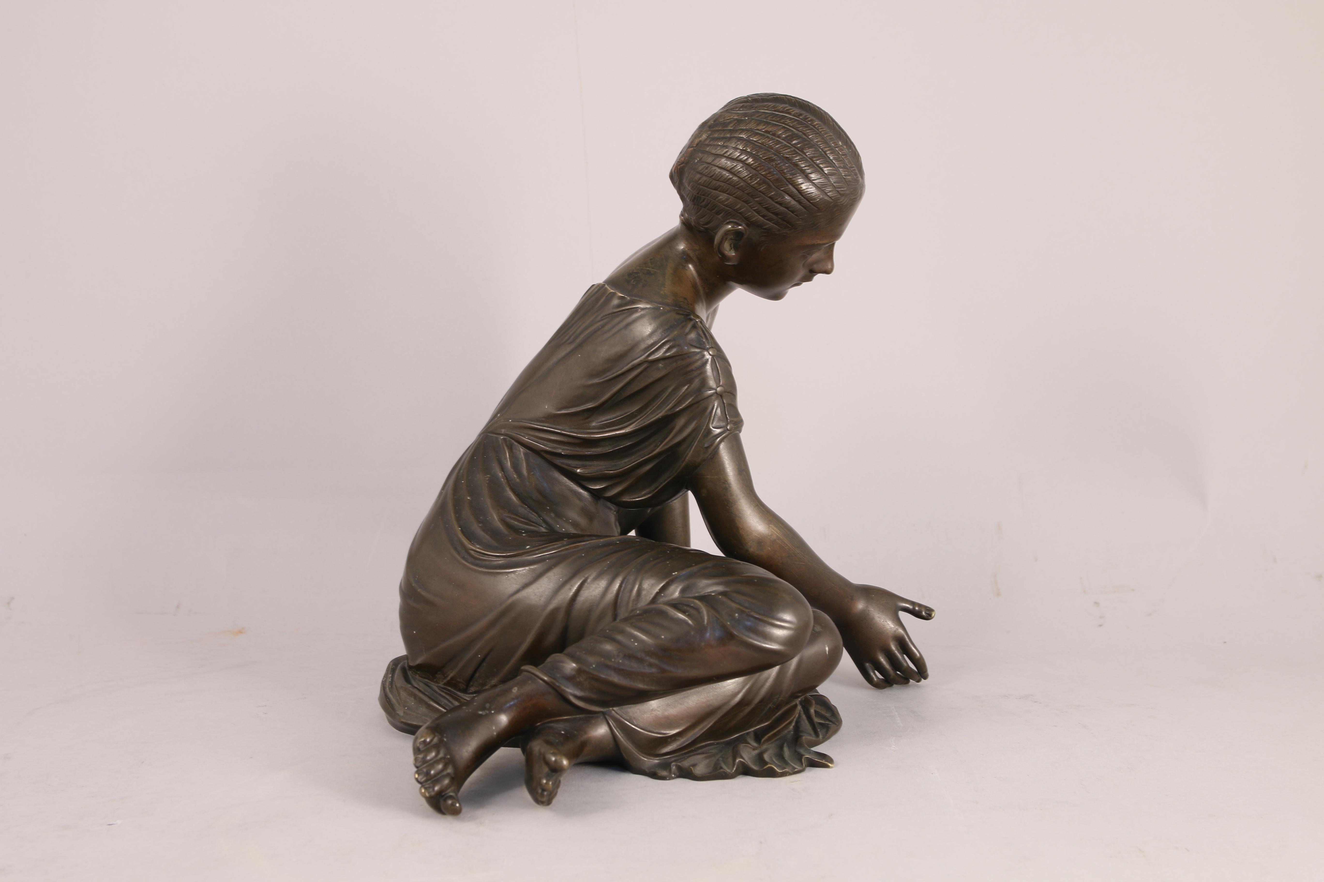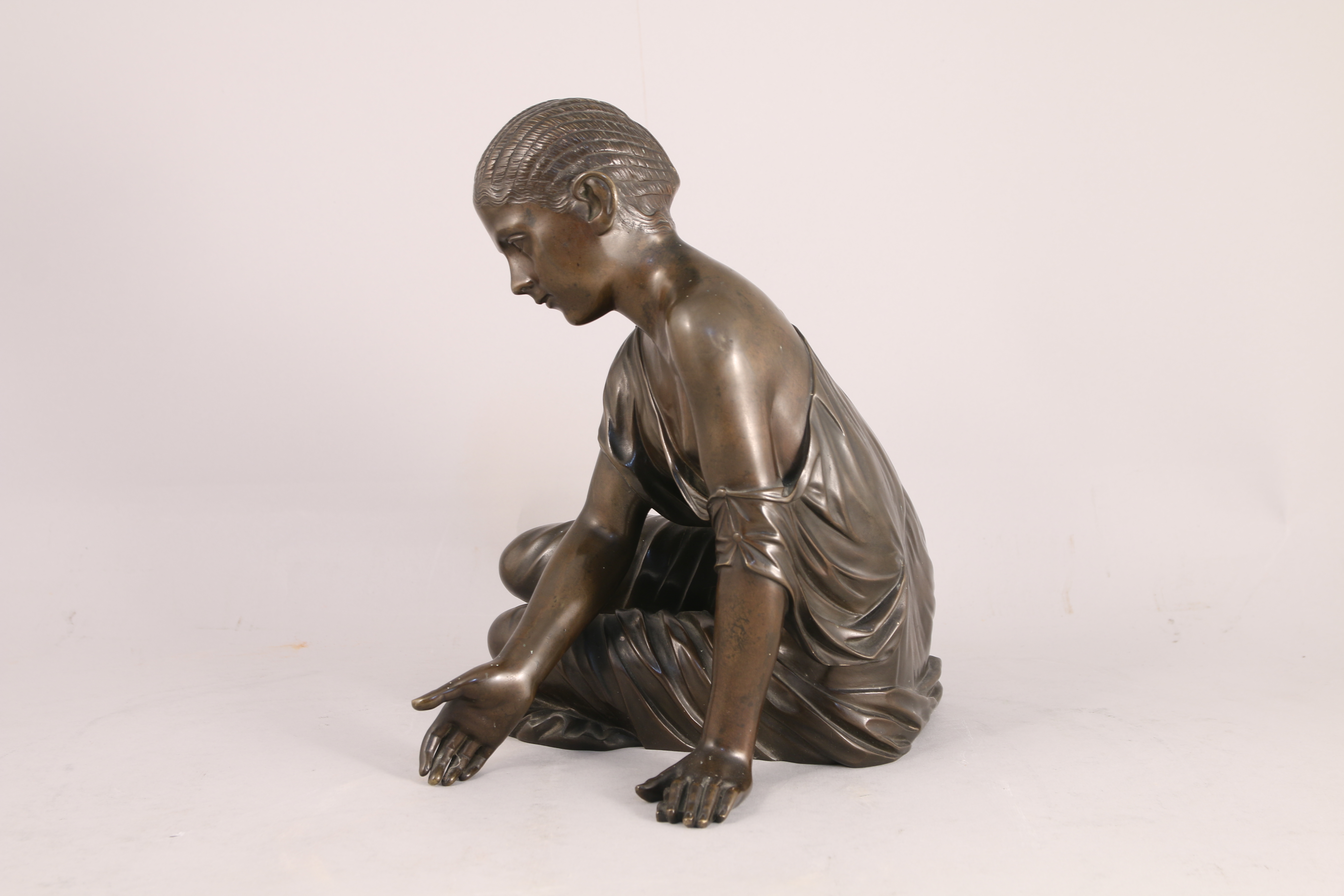 La célèbre sculpture en marbre figurant une jeune adolescente pompéienne jouant aux osselets conservée au musée de Pergame à Berlin a suscité de nombreuses interprétations, notamment fondues en bronze par Barbedienne au XIXème siècle. Notre épreuve est traditionnellement attribuée au sculpteur James Pradier, bien que non signée.
