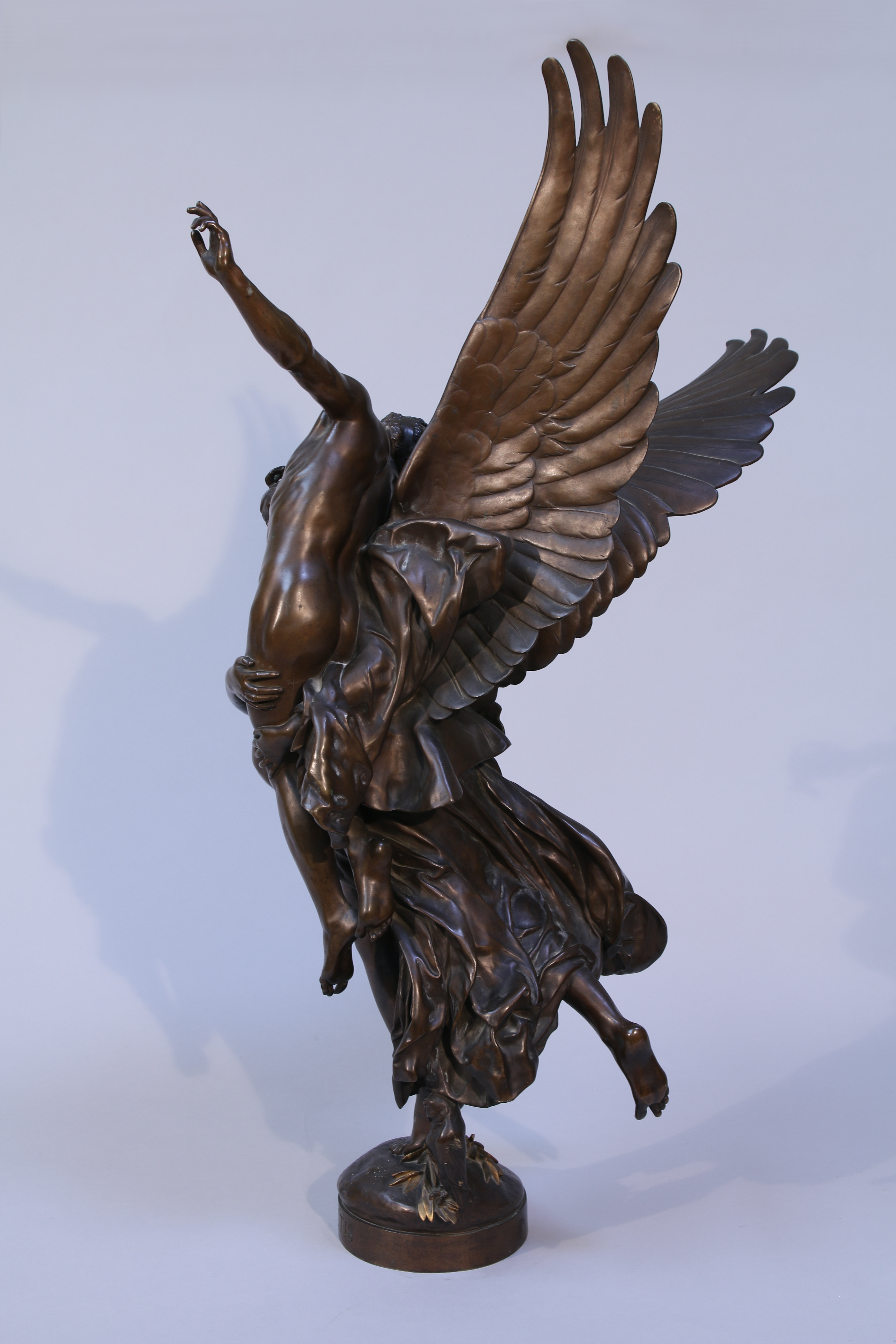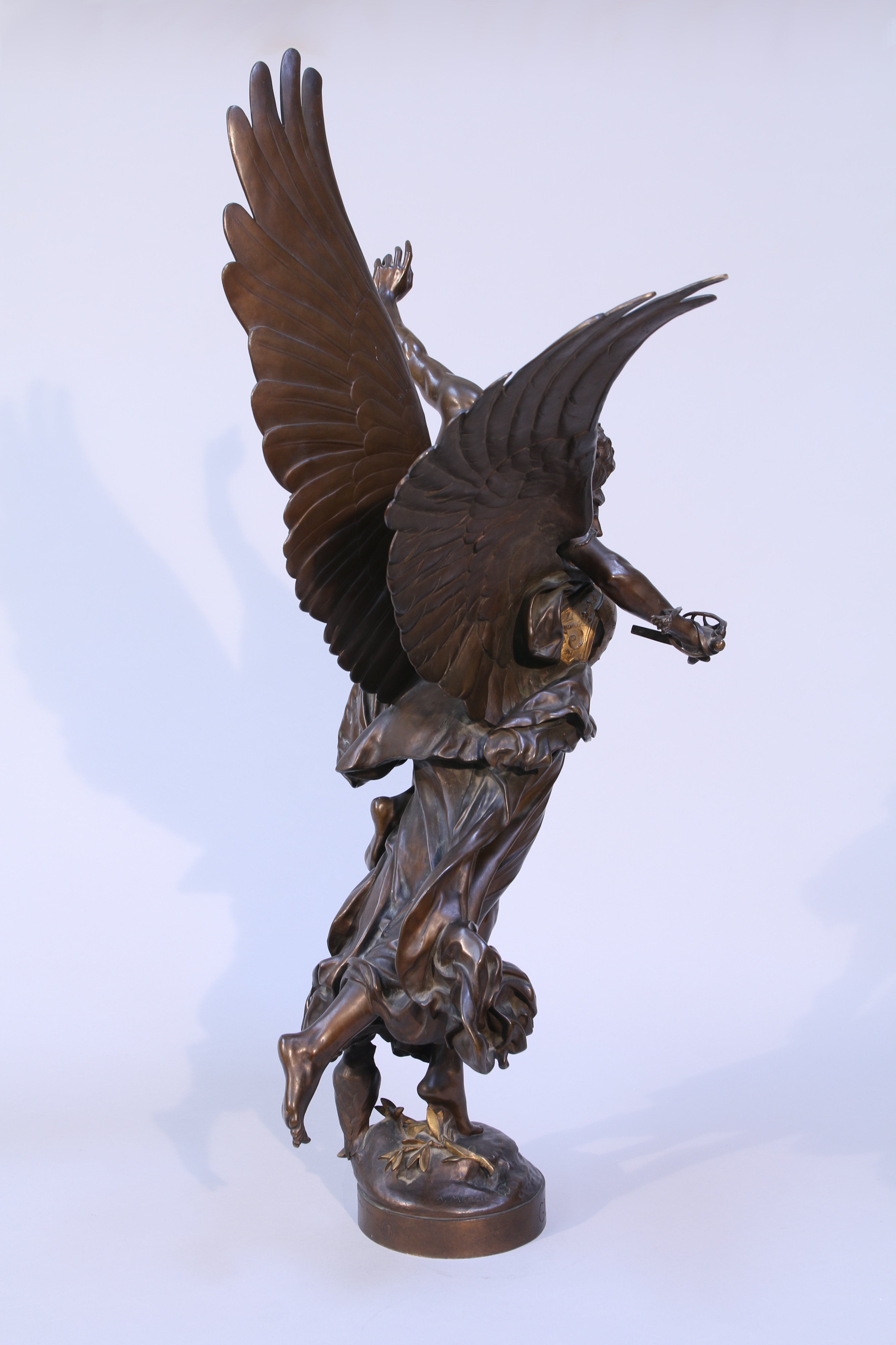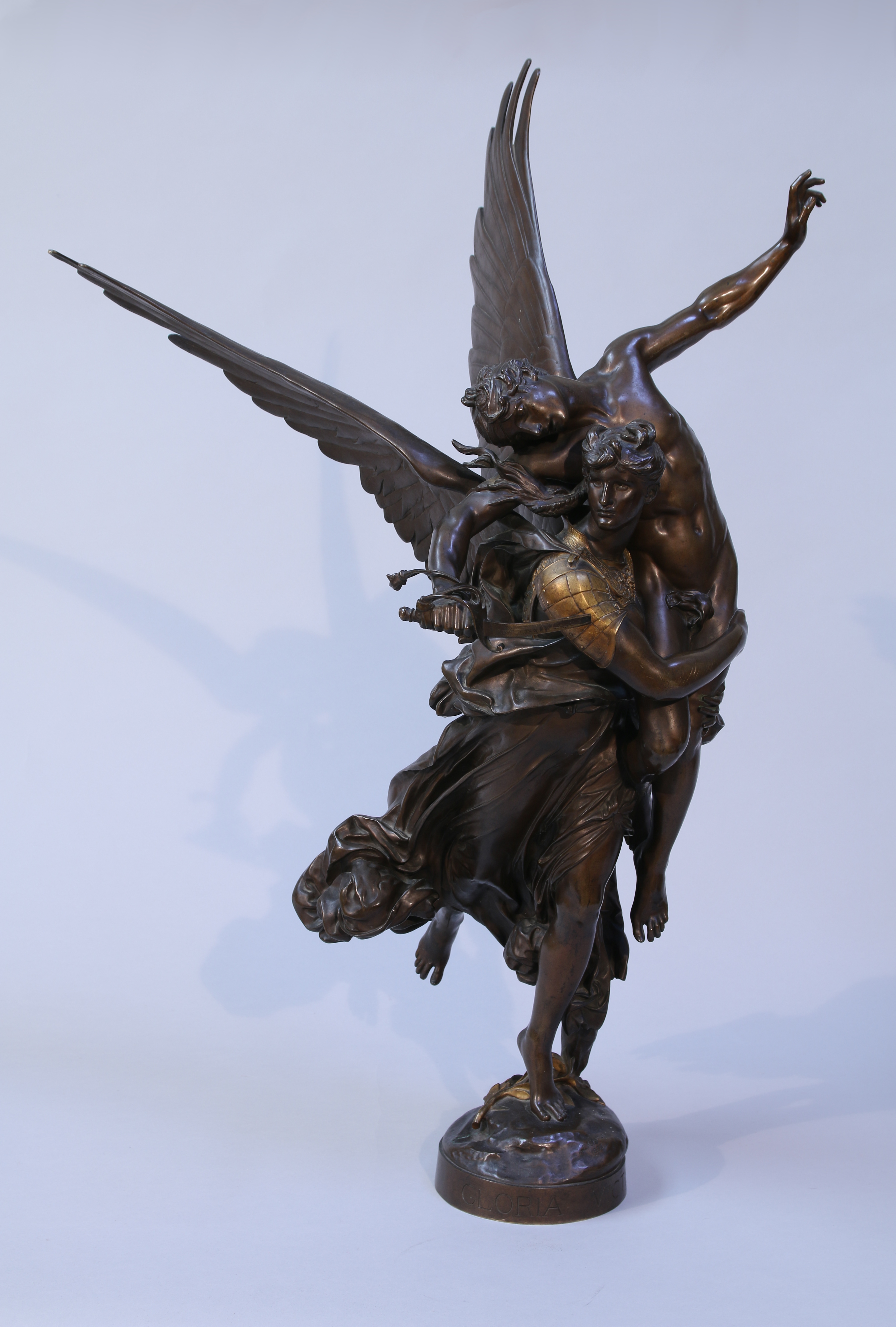 La très belle patine de notre bronze, avec la cuirasse dorée de la victoire ailée, renforce le caractère héroïque du groupe créé par Antonin Mercié lors de son séjour à la villa Médicis en 1871. Après la défaite de 1870, il s'agit de rendre glorieux un épisode tragique en détournant la maxime du chef gaulois Brennus qui avait vaincu Rome. Ce groupe connu un immense succès, le plâtre est acheté par la ville de Paris, qui en tira un bronze monumental exposé au musée du petit Palais. Barbedienne coula, lui, cette remarquable épreuve.