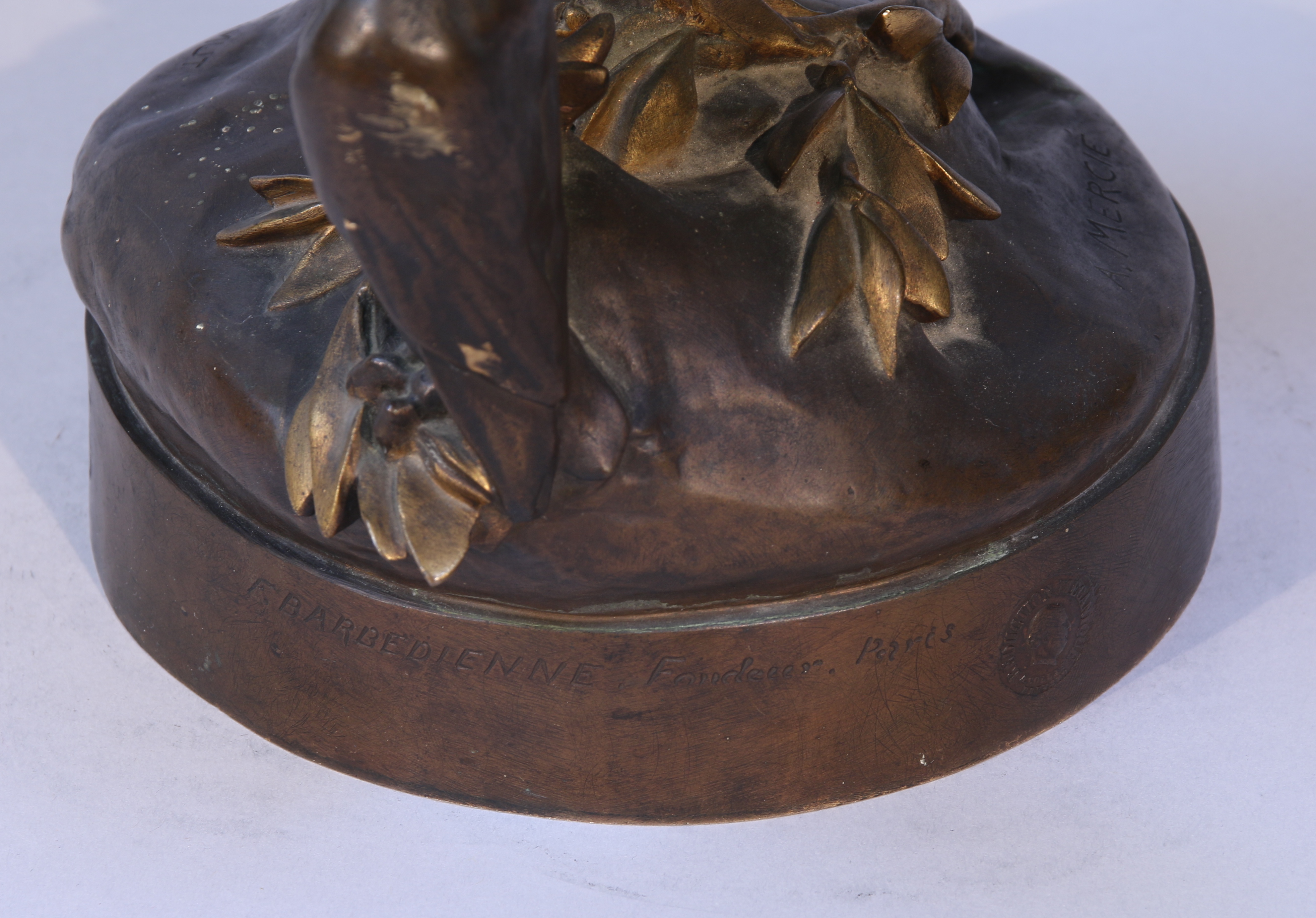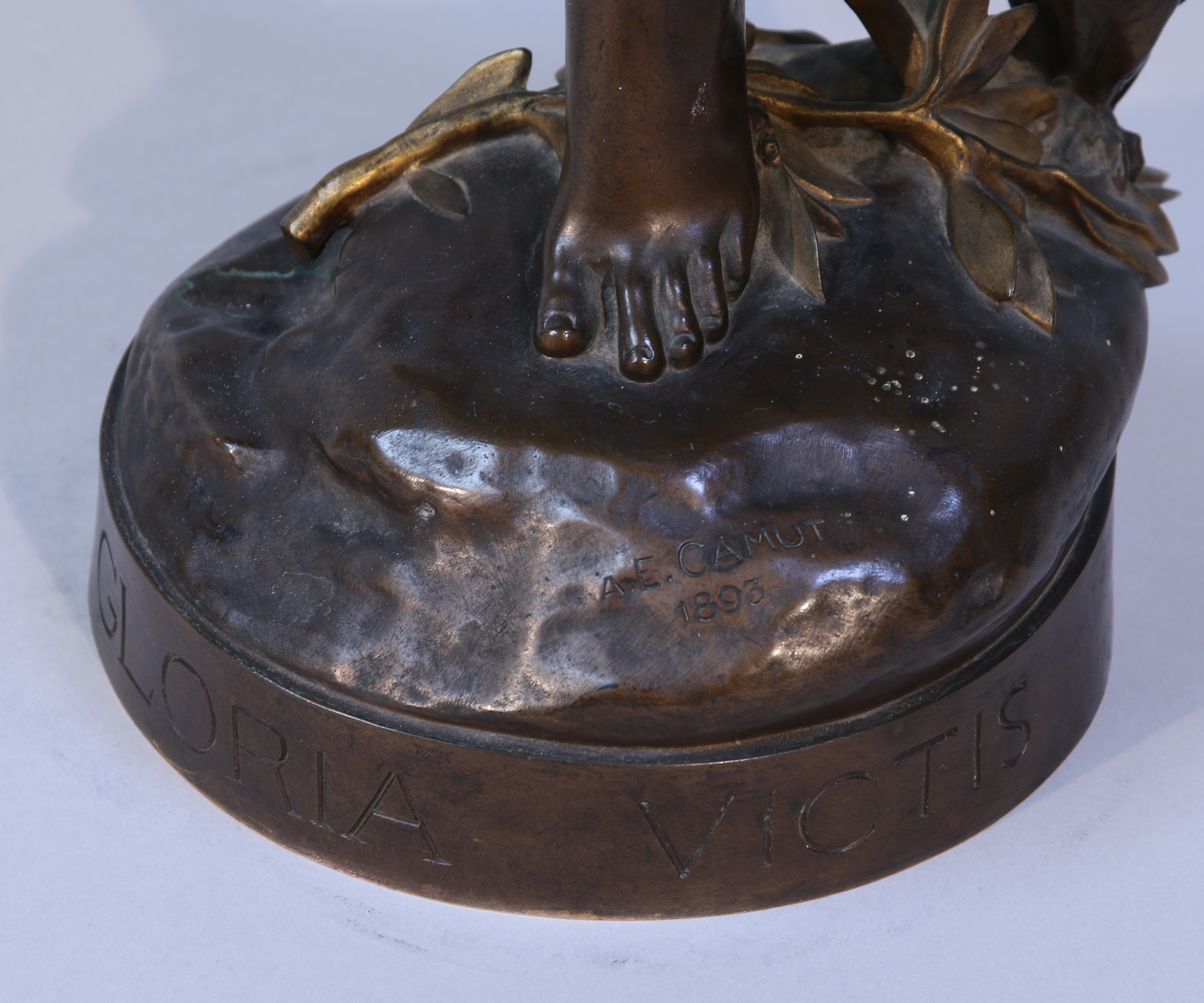 Bronze à double patiné brune et mordorée, signé "A.MERCIÉ" et inscris "A.E.CAMUT" avec la date "1893". Titré sur la base "Gloria Victis".