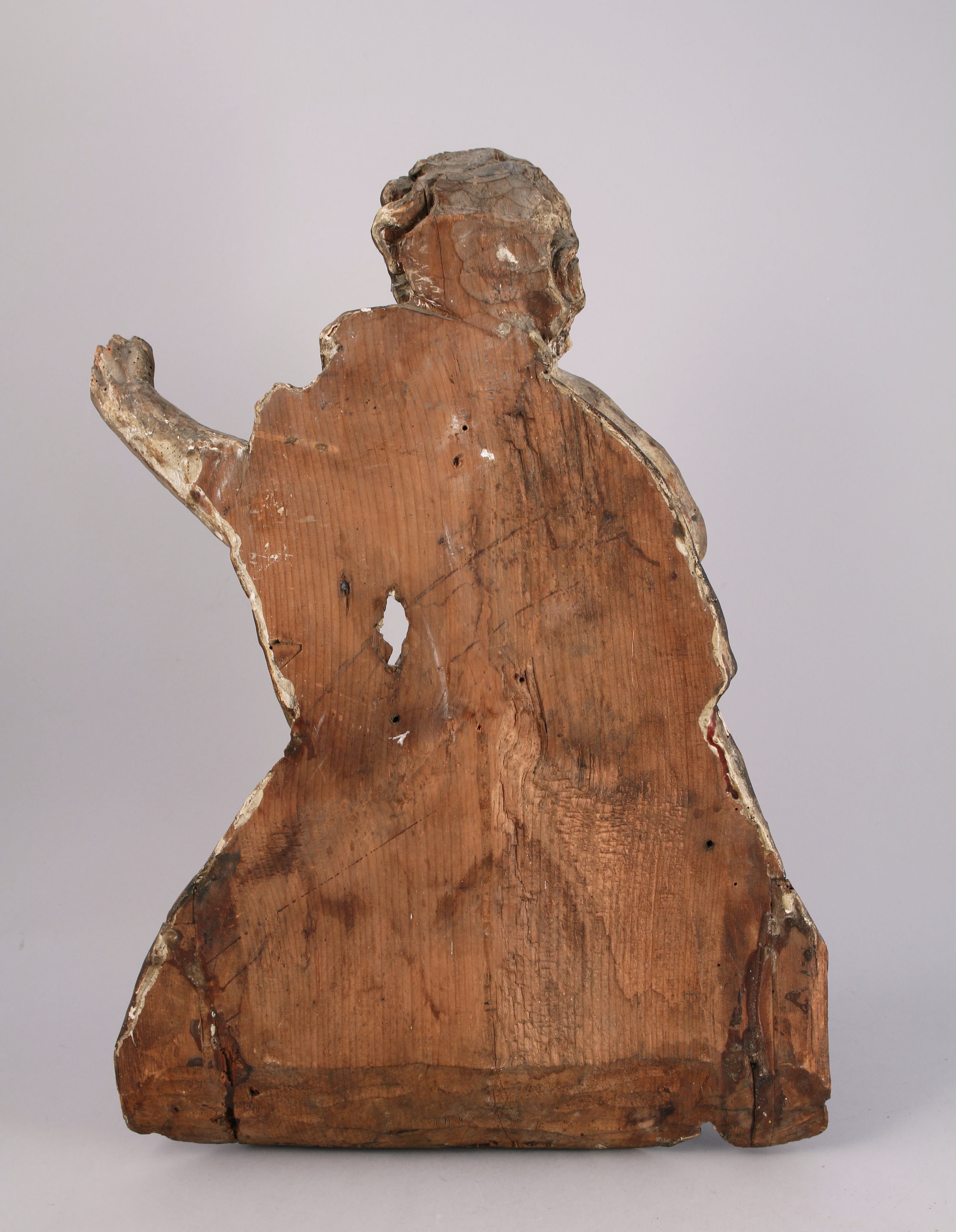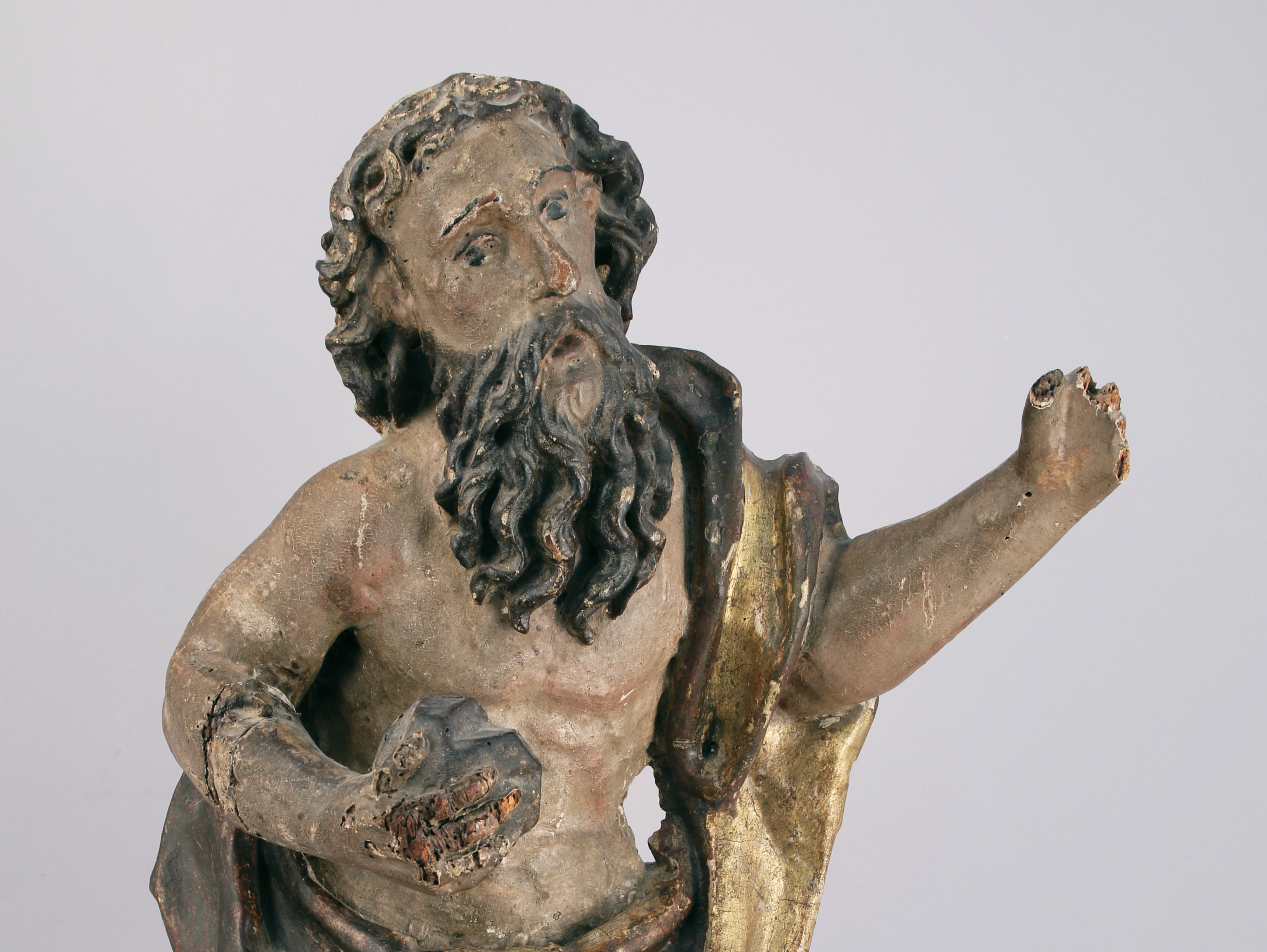 en résineux sculpté, stuqué, doré et peint. Il est représenté à genoux, tenant une pierre - symbole de son martyre - de la main droite et levant la main gauche vers le ciel.