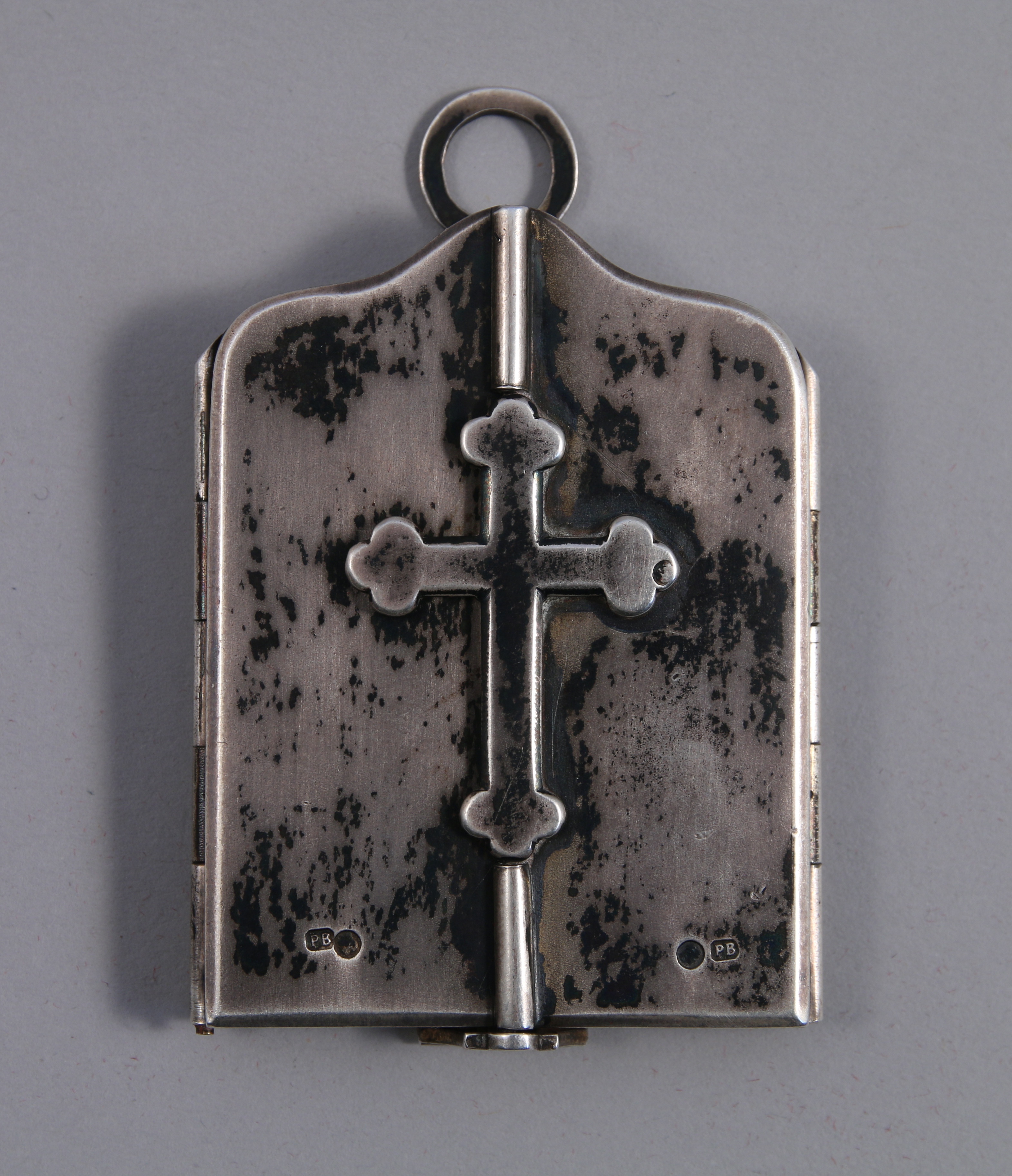 Au centre LA MÈRE DE DIEU DE KAZAN, volet de gauche l'ARCHANGE MICHEL, volet de droite SAINT NICOLAS. Le fermoir orné d'une croix tréflée.