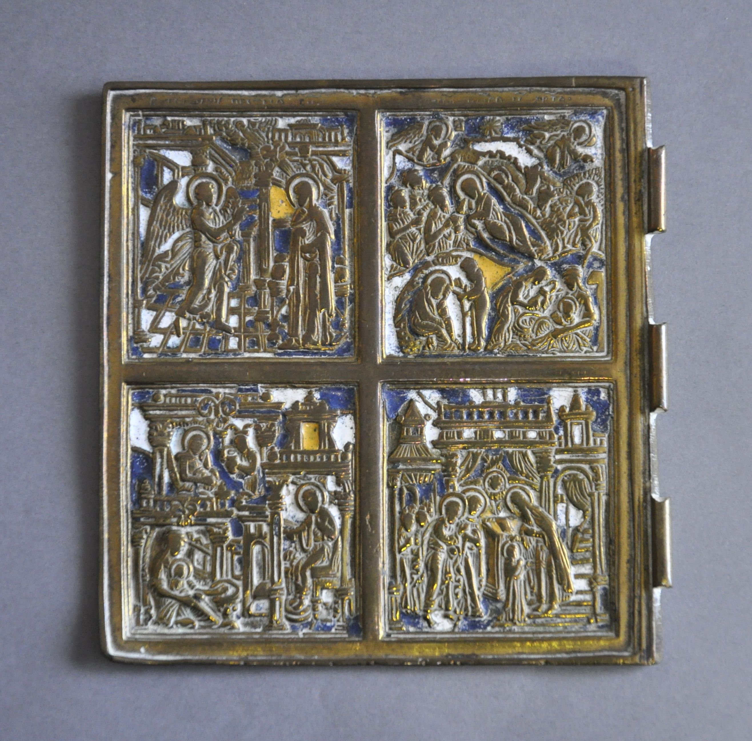 Laiton à fond émaillé jaune bleu et blanc représentant l'ANNONCIATION, LA NATIVITÉ, LA NAISSANCE de la Mère de dieu et LA PRÉSENTATION AU TEMPLE DE LA MÈRE DE DIEU