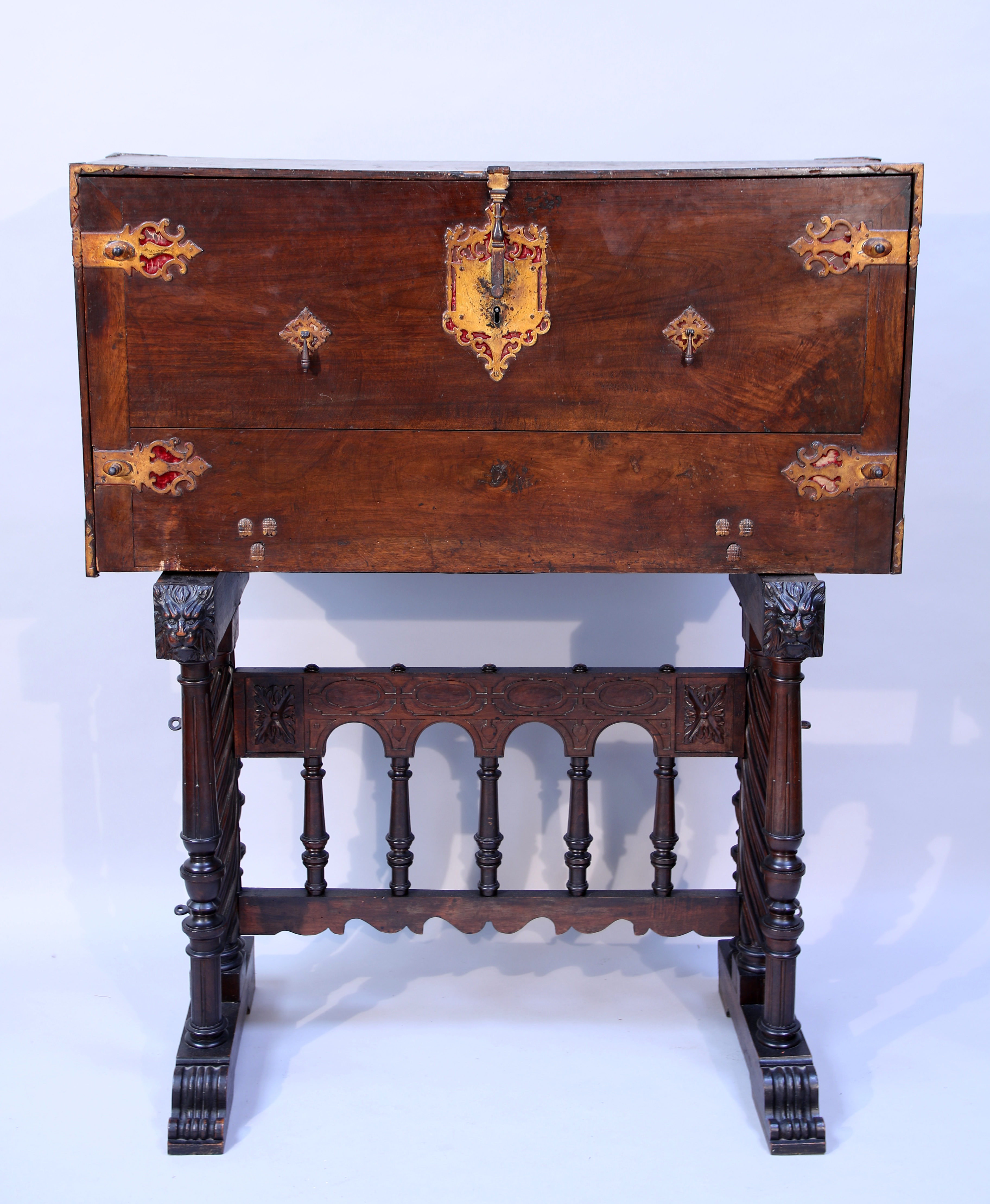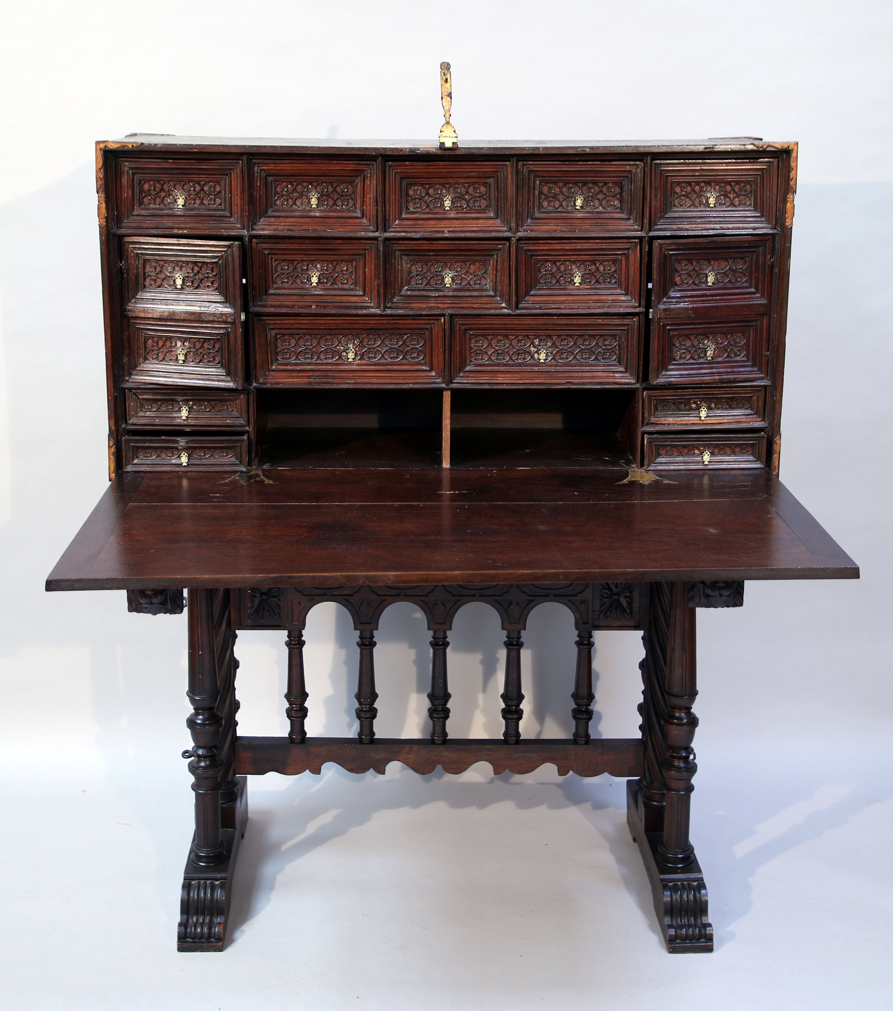 de forme rectangulaire en noyer. L'abattant est orné d'une serrure à moraillon, de quatre verrous, deux pendeloques, six coquilles Saint-Jacques en applique et deux poignées latérales. Il ouvre sur seize tiroirs et deux portes rectangulaires horizontaux dont deux manquant, au décor de fleurs inscrites dans des quadrilobes ajourés.