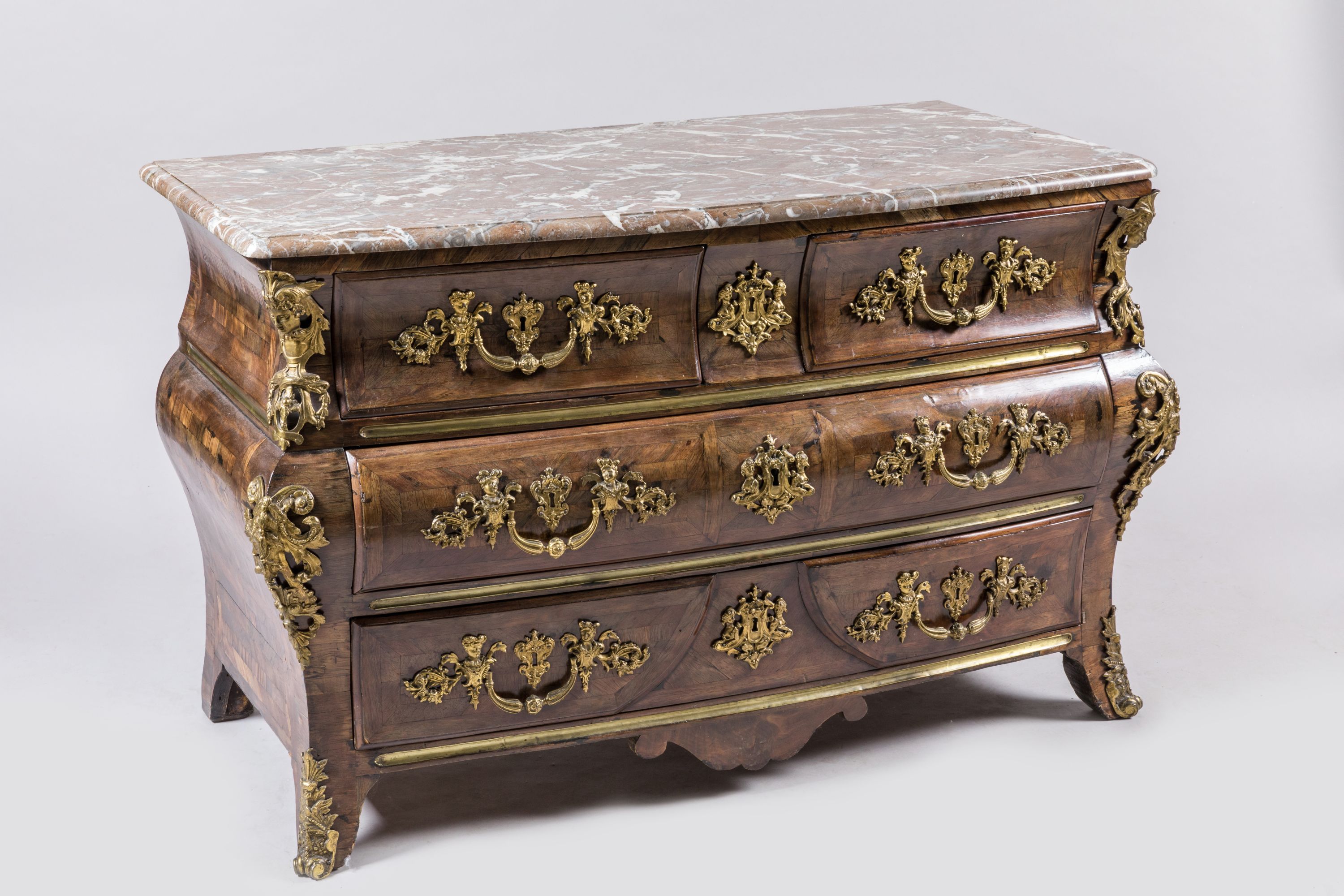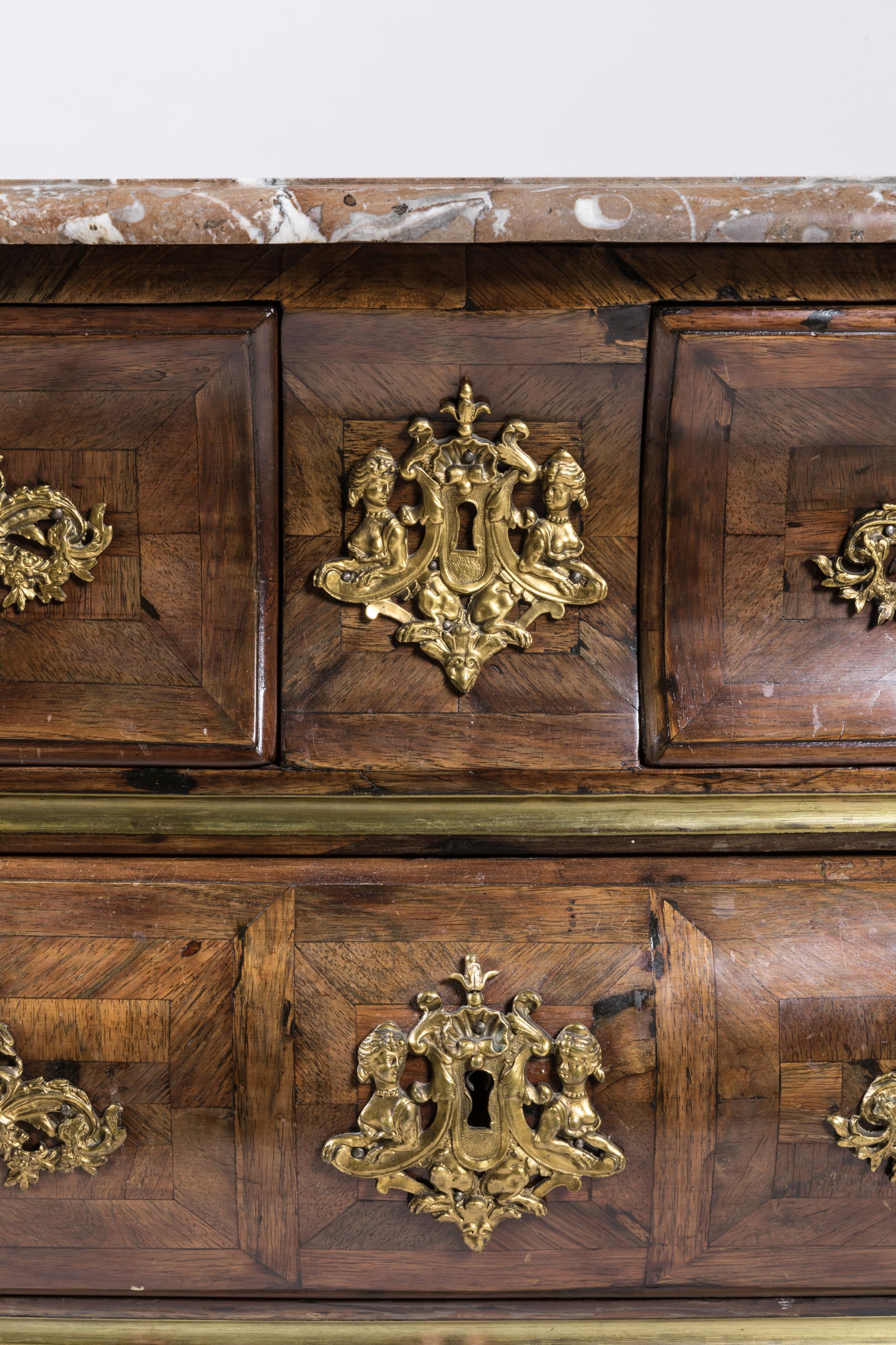 en placage de palissandre. Elle ouvre en façade par quatre tiroirs sur trois rangs séparés par une cannelure garnie de laiton. Riche ornementation de bronzes rapportés tels qu'entrées de serrure aux sphinges, mains tombantes aux marmousets empanachés, chutes à masque féminin et sabots. Dessus de marbre rouge royal rapporté.