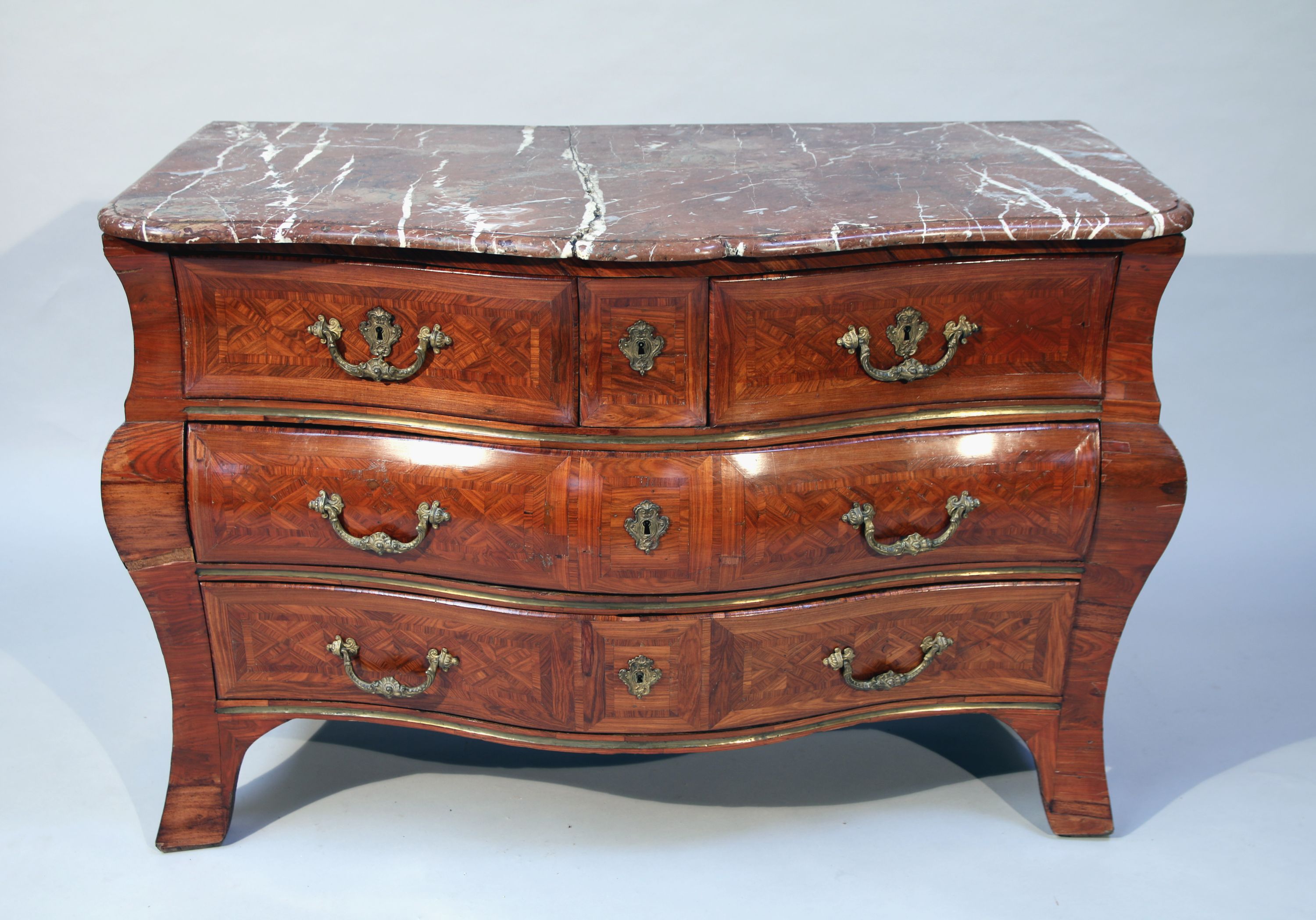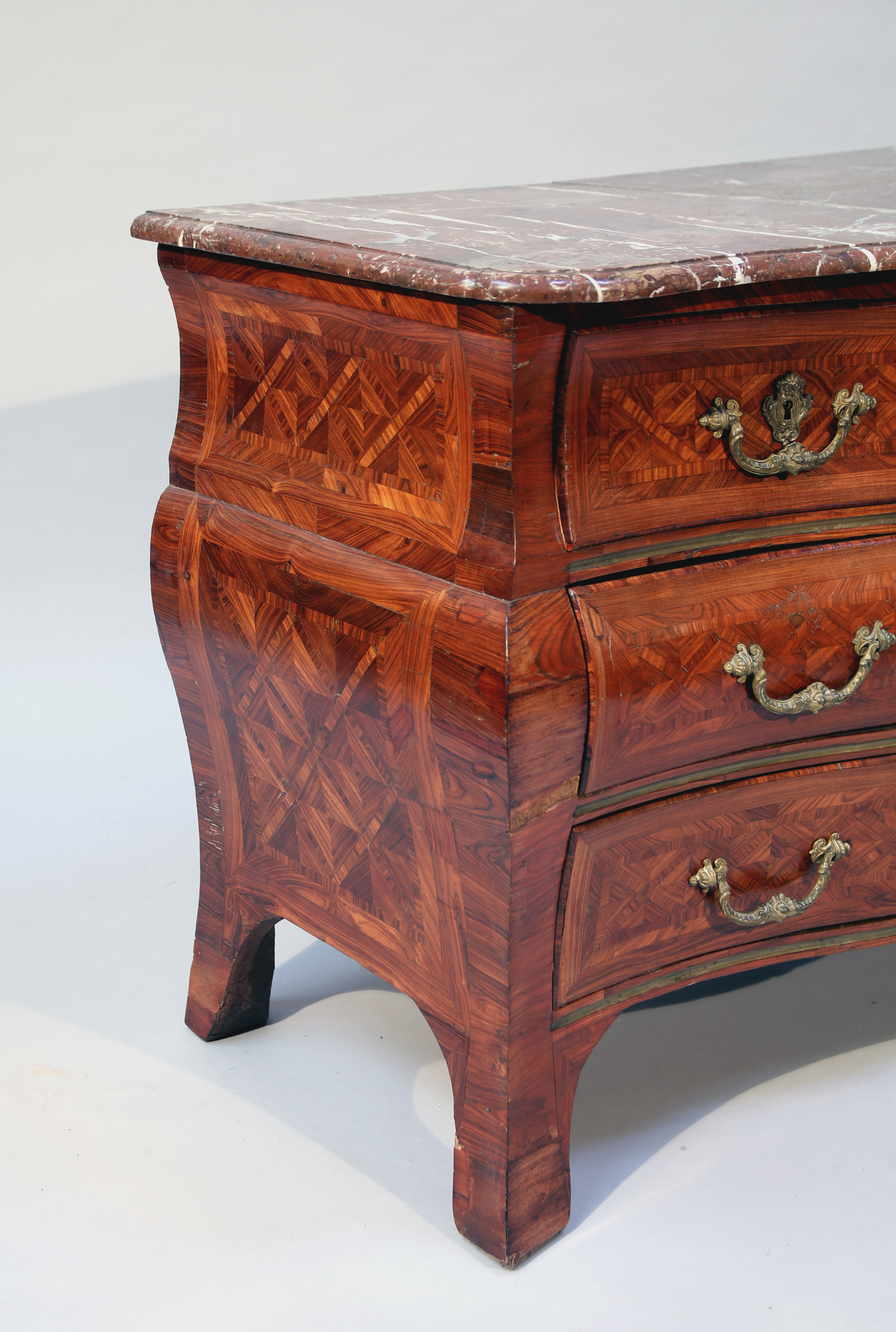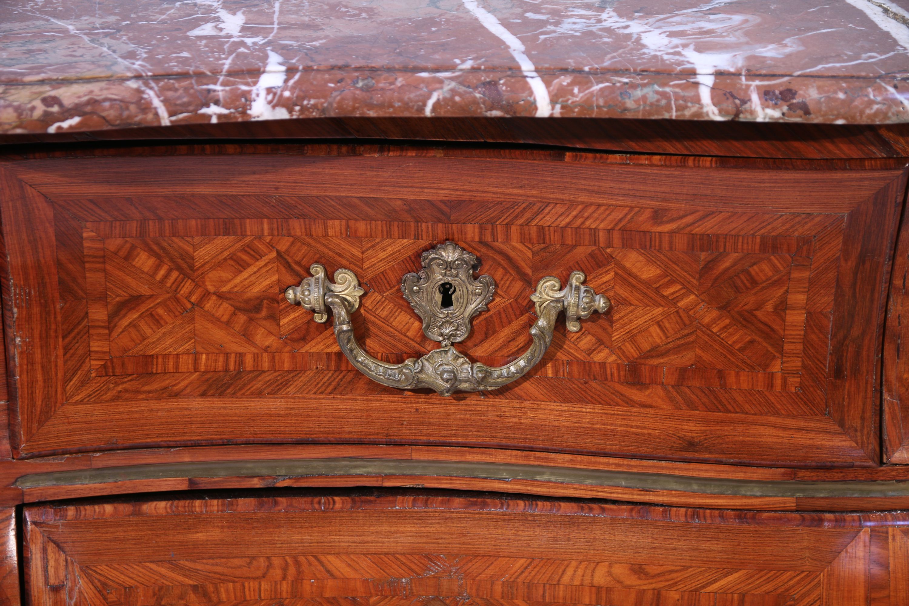 à trois rangs et ouvrant par cinq tiroirs. Marqueterie sur les trois côtés de bois de rose aux losanges. Ornementation de poignées tombantes en bronze doré aux motifs rocaille. Garnie d'un marbre rouge royal à bec de corbin.