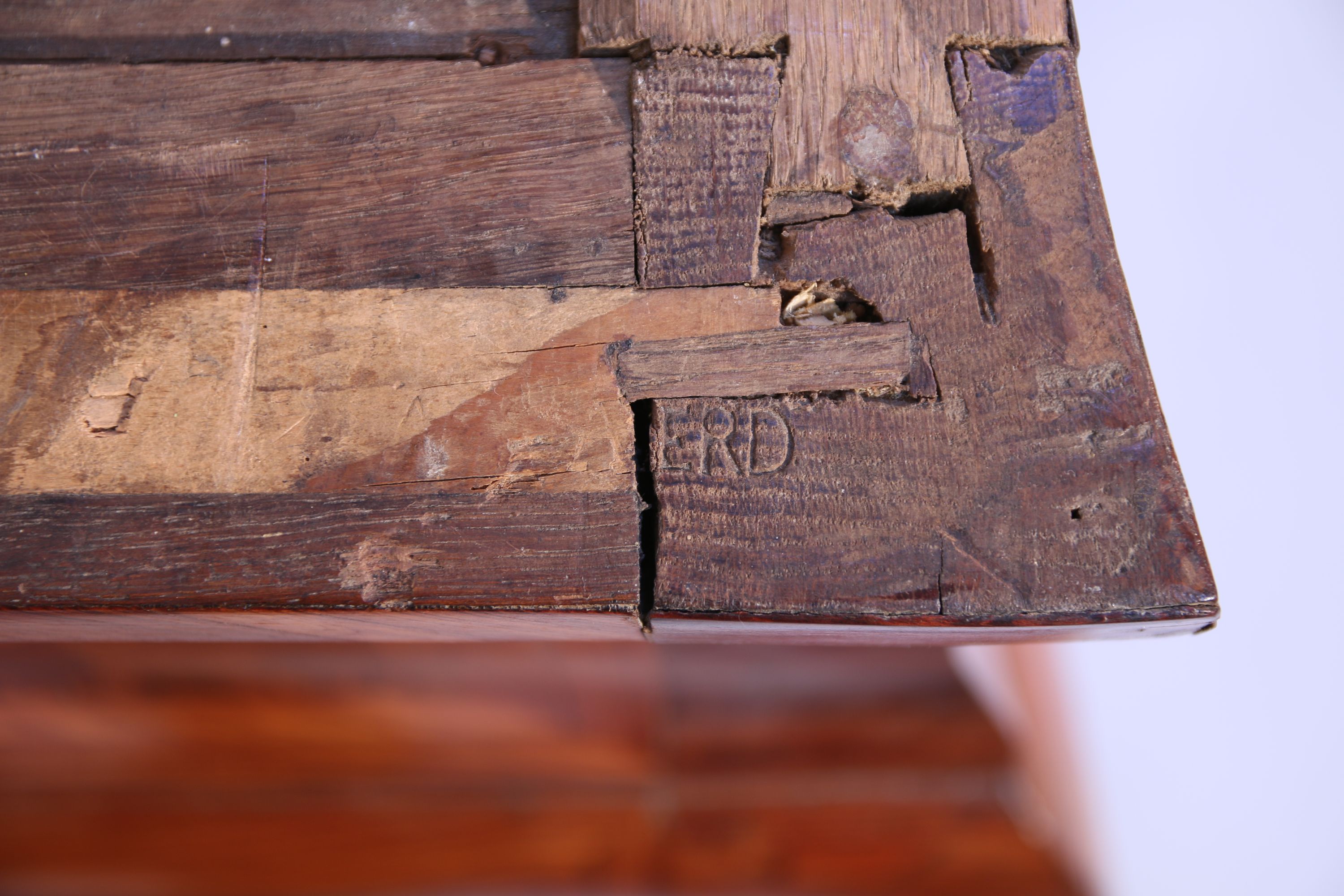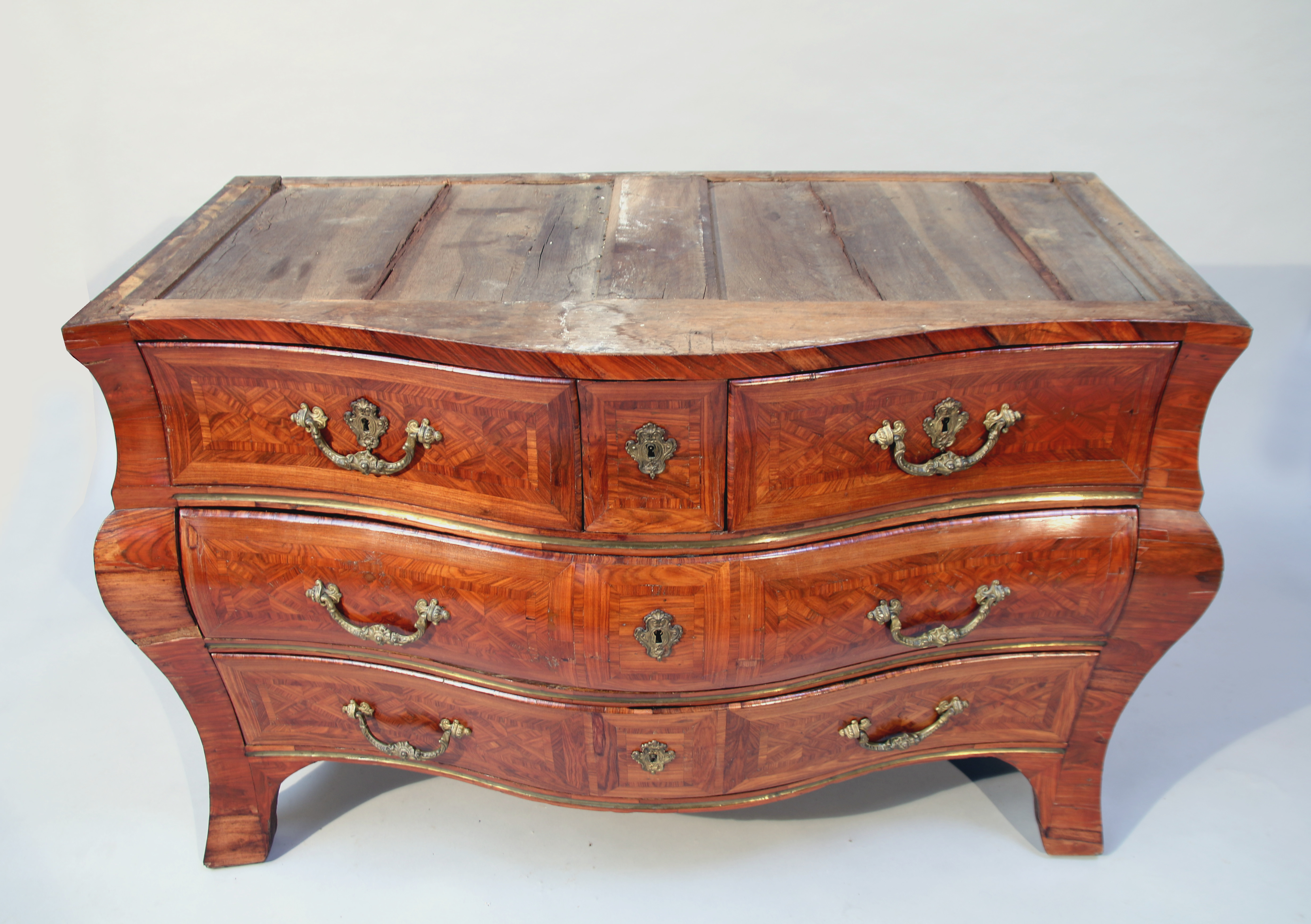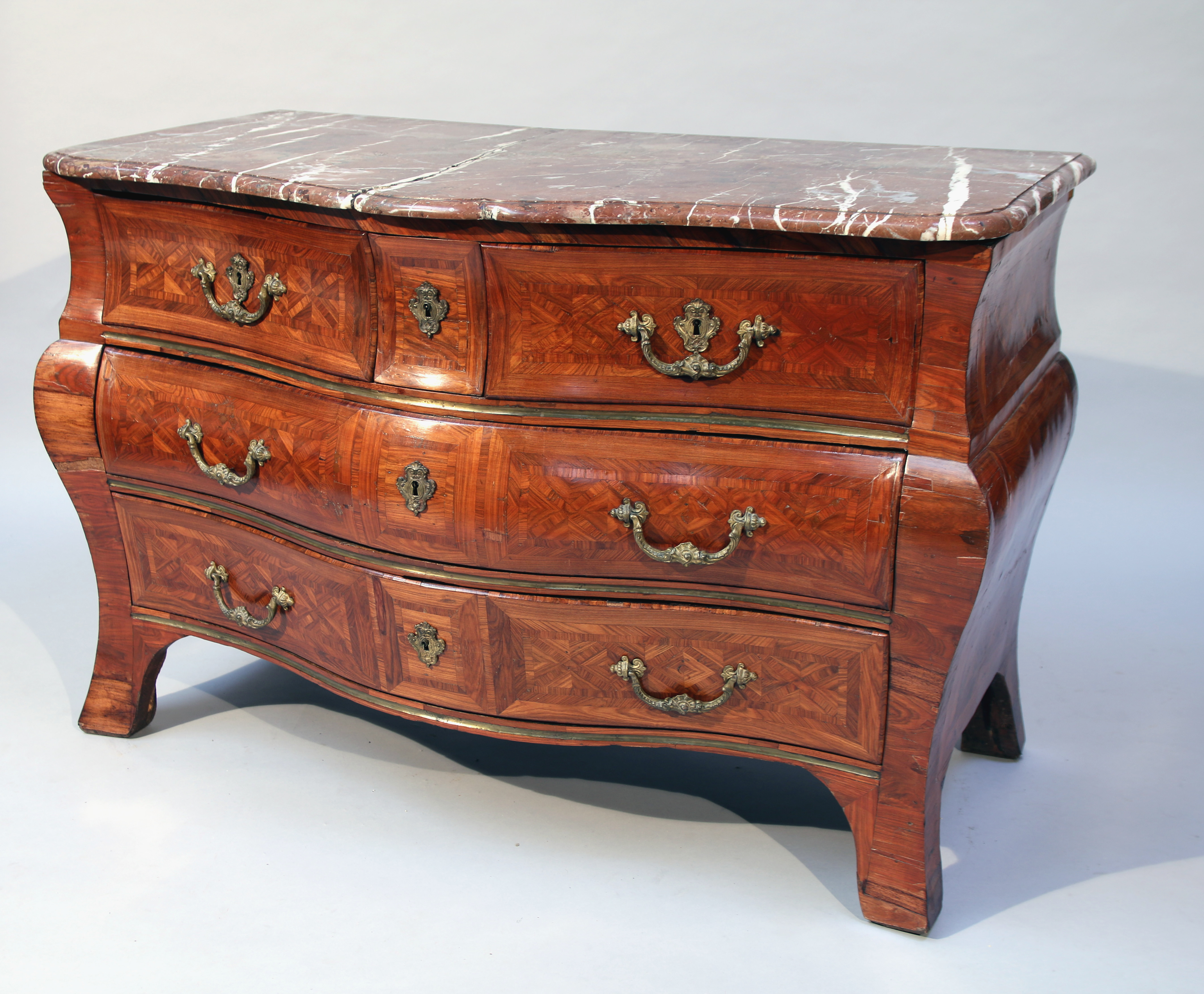 à trois rangs et ouvrant par cinq tiroirs. Marqueterie sur les trois côtés de bois de rose aux losanges. Ornementation de poignées tombantes en bronze doré aux motifs rocaille. Garnie d'un marbre rouge royal à bec de corbin.