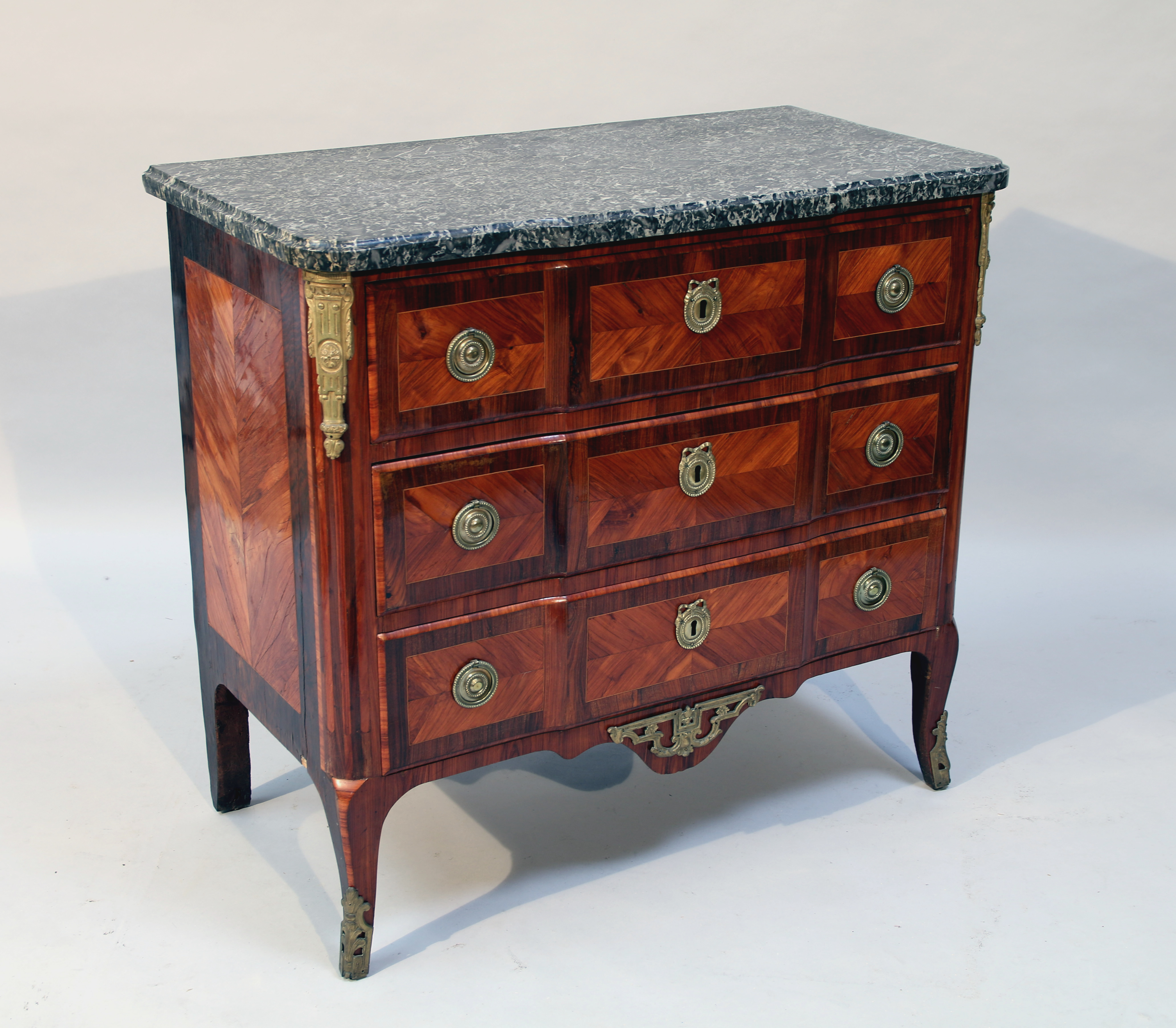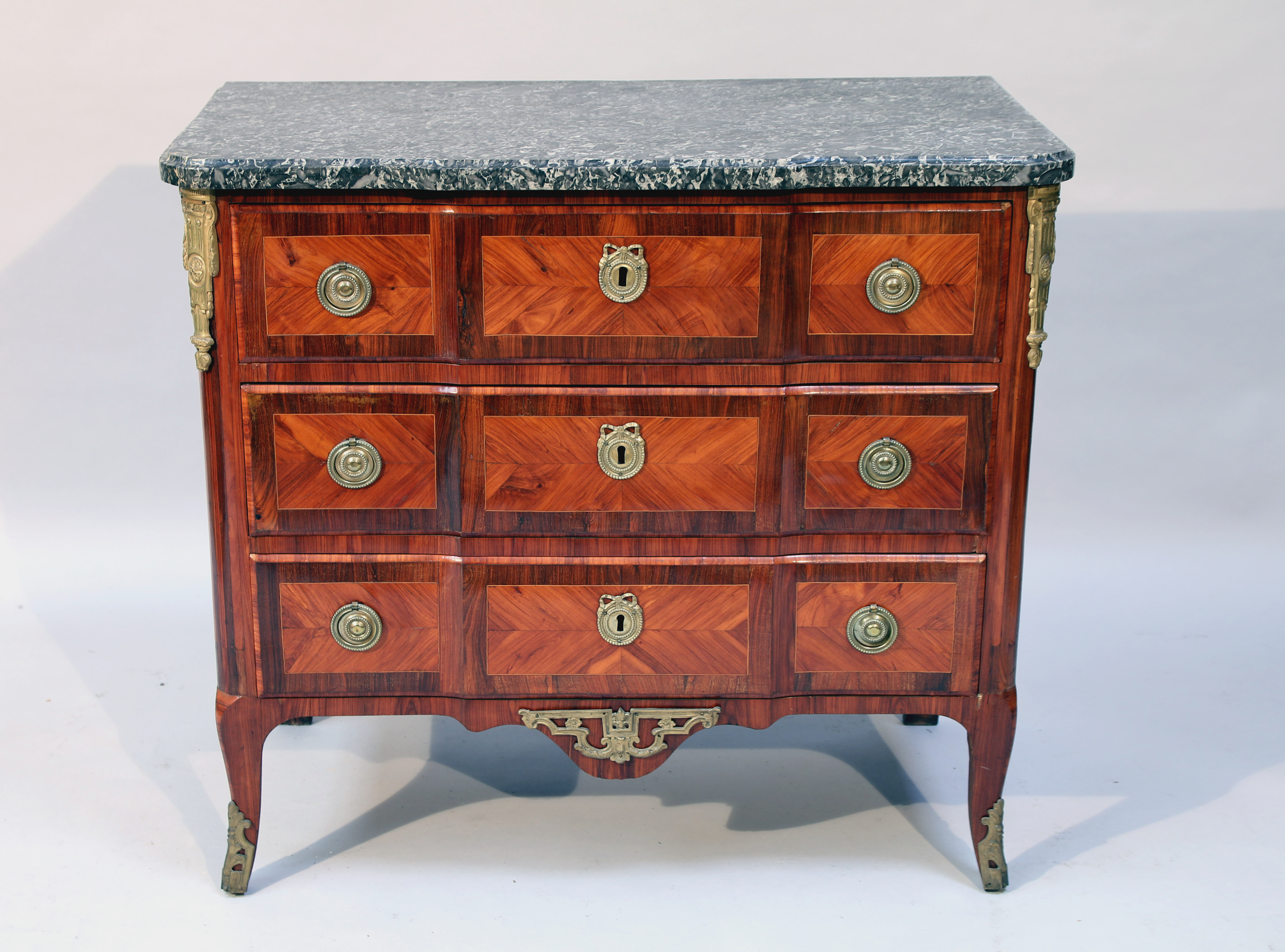 ouvrant par trois tiroirs en façade et reposant sur quatre pieds, les antérieurs galbés. En placage de bois de rose et de palissandre. Ornée de poignées, entrées de serrure à frises de perles, chutes d'angles à piles feuillagées, cul de lampe et sabots en bronze doré.