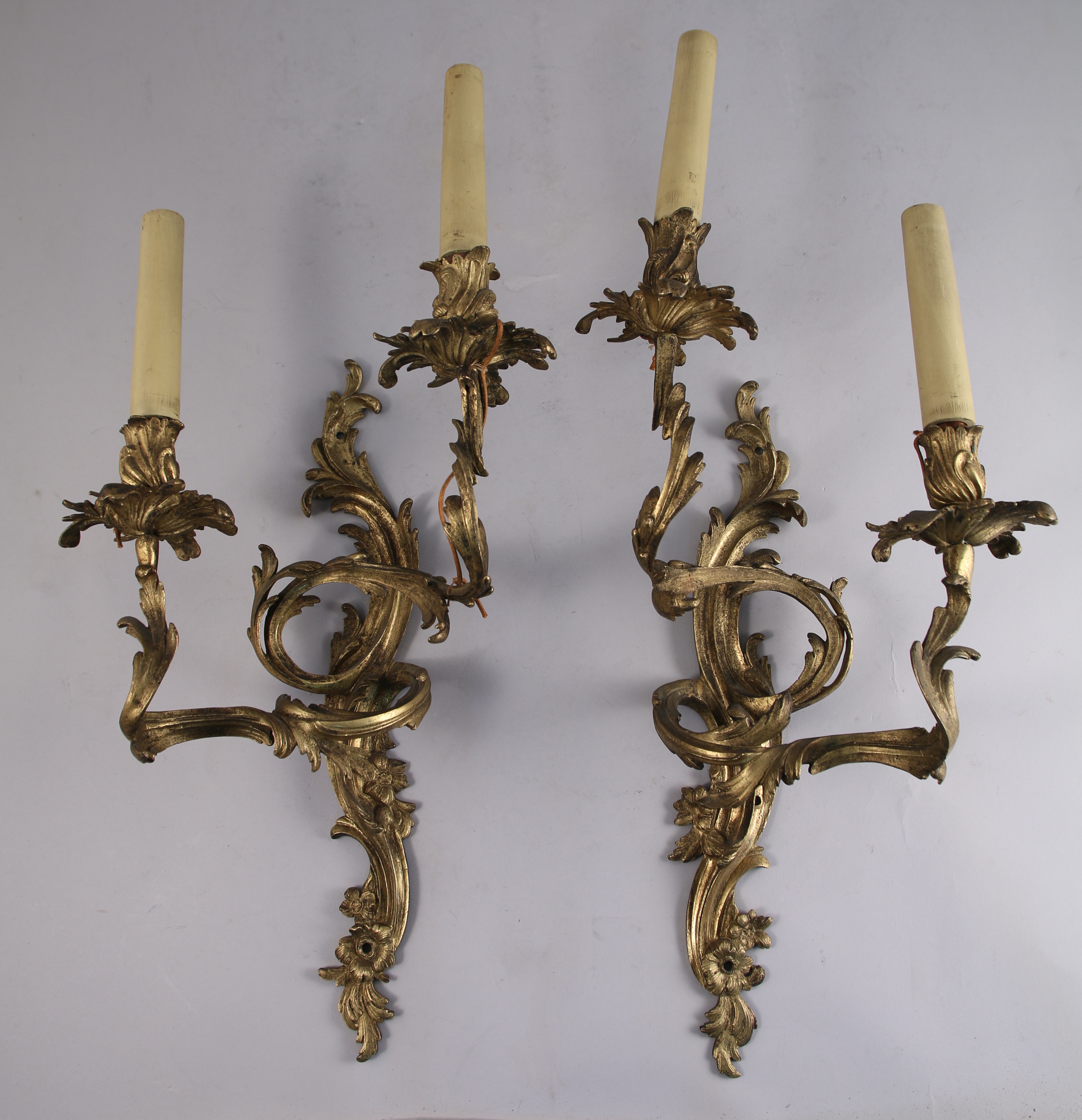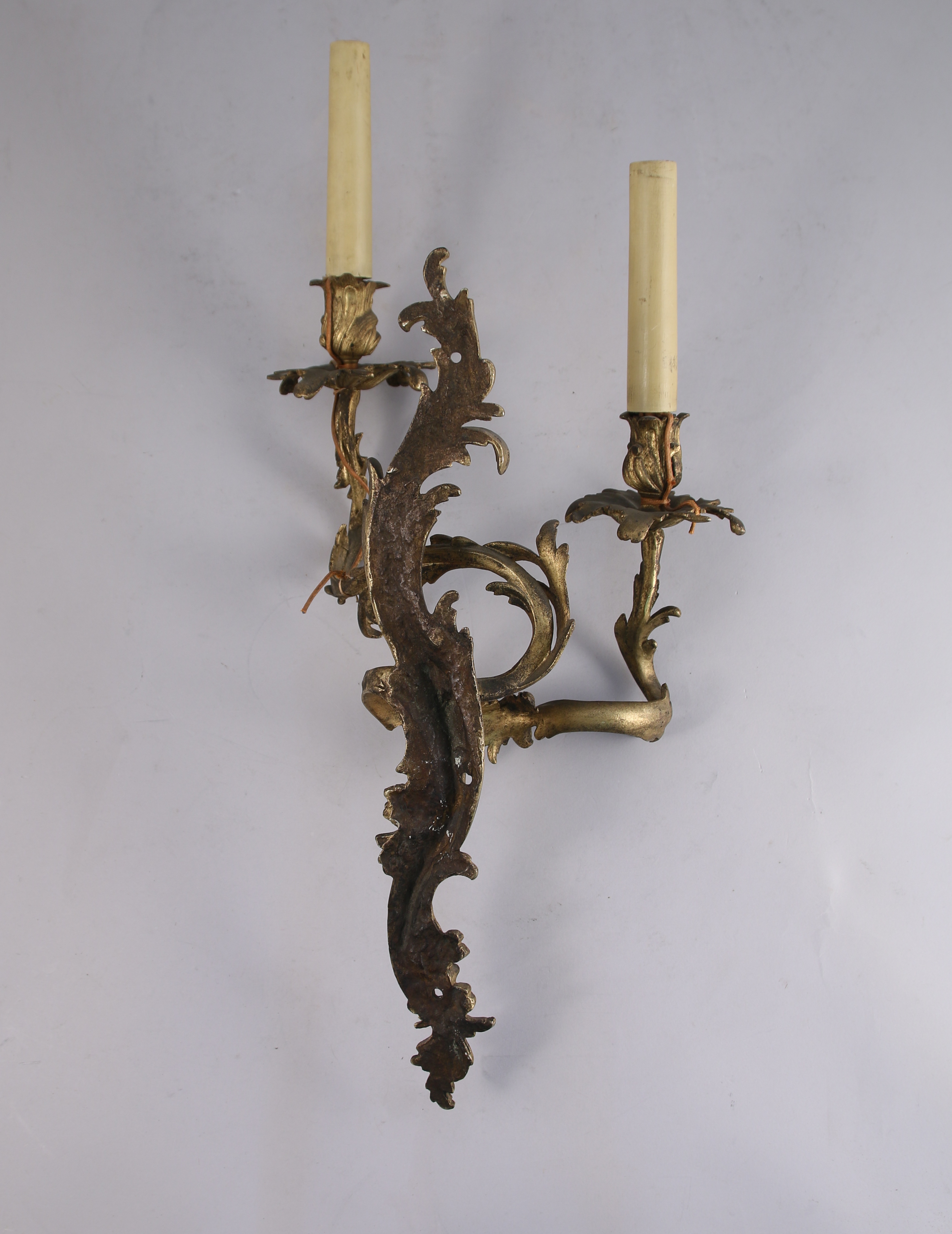 de forme mouvementée à deux bras de lumière en bronze ciselé et doré. Décor de fleurs épanouies et feuilles d'acanthe.