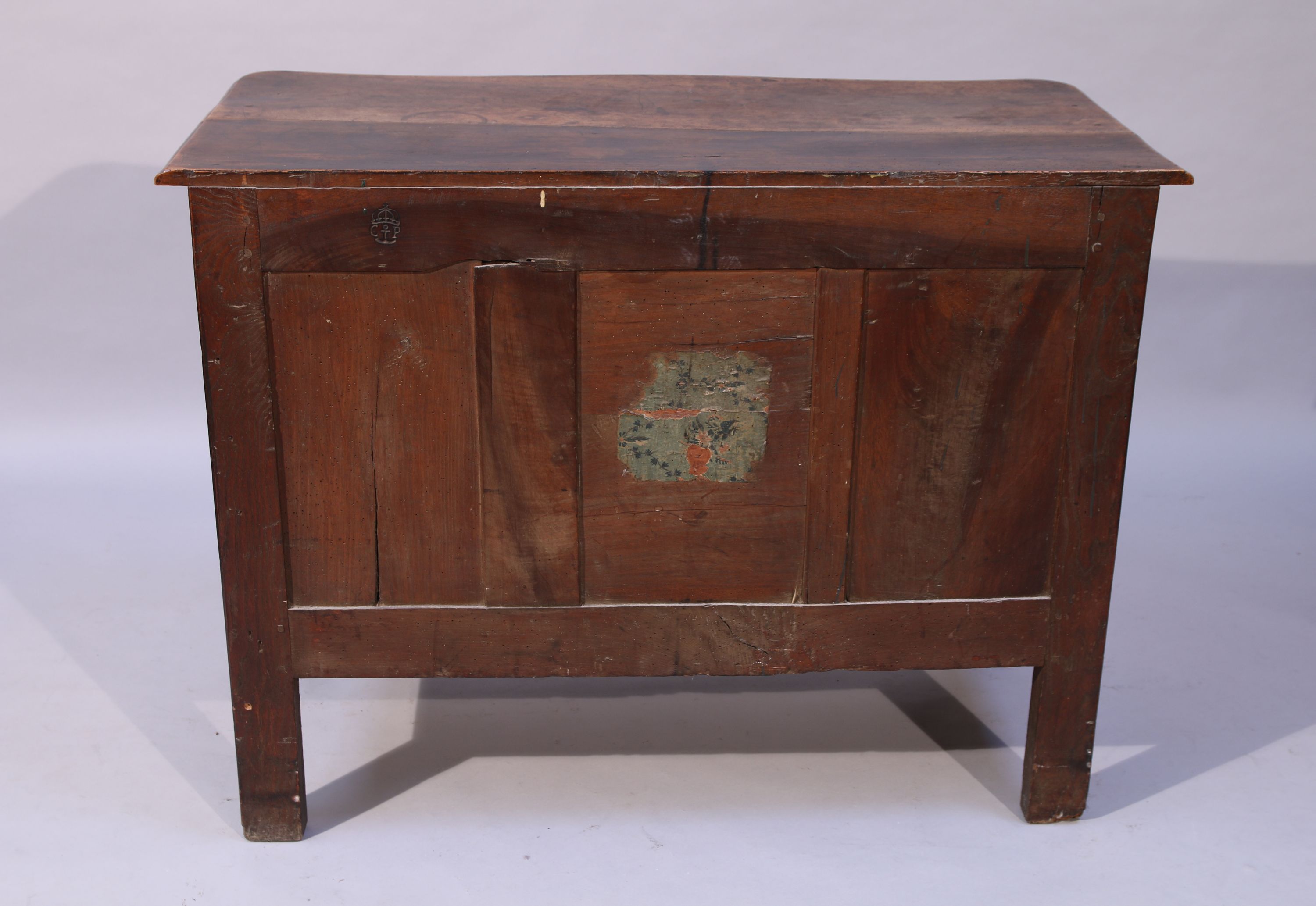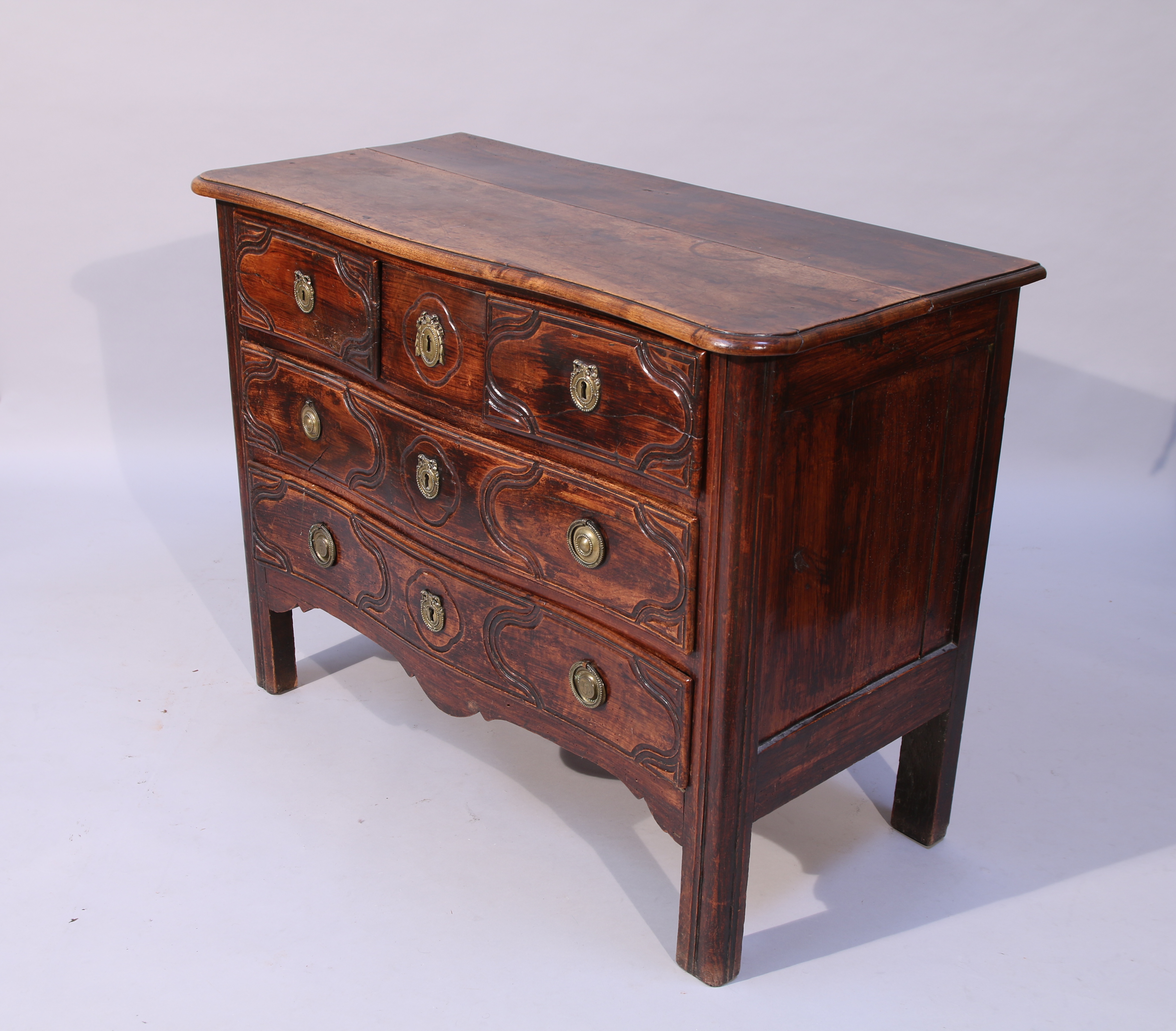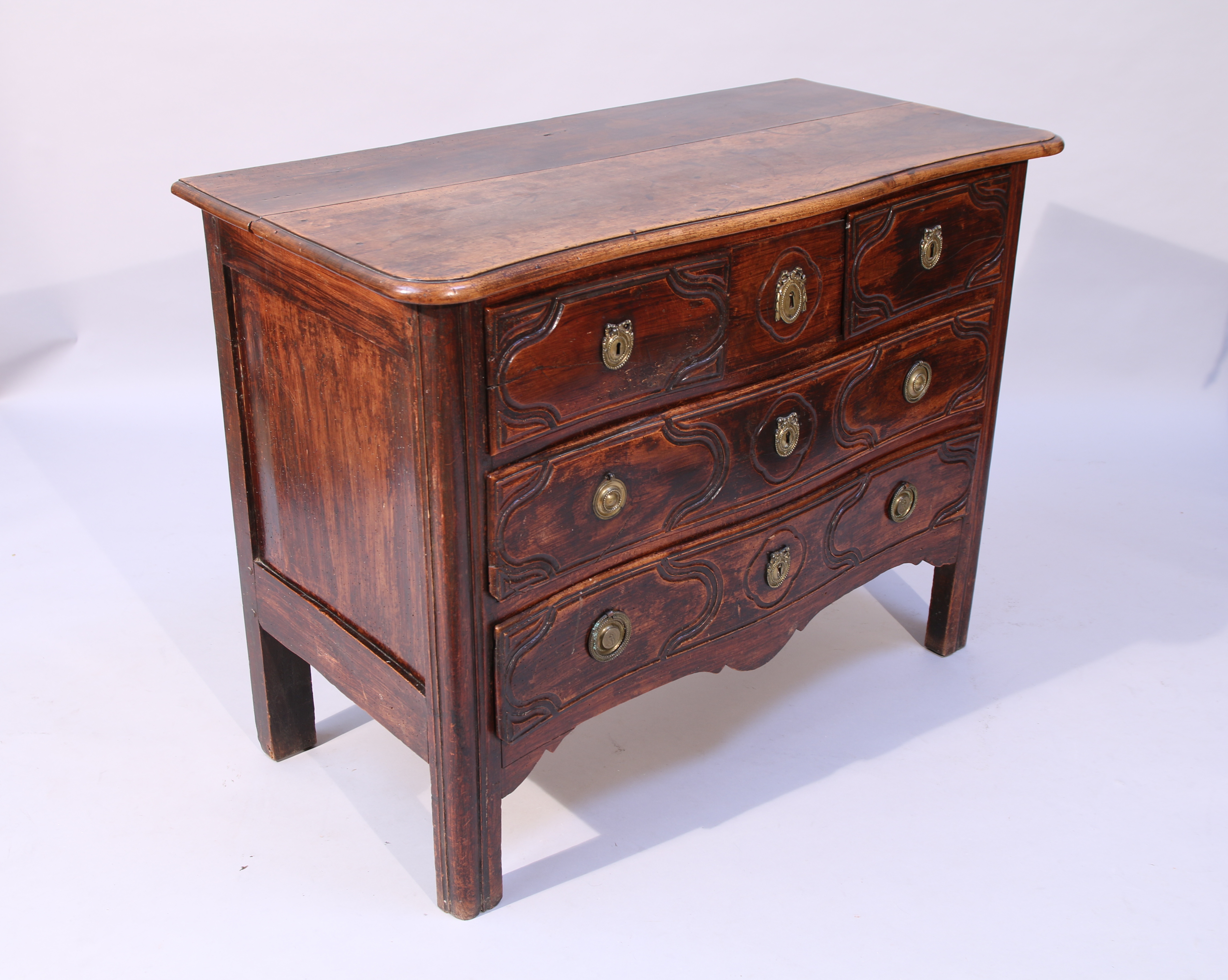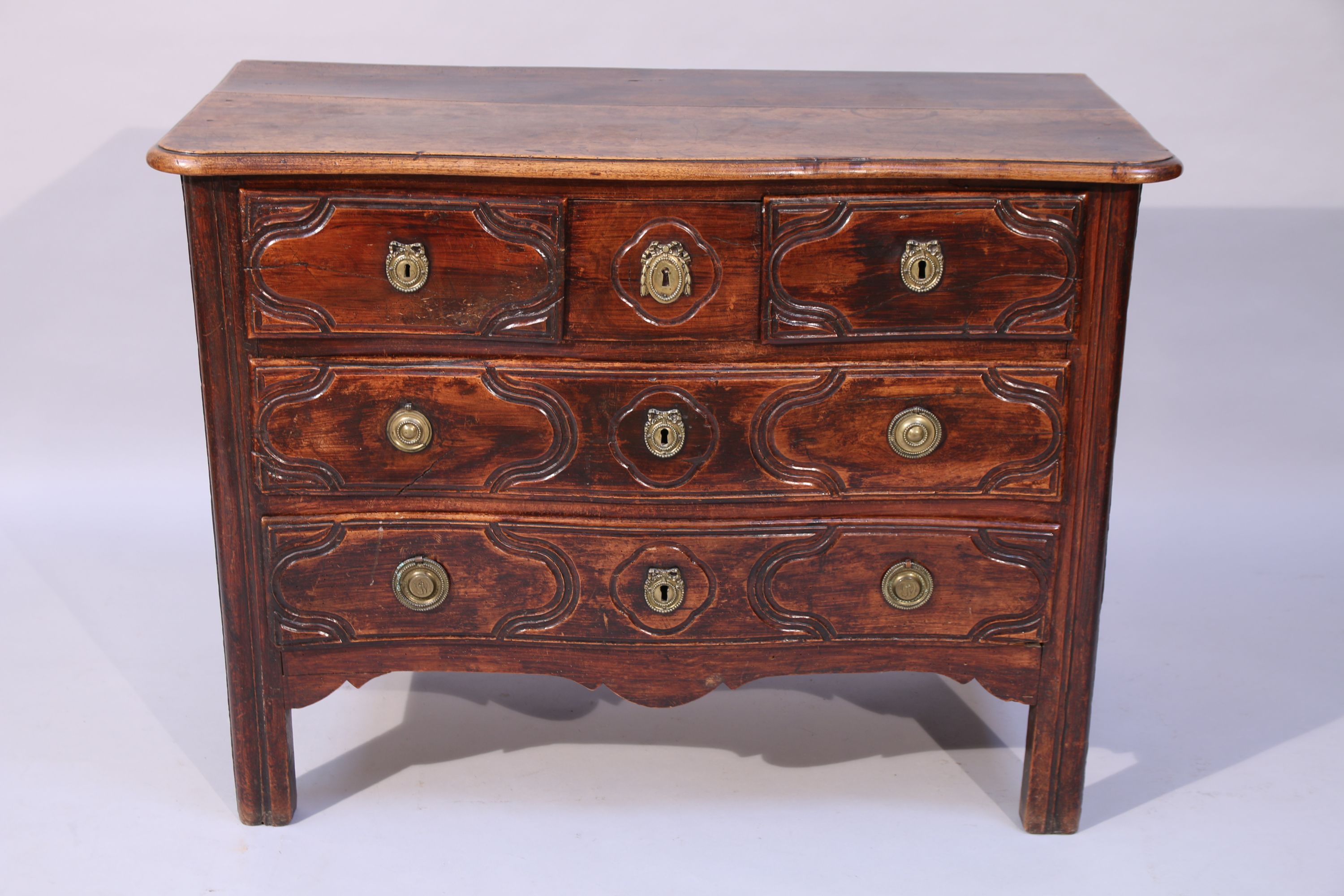 à la forme légèrement mouvementée, en noyer teinté sur un bâti de chêne. Ouvrant par cinq tiroirs en façade sur trois rangs. Décor d'arcatures moulurées. Reposant sur des pieds droits. Ornementation de bronze doré, entrées de serrures et poignées, à décor de frises de perles surmontées d'un ruban.