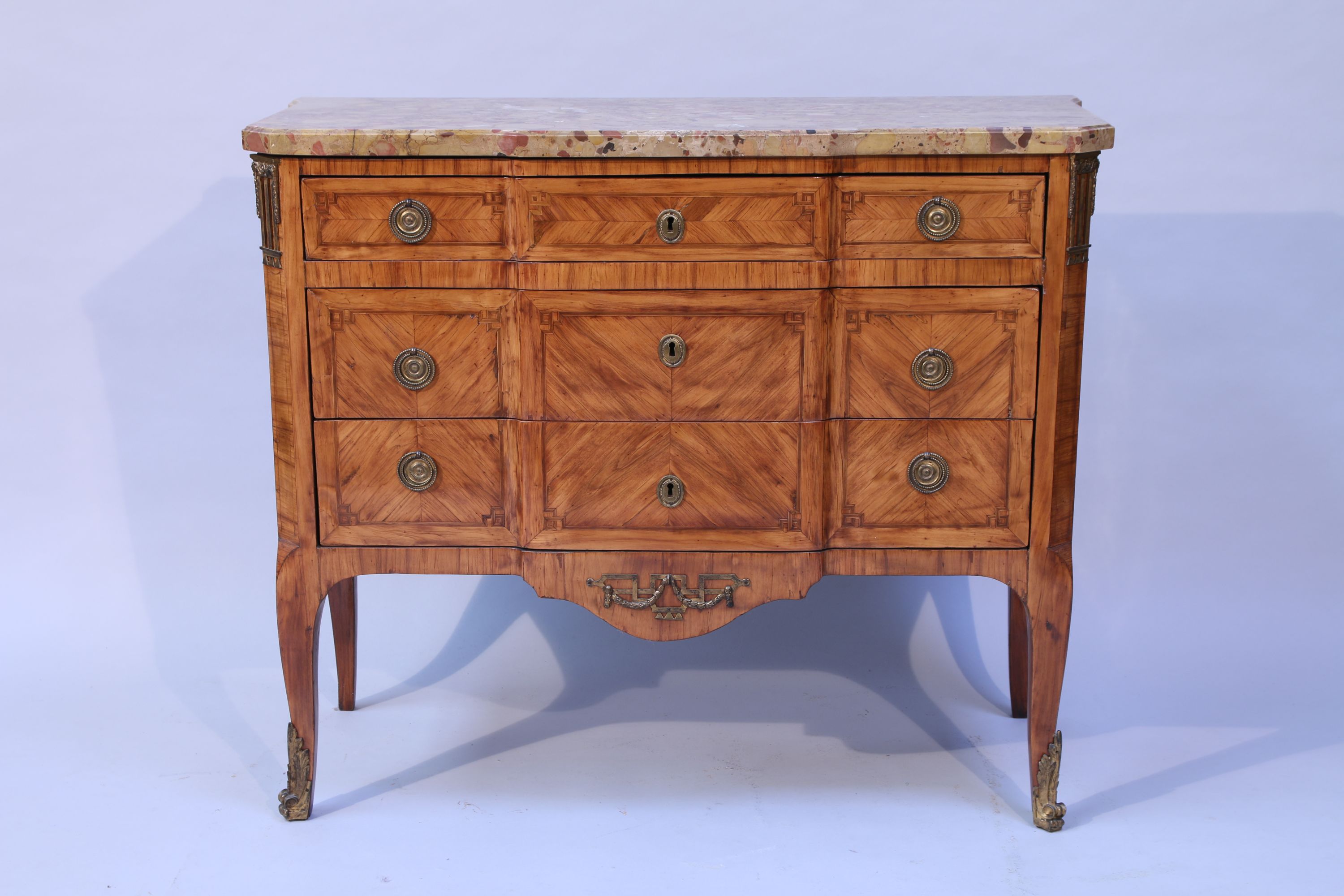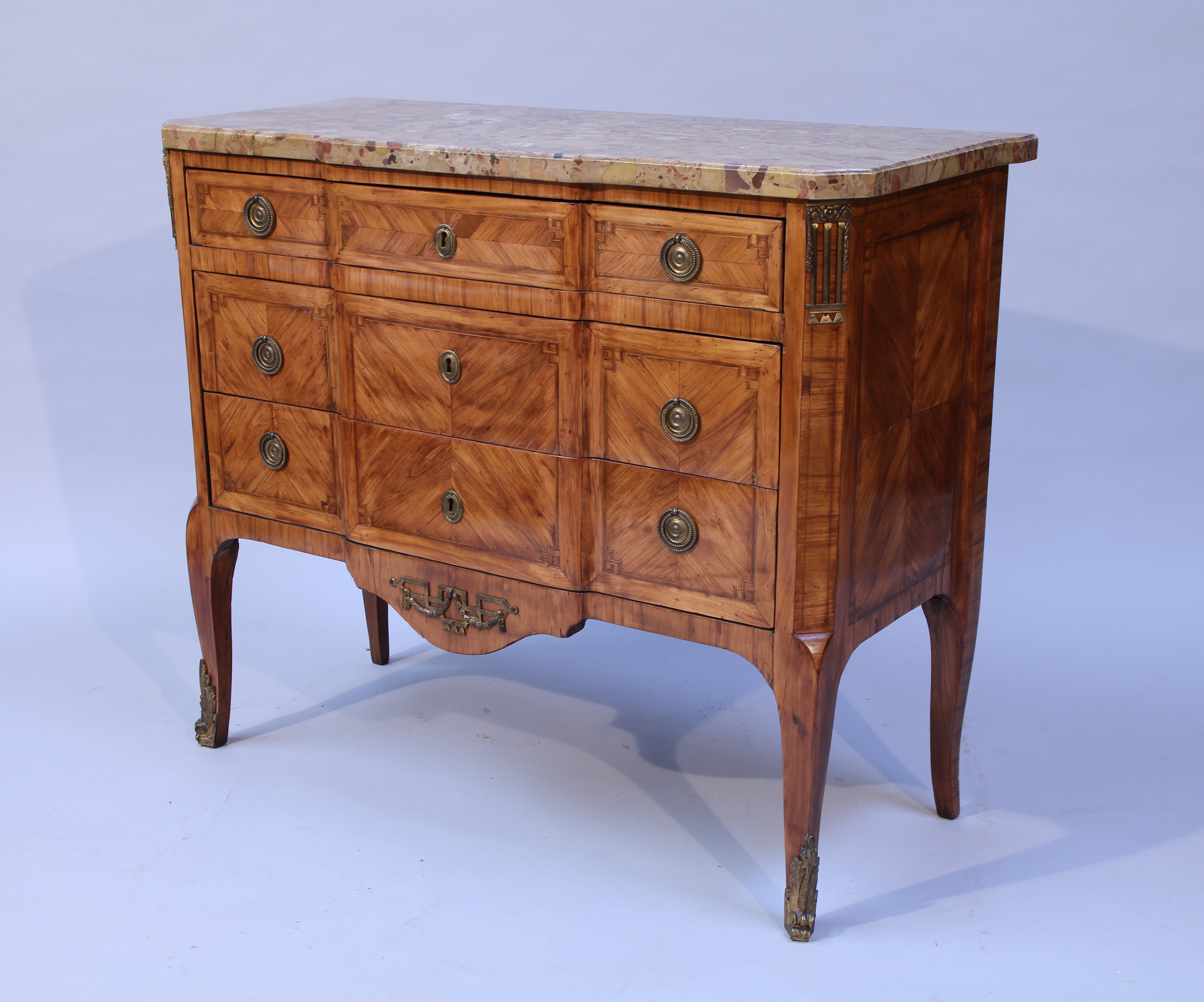 en placage de bois de rose ouvrant en façade par trois tiroirs dont deux sans traverse. Elle reçoit un décor marqueté de frisages en "X" dans des encadrements d'amarante et filets à la grecque. Garniture de bronzes ciselés et dorés tels que entrées de serrure, anneaux mobiles, chutes en triglyphes, tablier et sabots. Elle est coiffée d'un marbre brèche d'Alep.