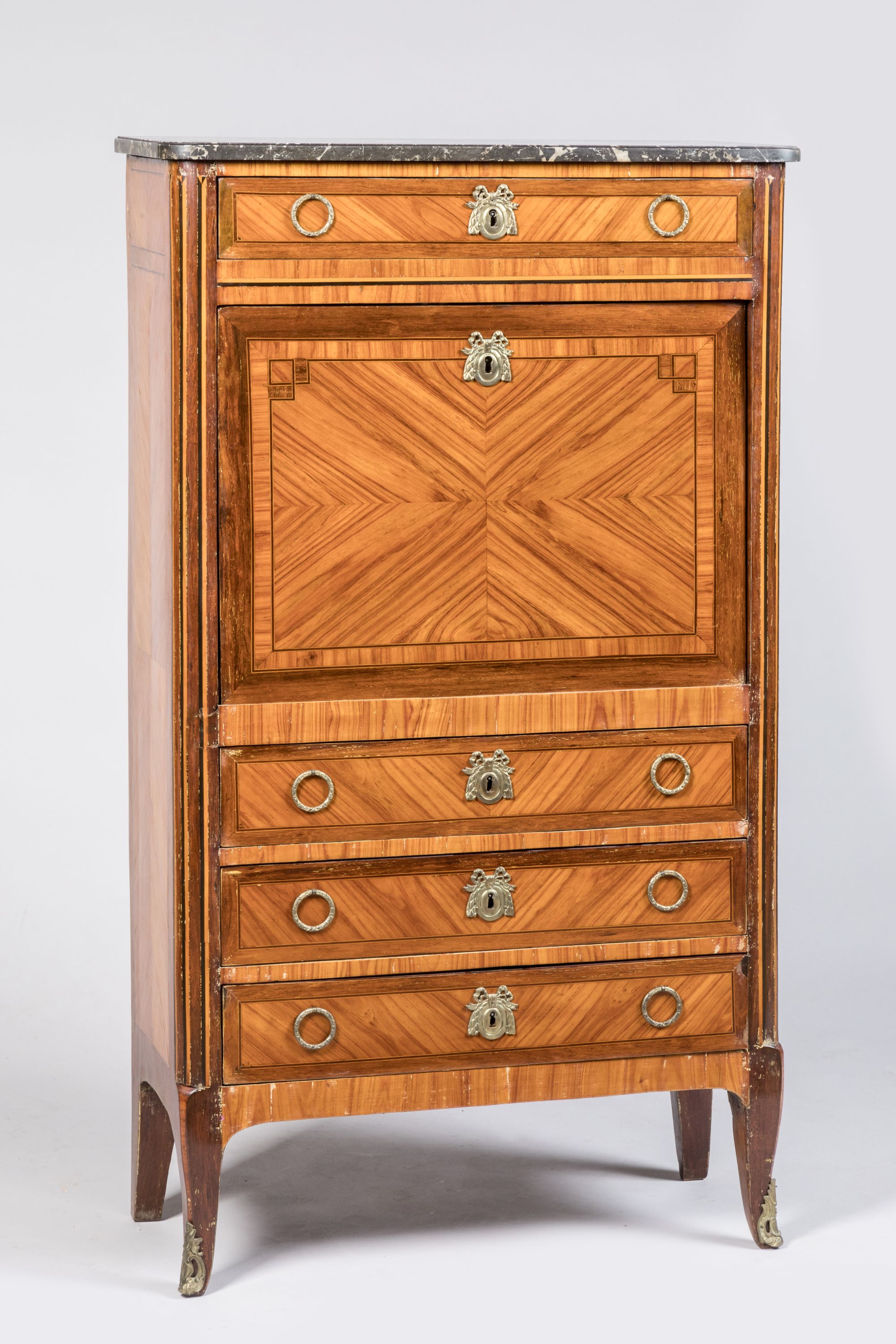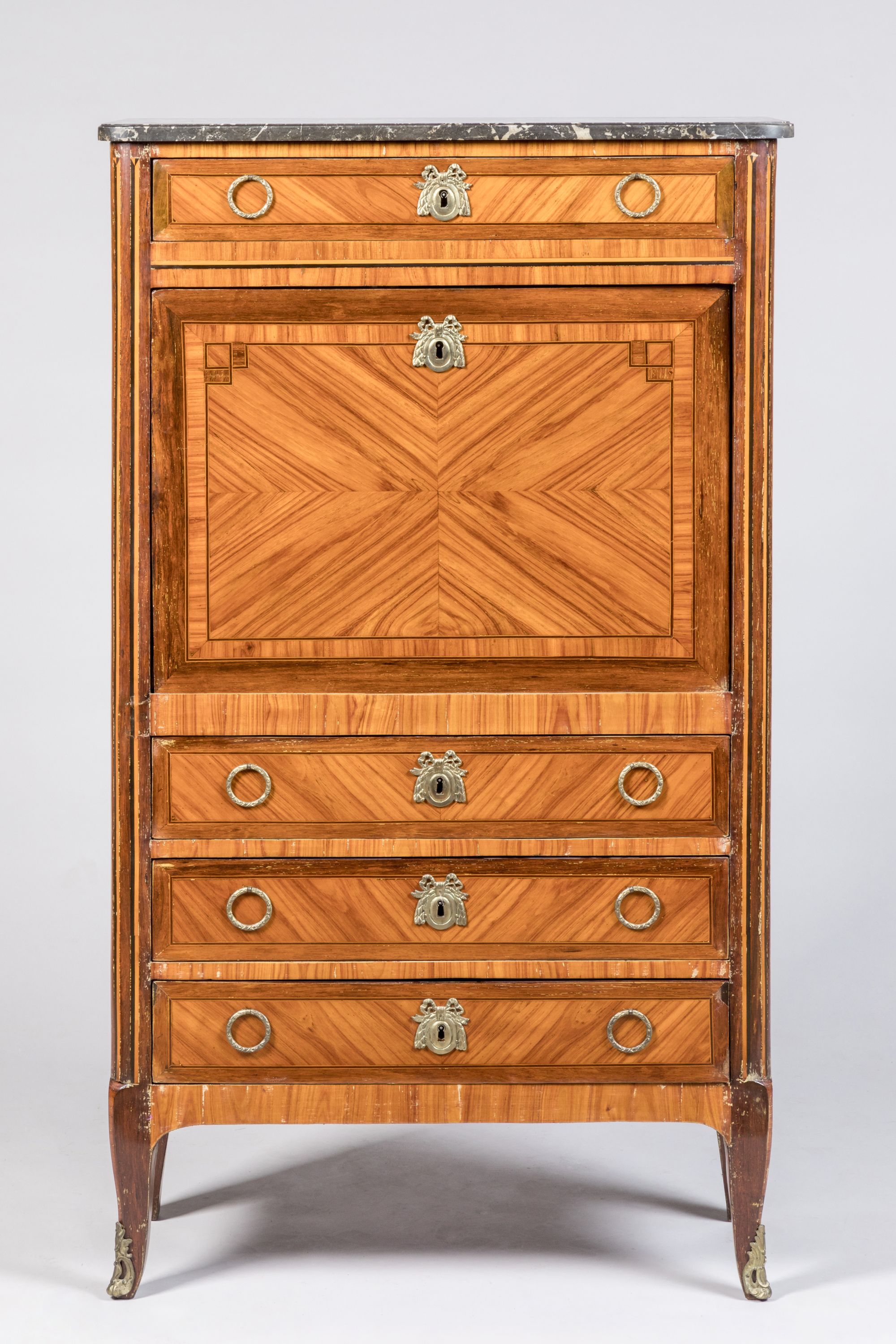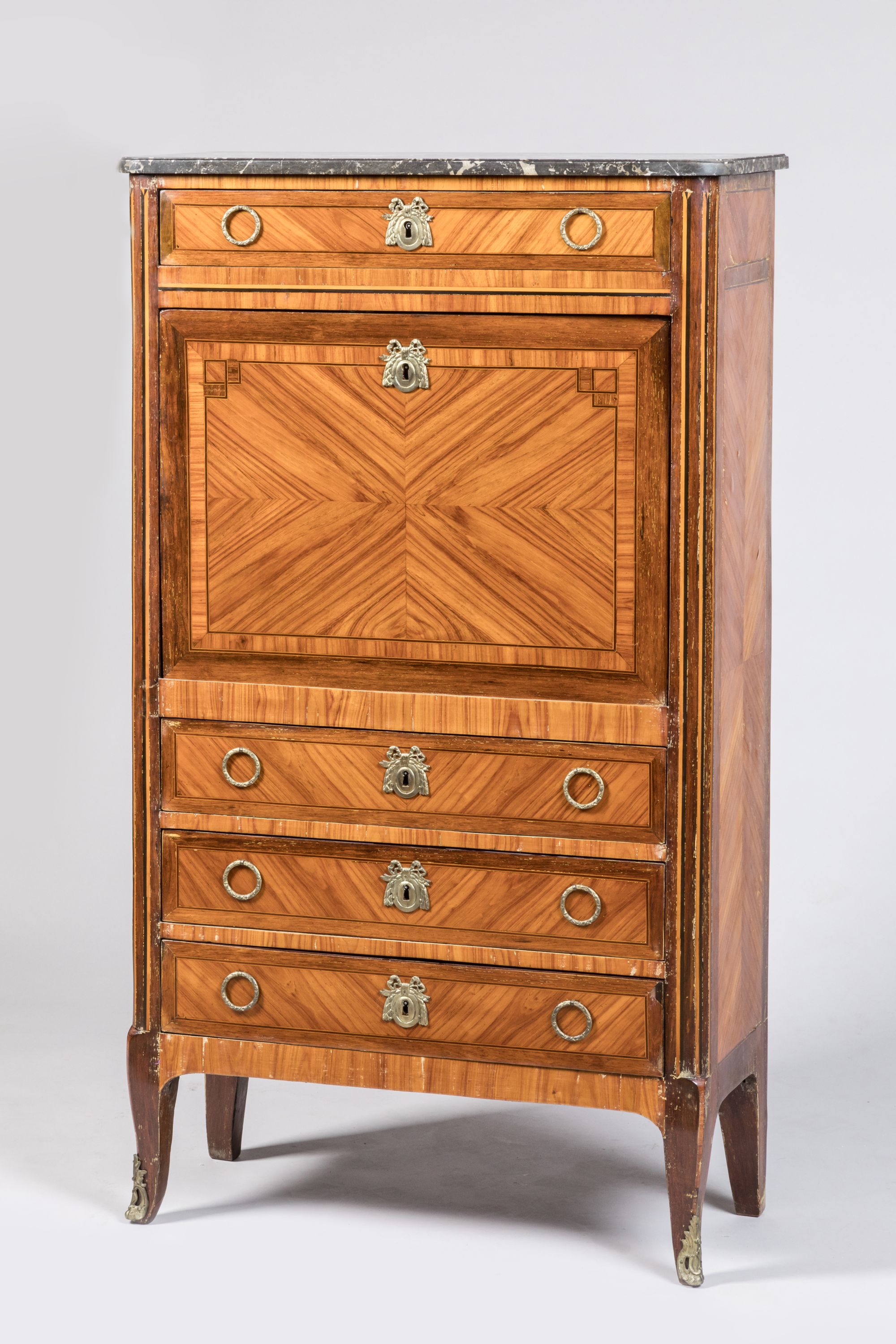 SECRÉTAIRE à ABATTANT en marqueterie d'amarante et frisage en ailes de papillon. Il ouvre en façade par 4 tiroirs et un abattant qui révèle un écritoire gainé de cuir et 8 petits tiroirs. Ses montants sont à pans coupés et le placage imite des cannelures. Il repose sur des pieds postérieurs en sabre et des pieds antérieurs cambrés garnis de sabots de bronze à décor feuillagé. Les entrées de serrures et anneaux de tirage sont également en bronze doré et ciselé.