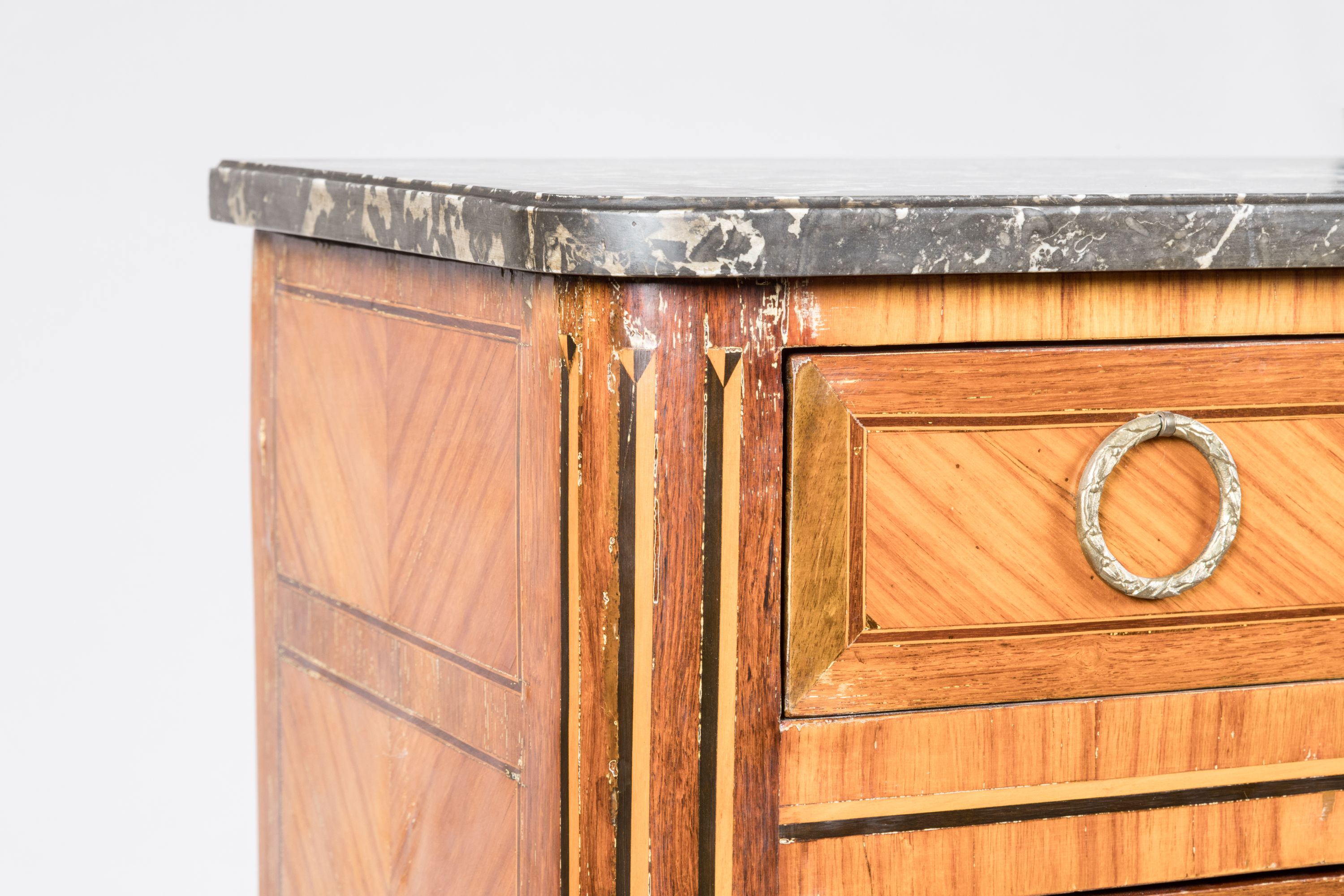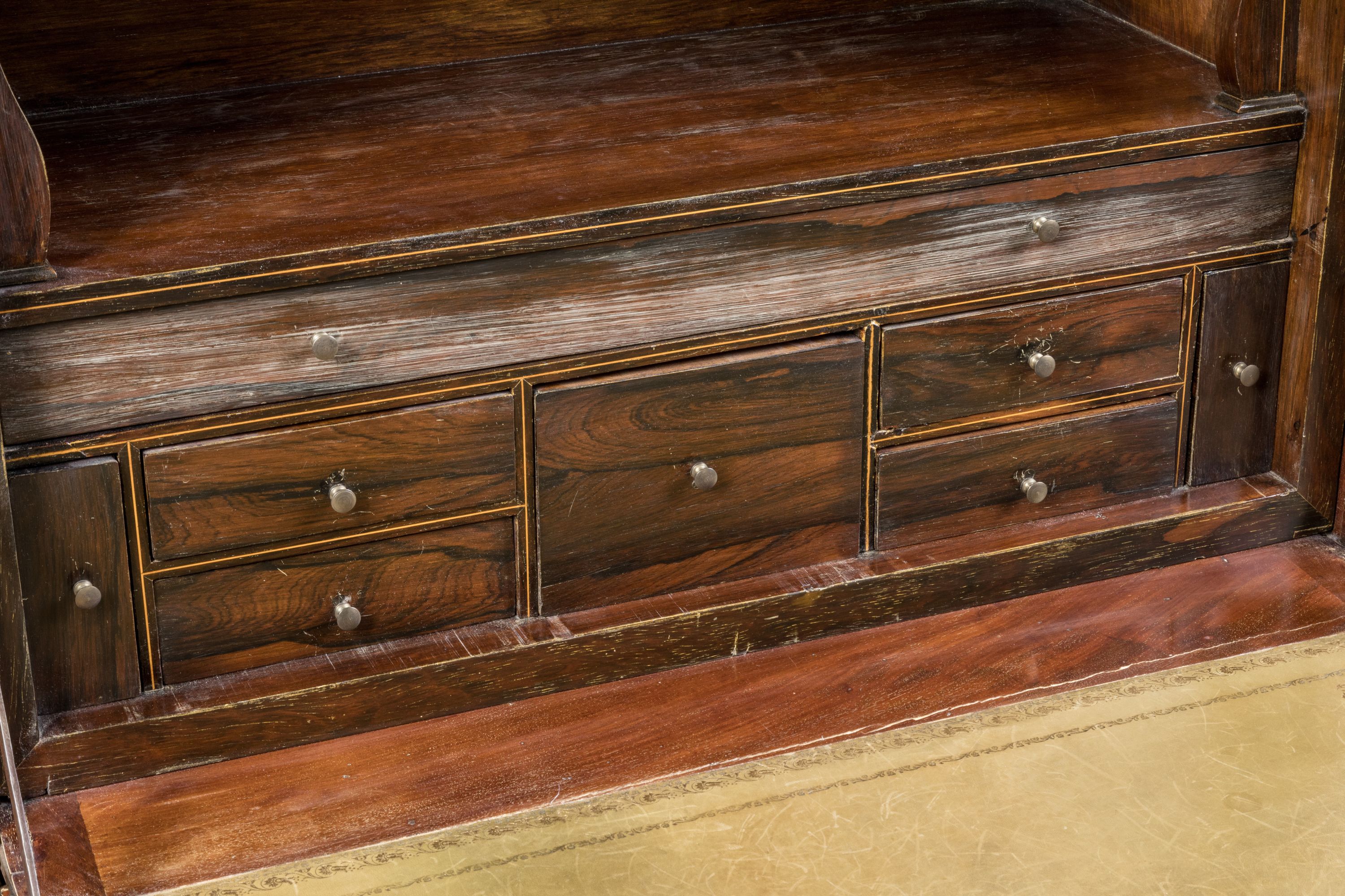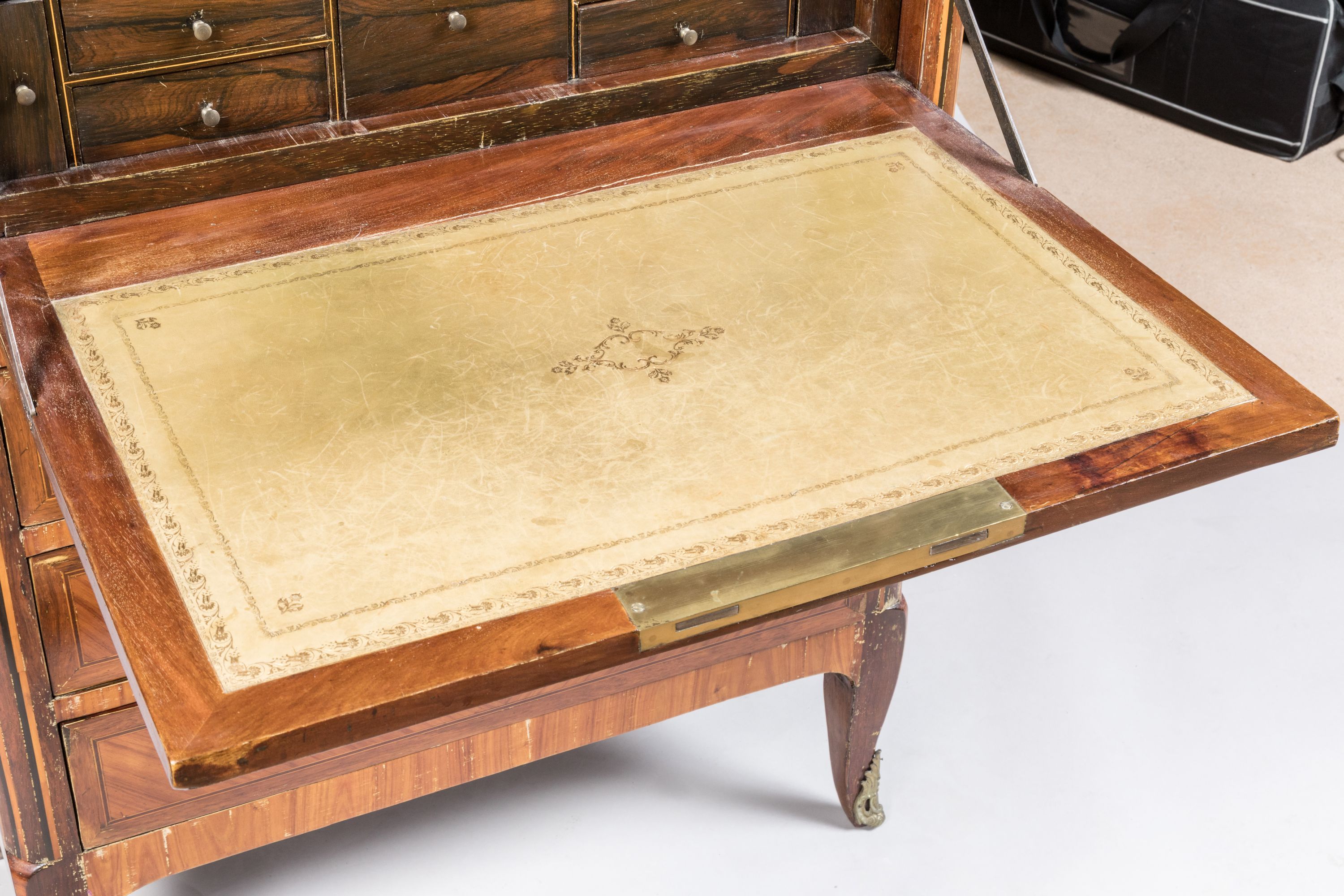 SECRÉTAIRE à ABATTANT en marqueterie d'amarante et frisage en ailes de papillon. Il ouvre en façade par 4 tiroirs et un abattant qui révèle un écritoire gainé de cuir et 8 petits tiroirs. Ses montants sont à pans coupés et le placage imite des cannelures. Il repose sur des pieds postérieurs en sabre et des pieds antérieurs cambrés garnis de sabots de bronze à décor feuillagé. Les entrées de serrures et anneaux de tirage sont également en bronze doré et ciselé.