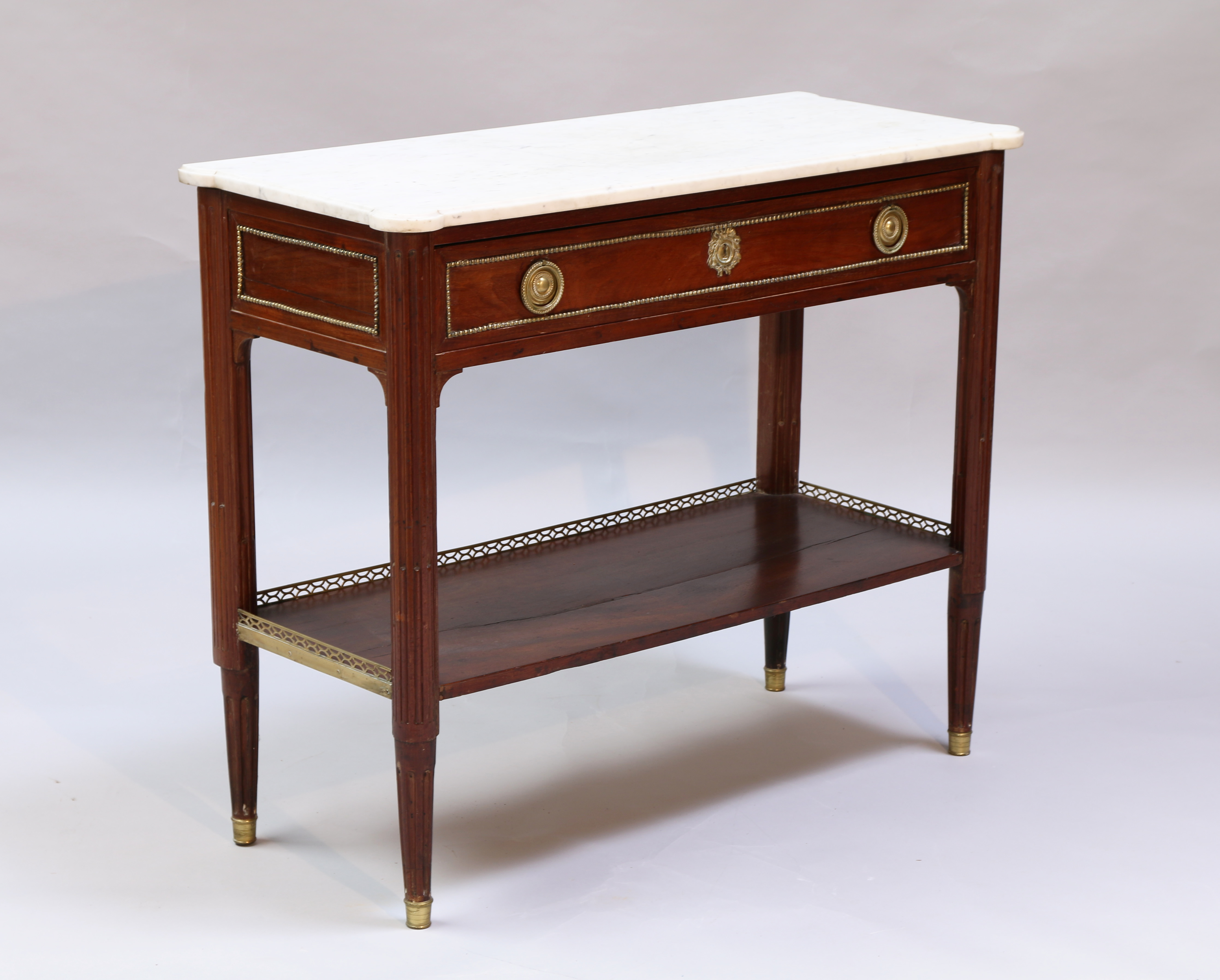 en acajou et placage d'acajou ouvrant par un tiroir en ceinture. Garniture de bronzes ciselés et dorés tels que Entrée de serrure, anneaux mobiles et rais de perle. Elle repose sur quatre pieds fuselés et rudentés réunis par une tablette d'entretoise ceinte sur trois côtés d'une galerie de laiton ajourée. Dessus de marbre blanc.
