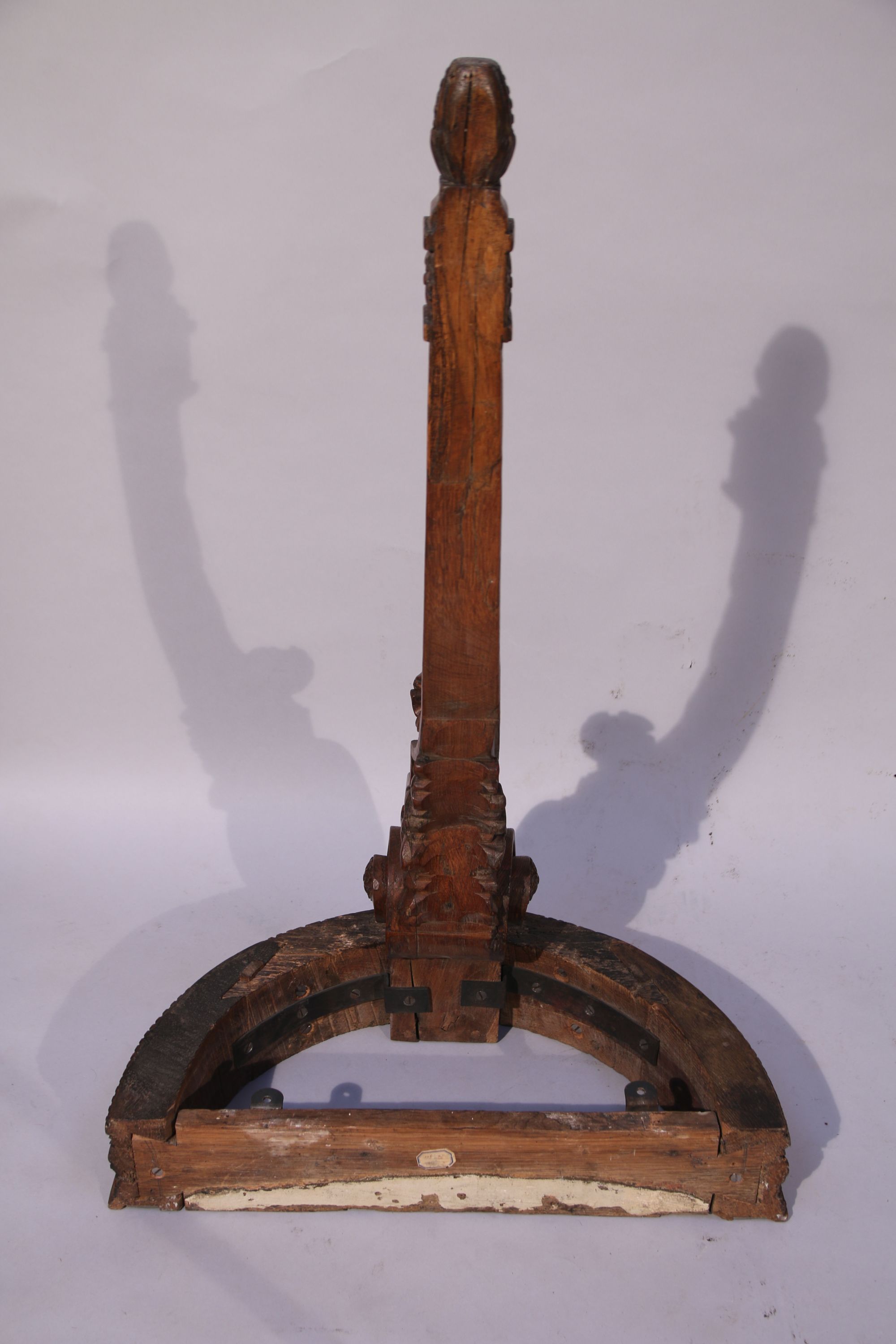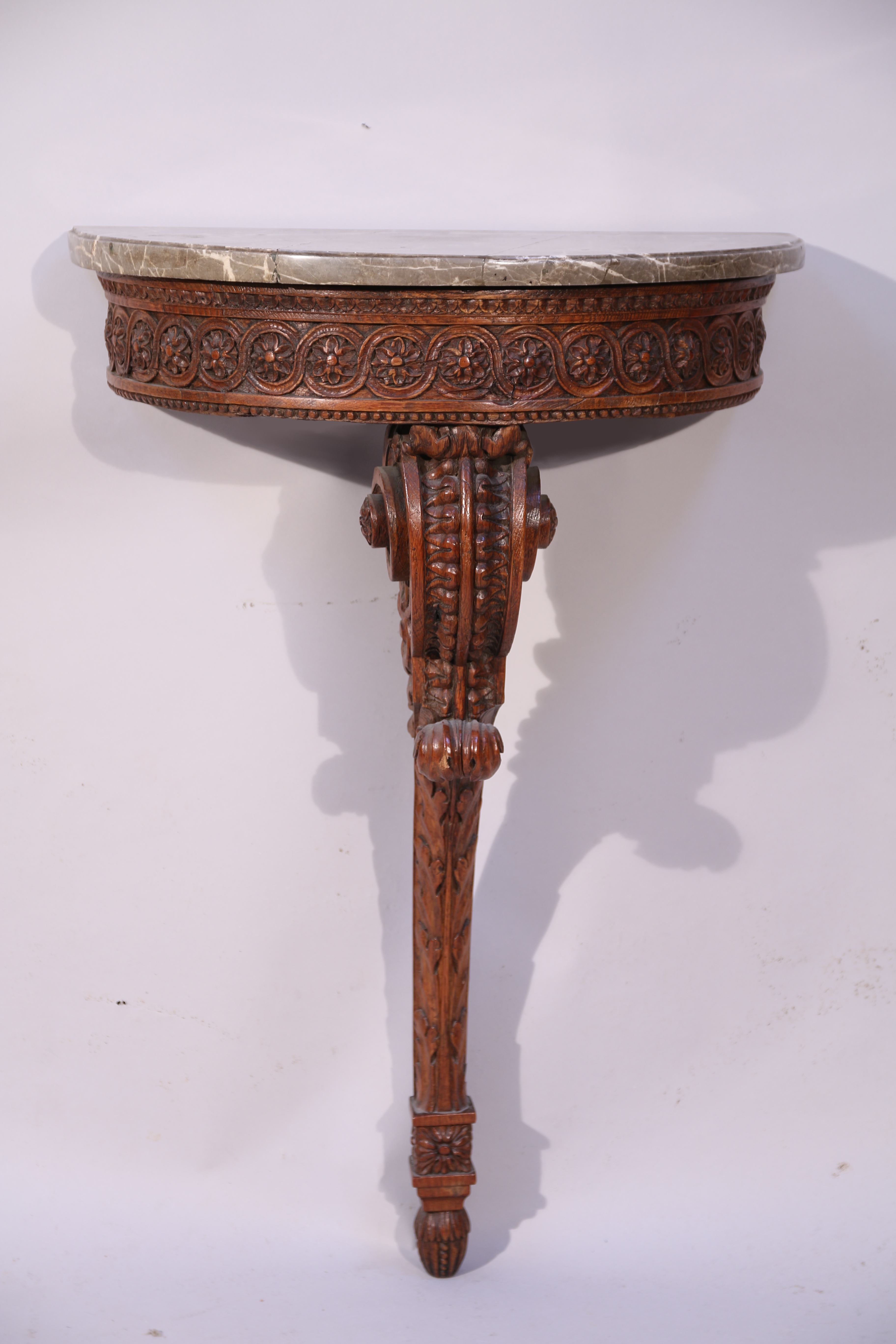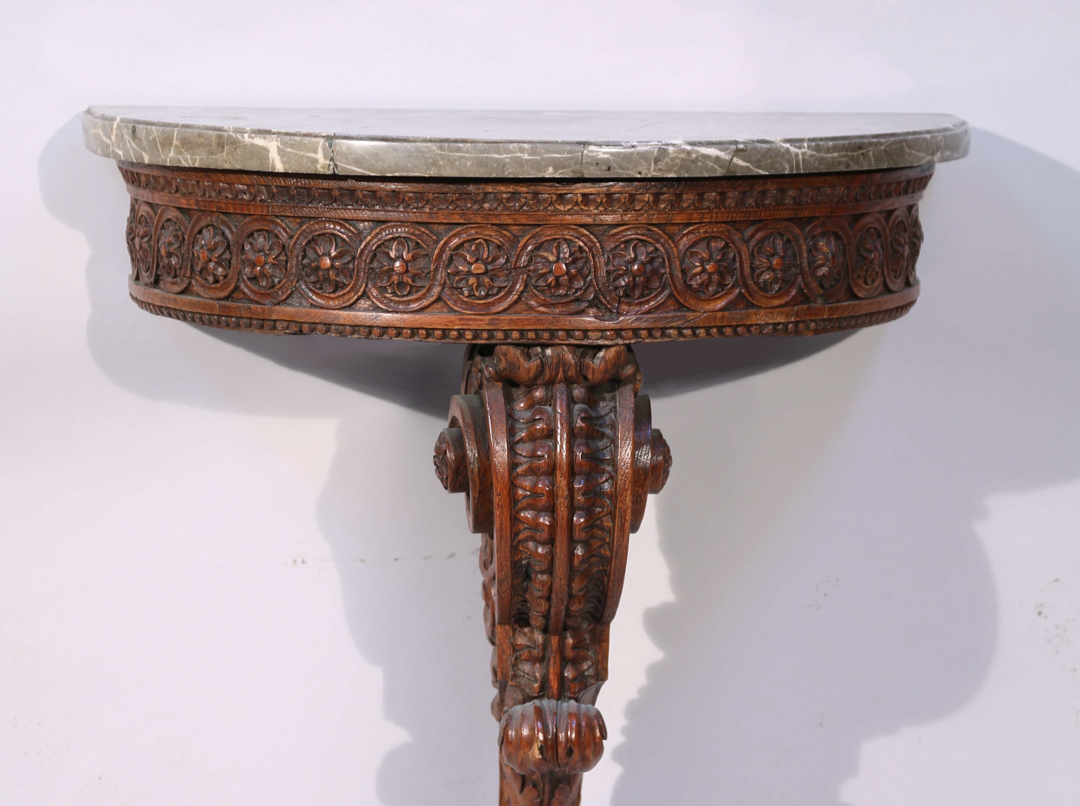 de forme demi lune, en chêne sculpté et mouluré de fleurs épanouies dans des entrelacs en ceinture. Reposant sur un pied à enroulement orné de feuilles d'acanthes se terminant par un fruit genre grenade. Coiffée d'un marbre (accidenté).