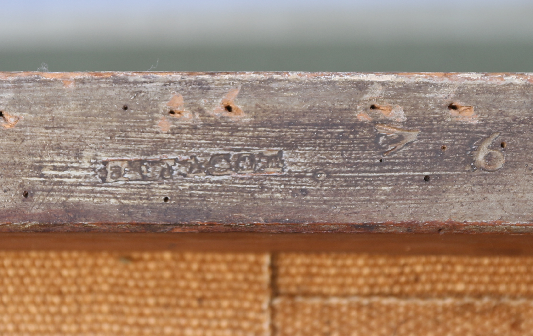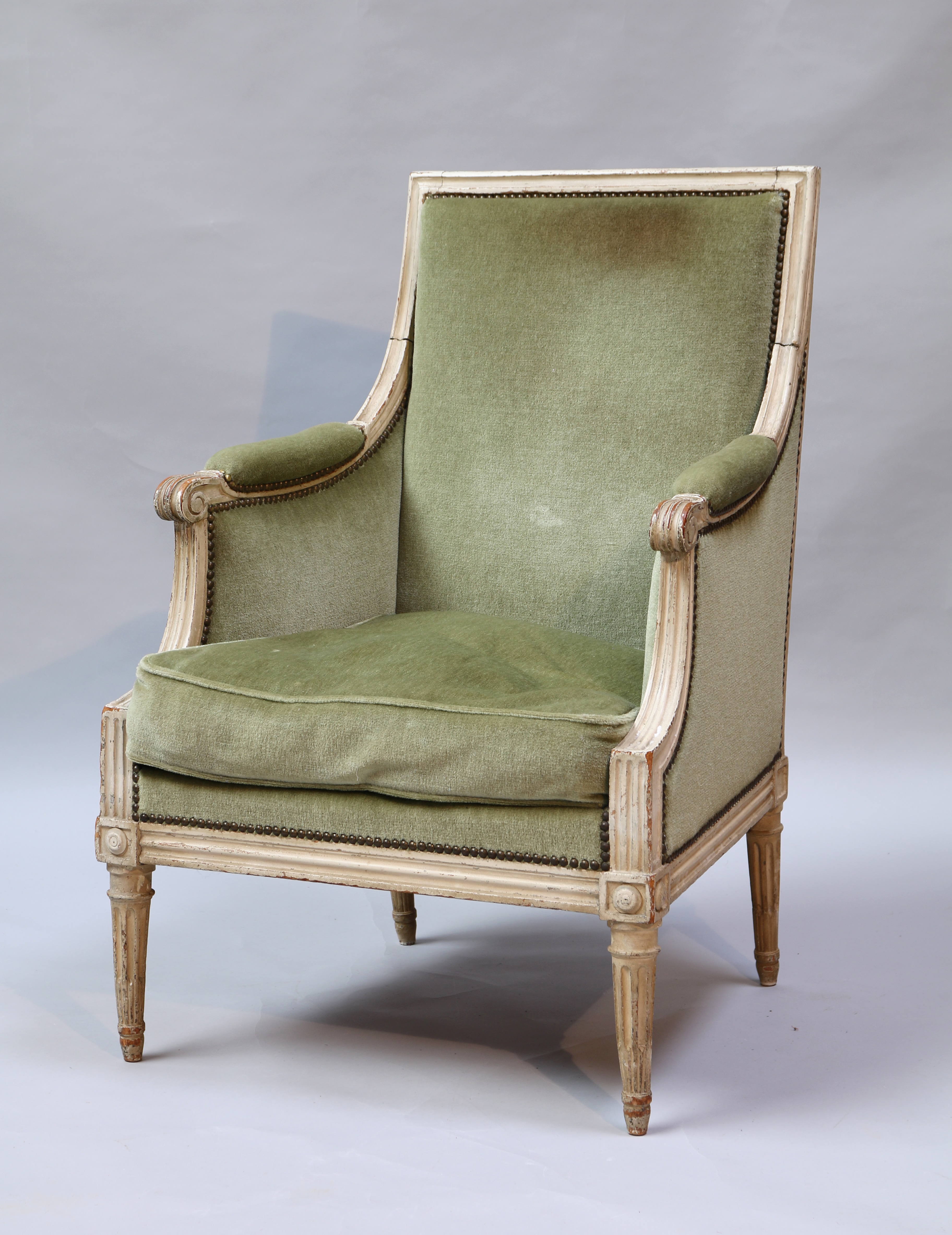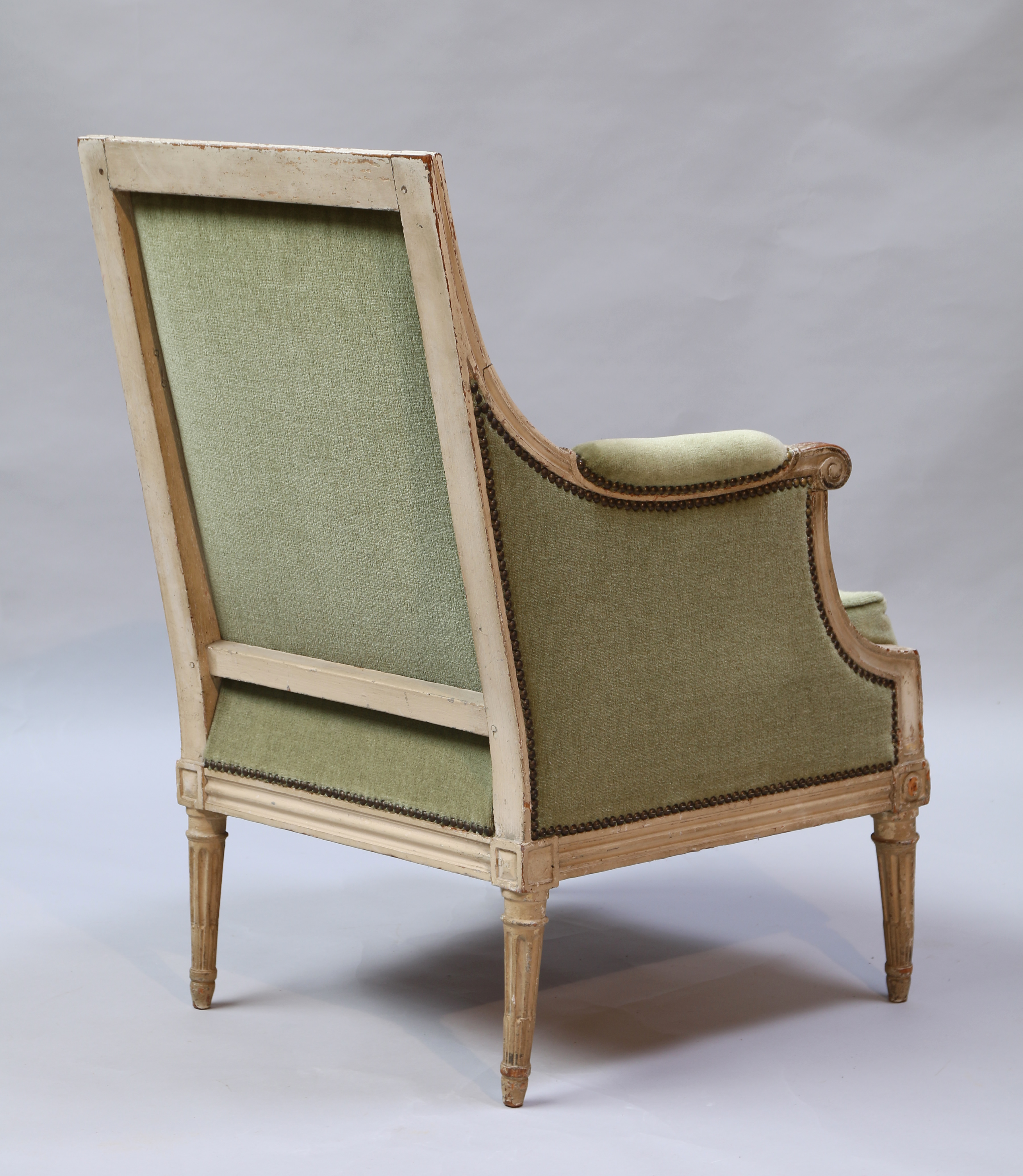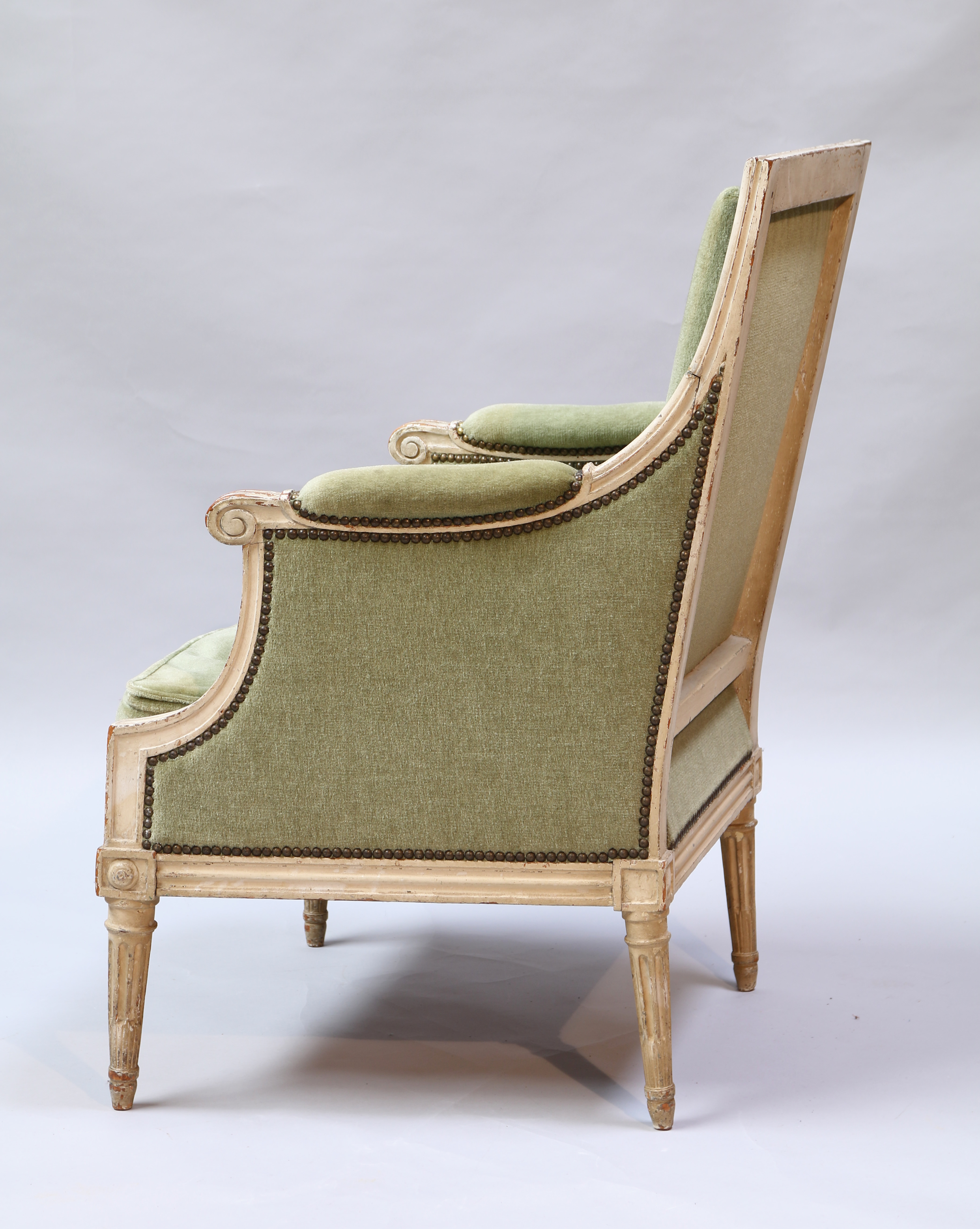 Accotoirs à manchettes terminés par un enroulement, console en cavet. Elle repose sur quatre pieds fuselés, cannelés, et rudentés à dés de raccordement antérieurs à disque.