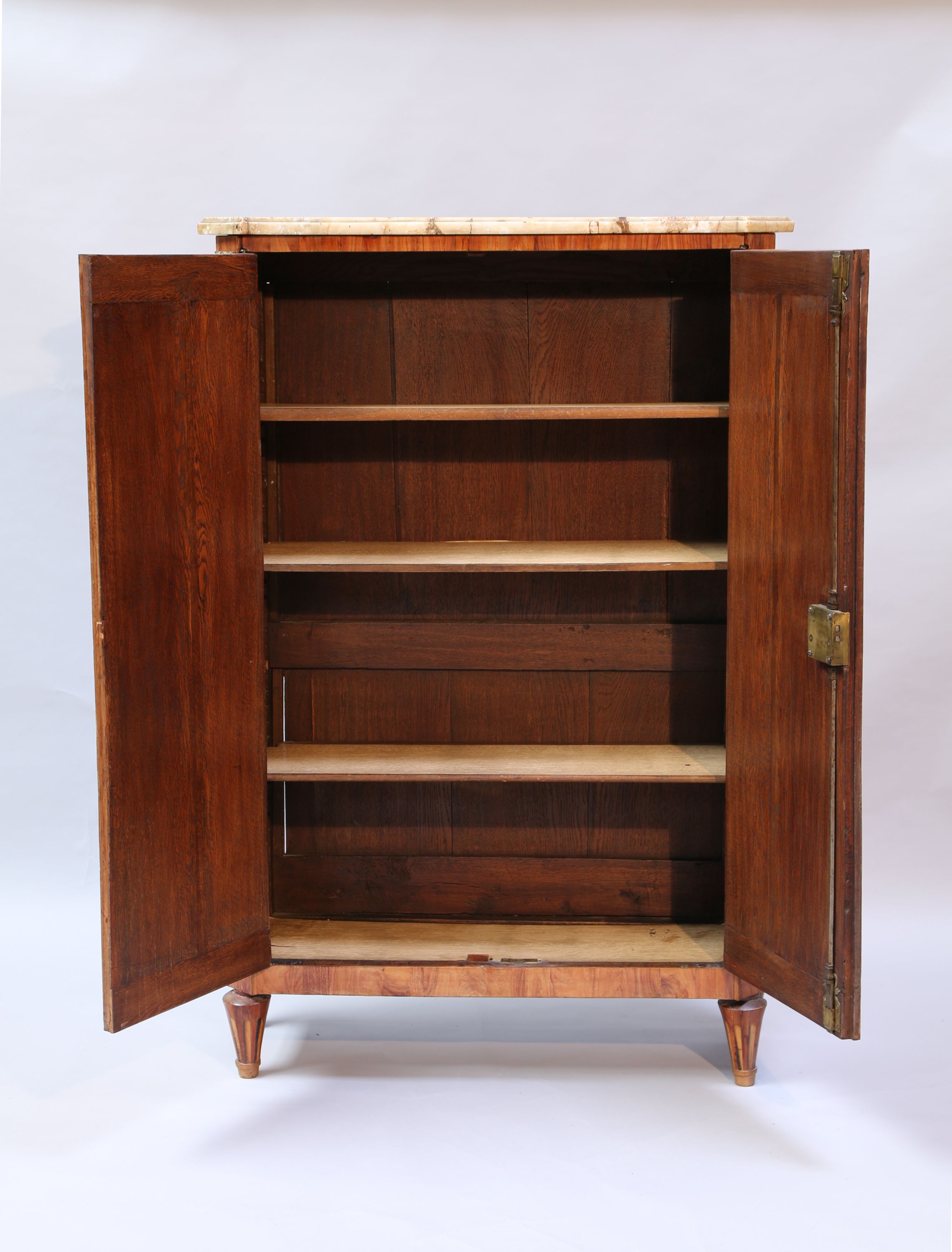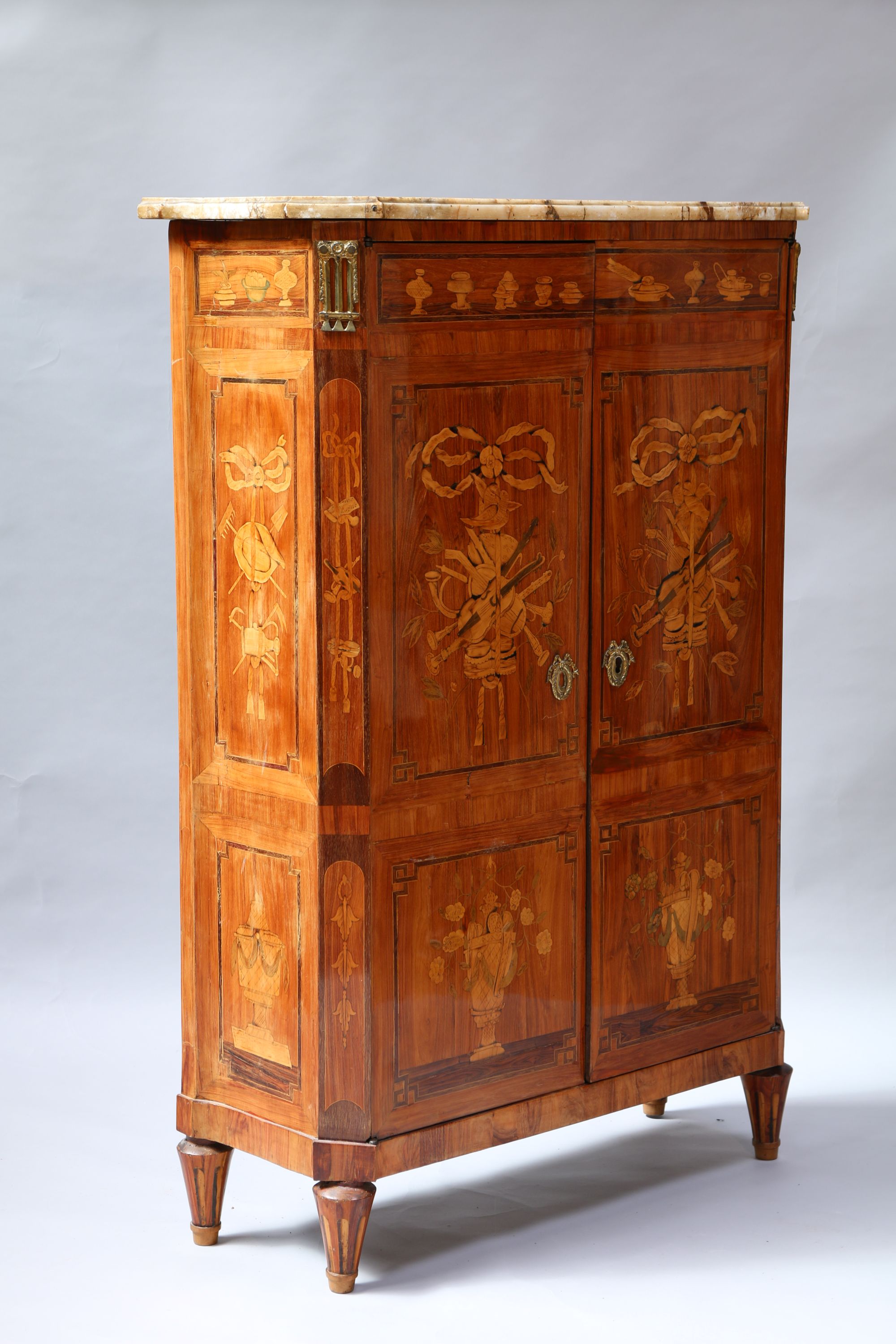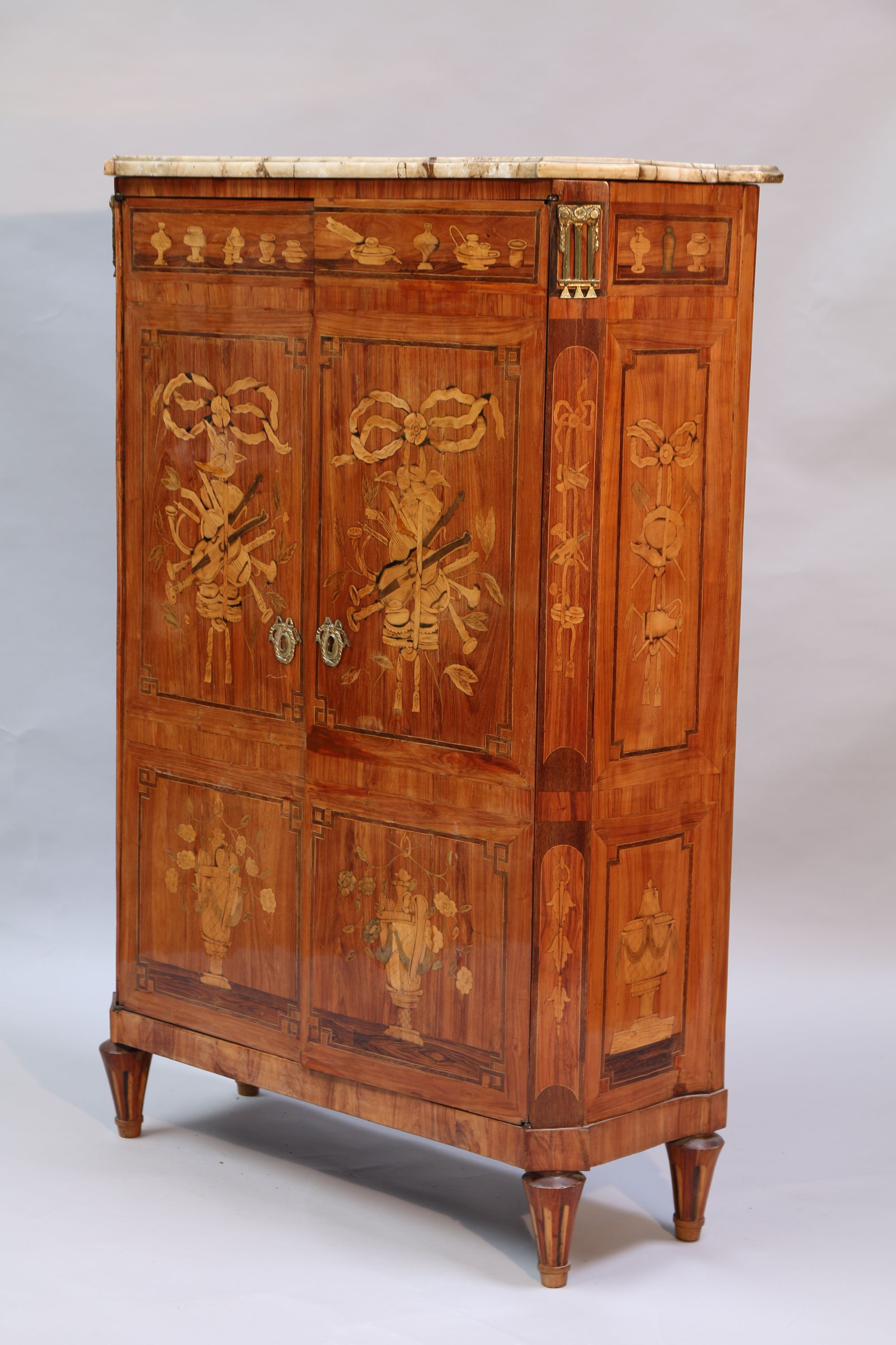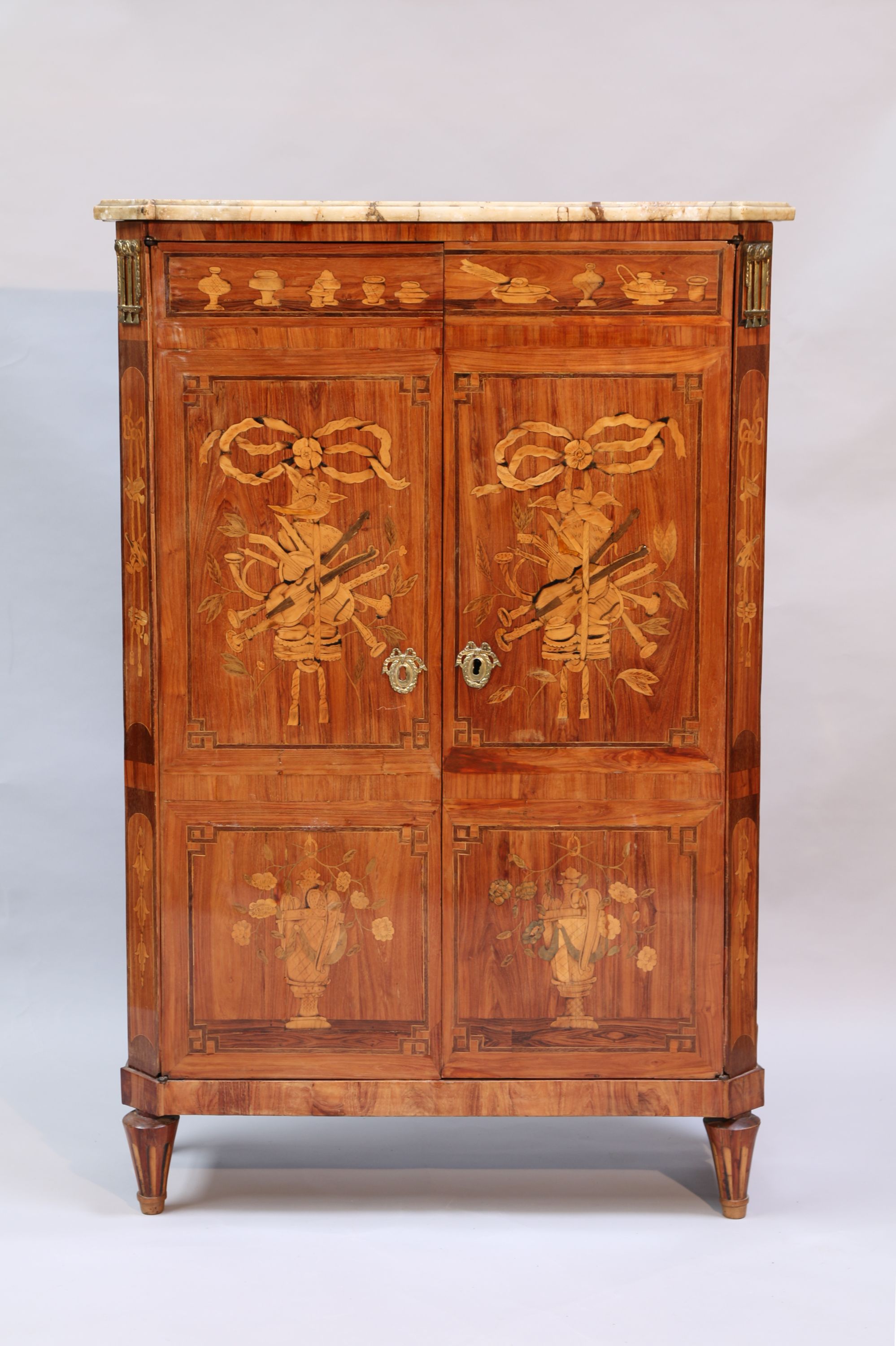 ARMOIRE à MUSIQUE de forme rectangulaire en placage de bois de rose ouvrant par deux portes richement marquetées d'objets domestiques, trophées musicaux retenus par un ruban noué et vases fleuris. Les côtés lègèrement évasés marquetés de trophées agraires et vases fleuris. Montants antérieurs à pan coupé enrichis de bronzes dorés triglyphes. Elle repose sur quatre pieds fuselés à cannelures simulées. Dessus de marbre blanc (accidenté et restauré).