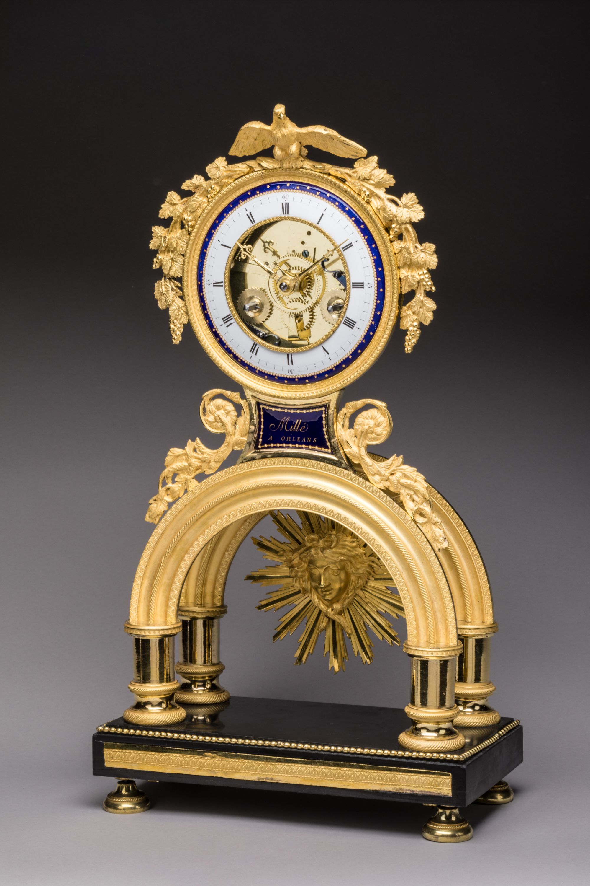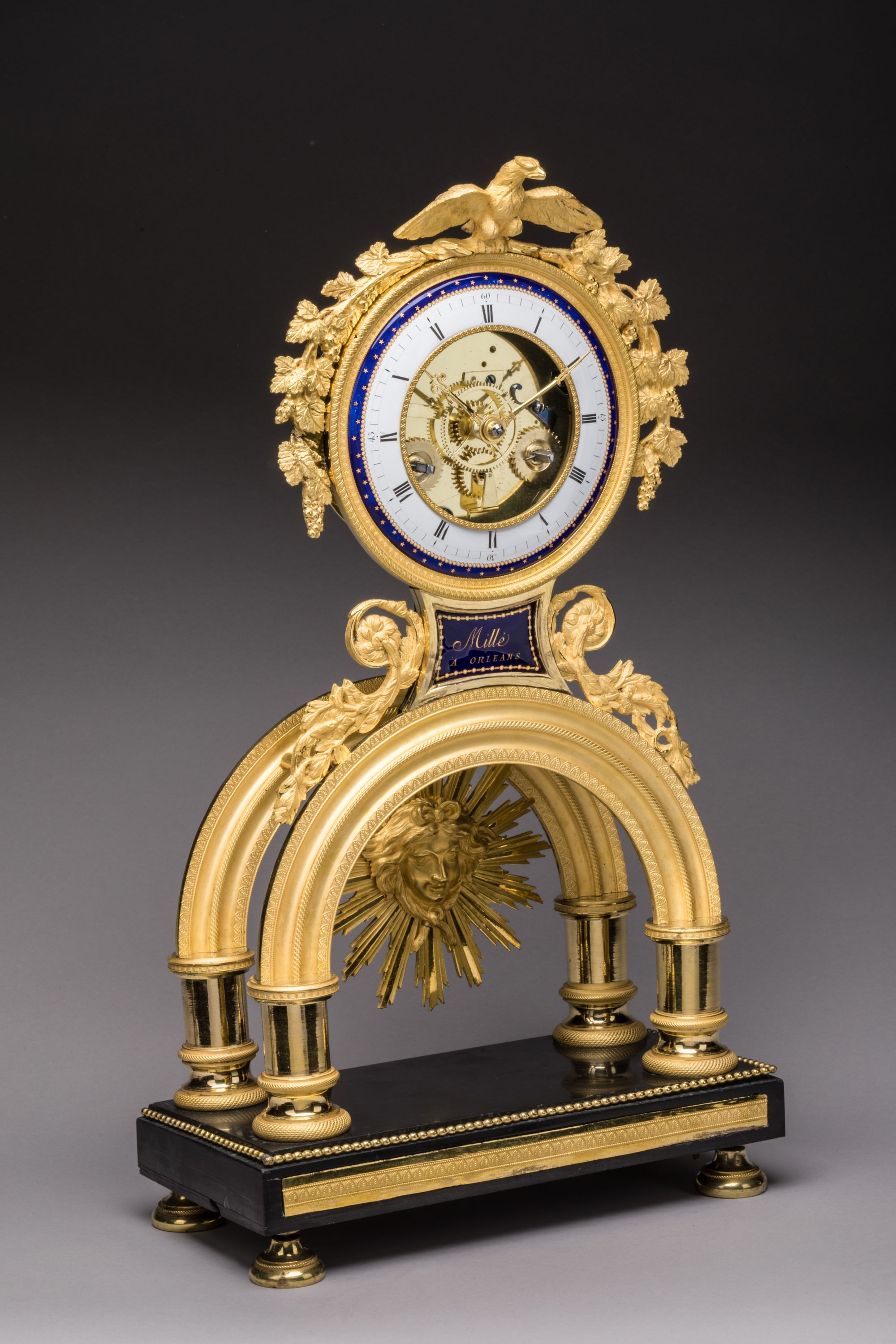 La vogue des pendules dites "squelette" apparaît à la fin du règne de Louis XVI et désigne une forme de pendules laissant apparaître le mécanisme complexe de l'horlogerie par un évidement circulaire dans le cadran. Les progrès scientifiques de la fin de ce siècle encouragent les horlogers à faire la démonstration de leur art et à rompre avec l'ornementation formelle des pendules à sujets. Leur dépouillement s'explique aussi par la pénurie des matières premières qui sévit alors. On voit ainsi se développer une esthétique nouvelle, née des Lumières, et qui préfigure l'ère industrielle. Héritières des pendules portiques de la seconde moitié du XVIIIe siècle, les pendules "squelette" leur empruntent souvent leur forme verticale et reposent généralement sur une arche semi-circulaire supportée par des colonnettes, comme ce modèle de Millé.