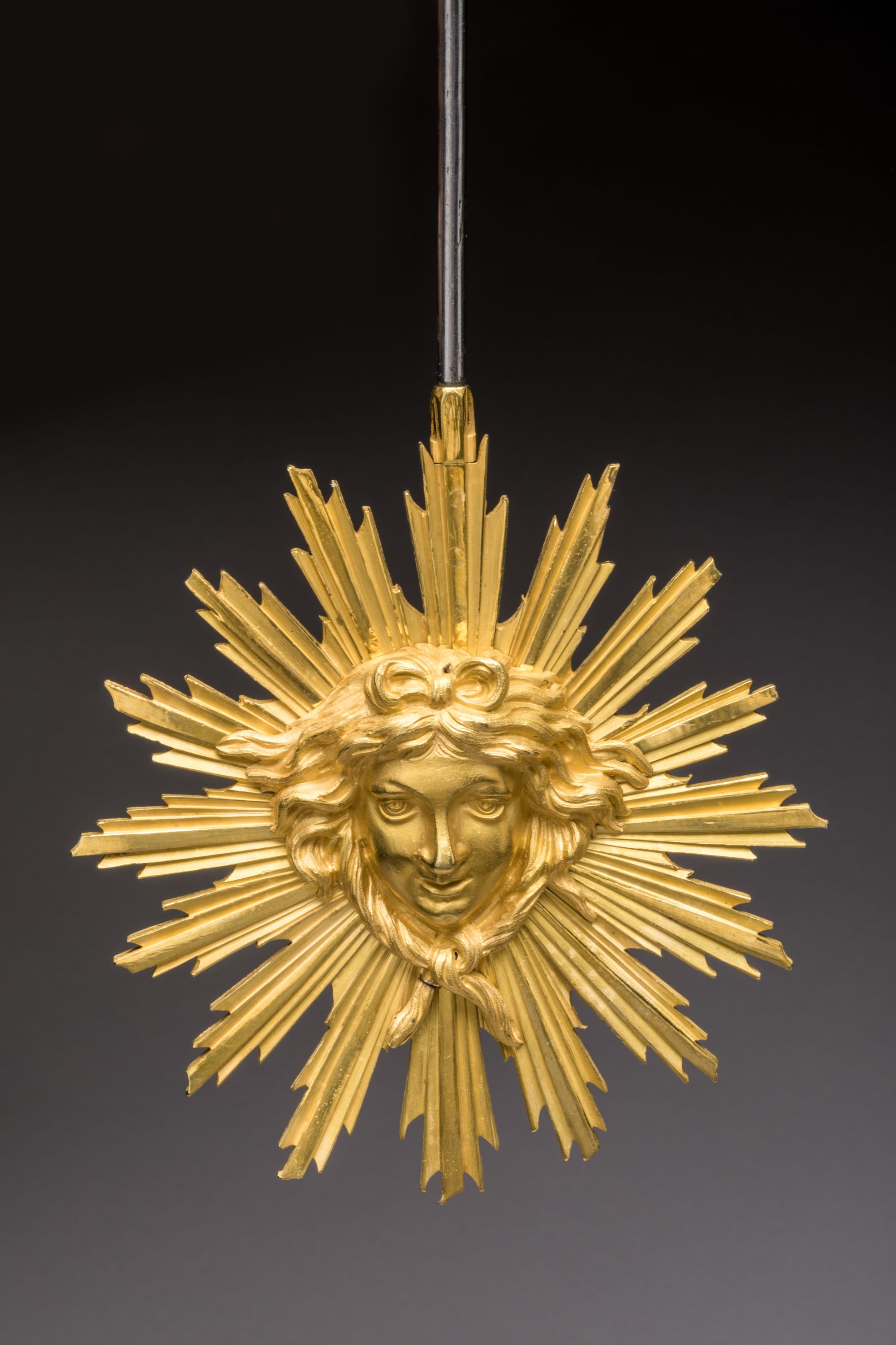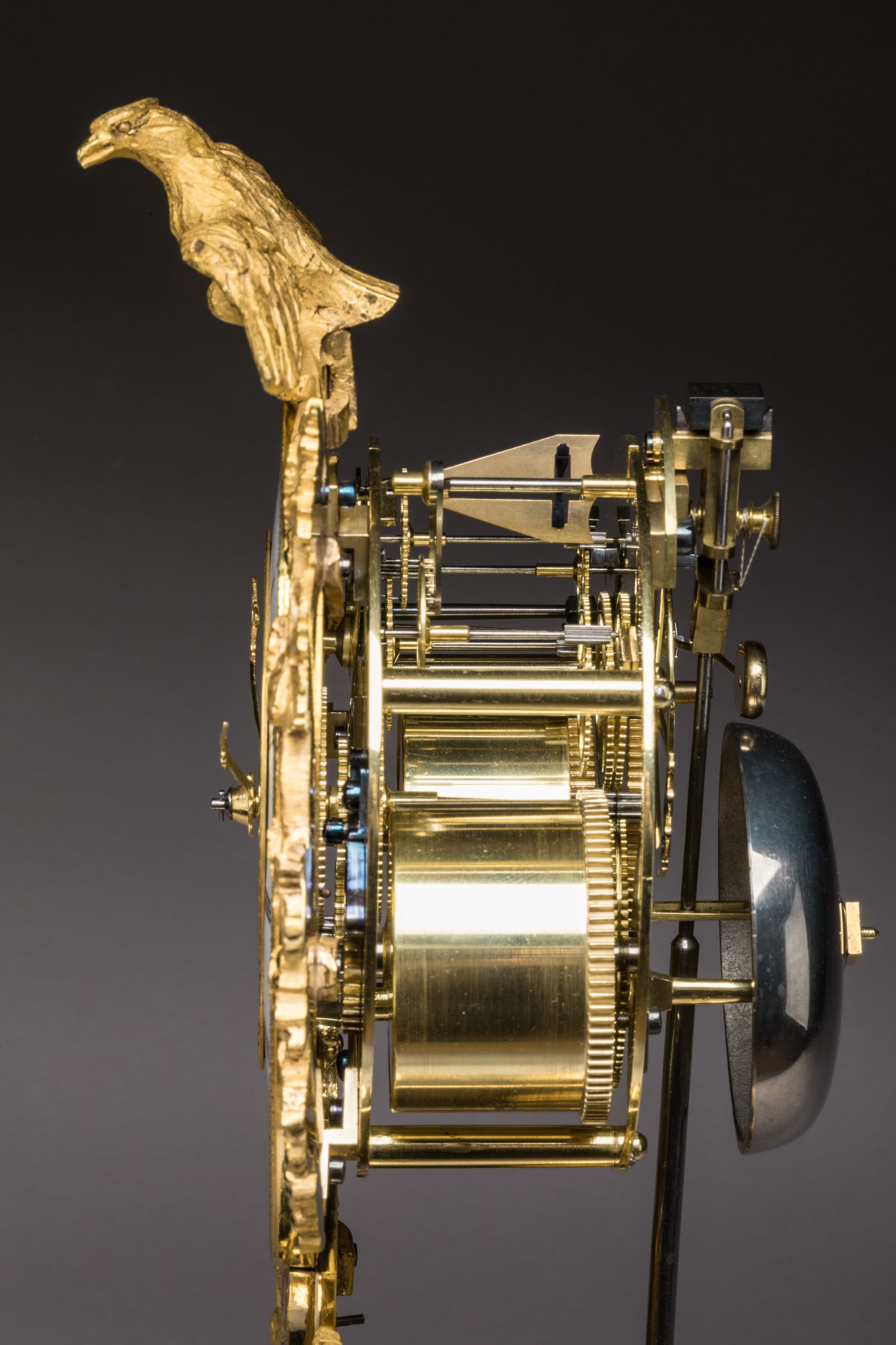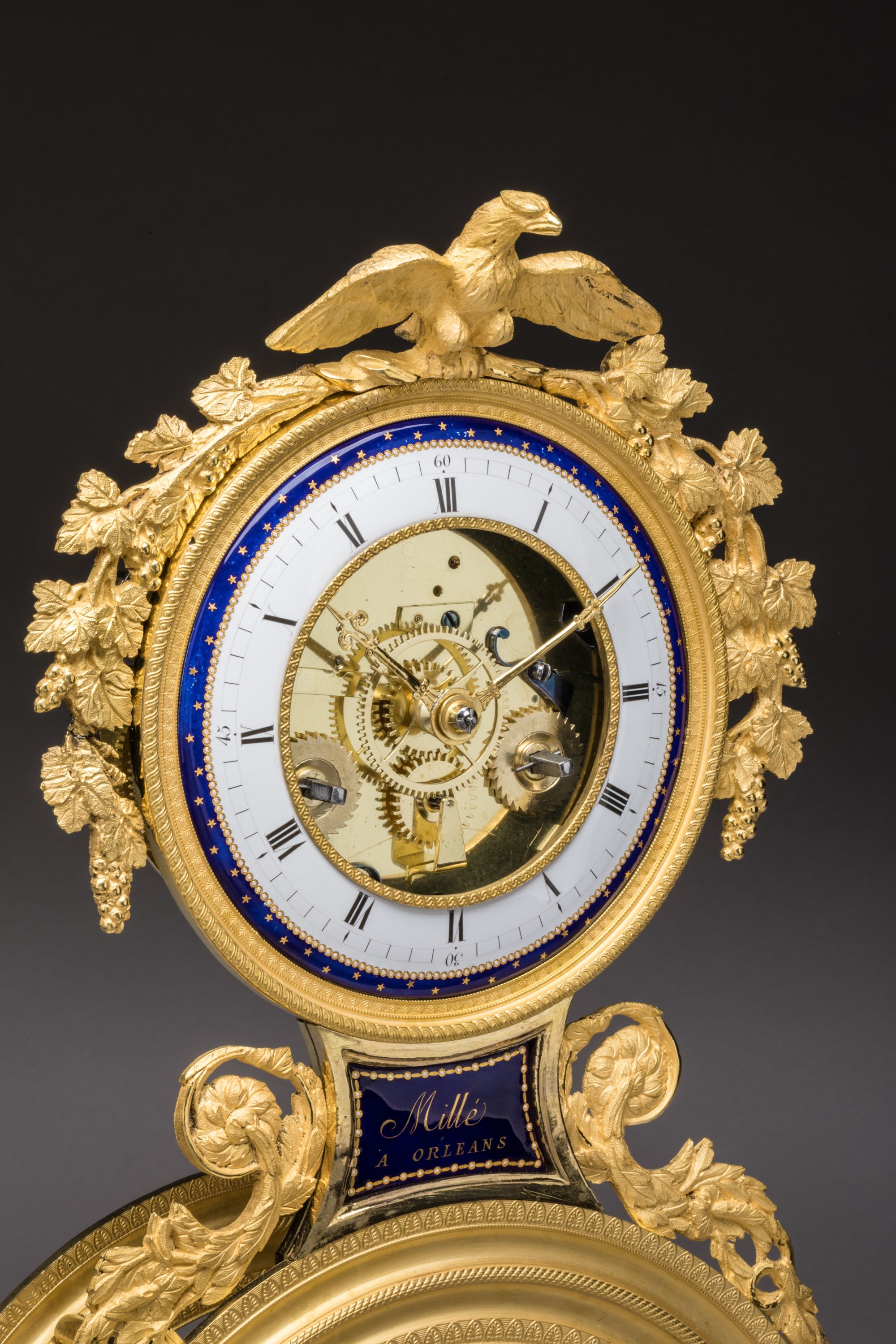 Le cadran émaillé blanc présente des chiffres romains pour les heures et des chiffres arabes pour les minutes. Il est cerclé d'émail bleu à semis d'étoiles d'or et est sommé d'un aigle aux ailes déployées. À ses côtés se déroulent des pampres de vigne et des grappes de raisin. Le mouvement repose sur une arcature à frise de palmettes et un cartouche émaillé et flanqué d'entrelacs feuillagés, signé MILLÉ à ORLÉANS. Le balancier est orné d'un masque d'Apollon rayonnant.