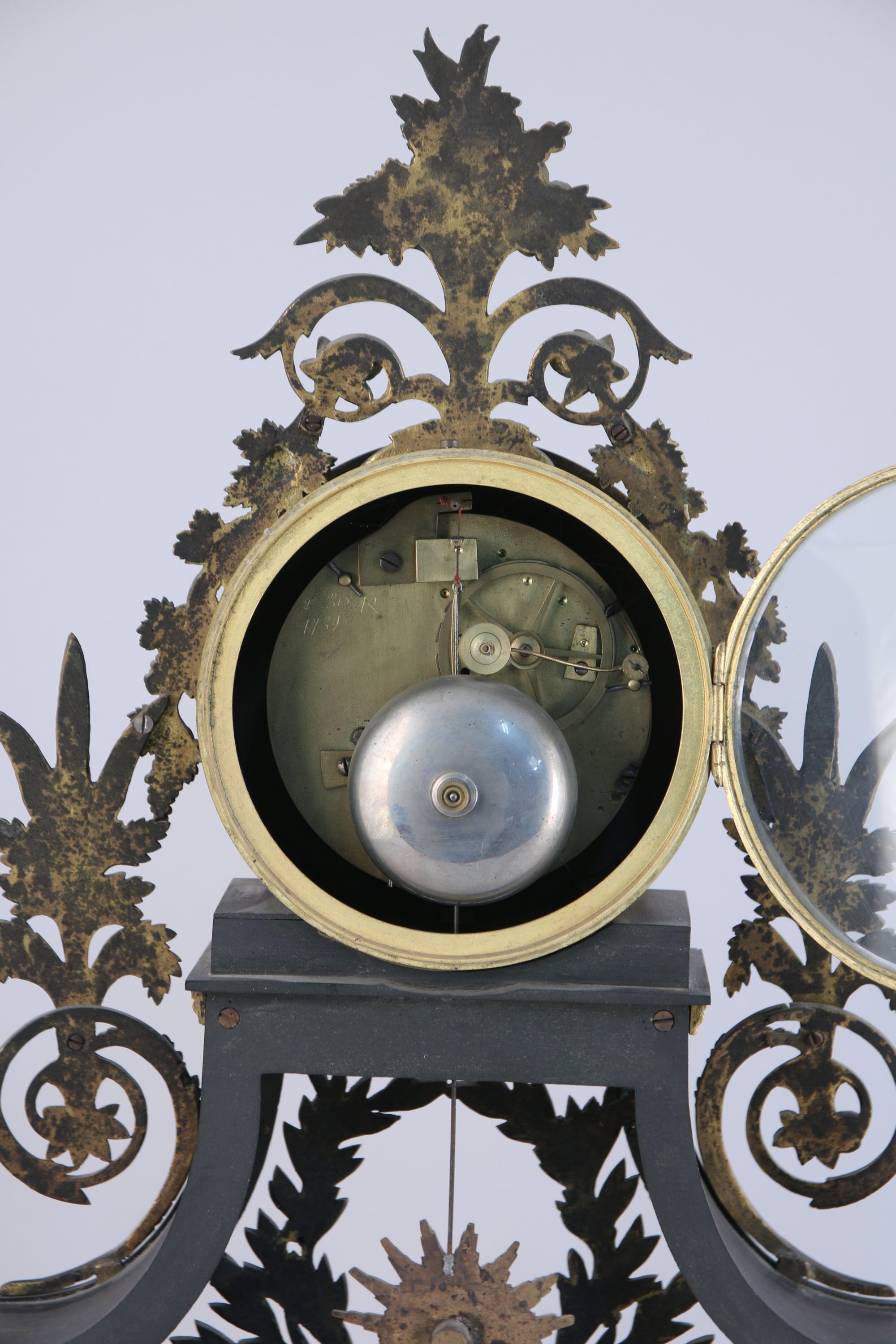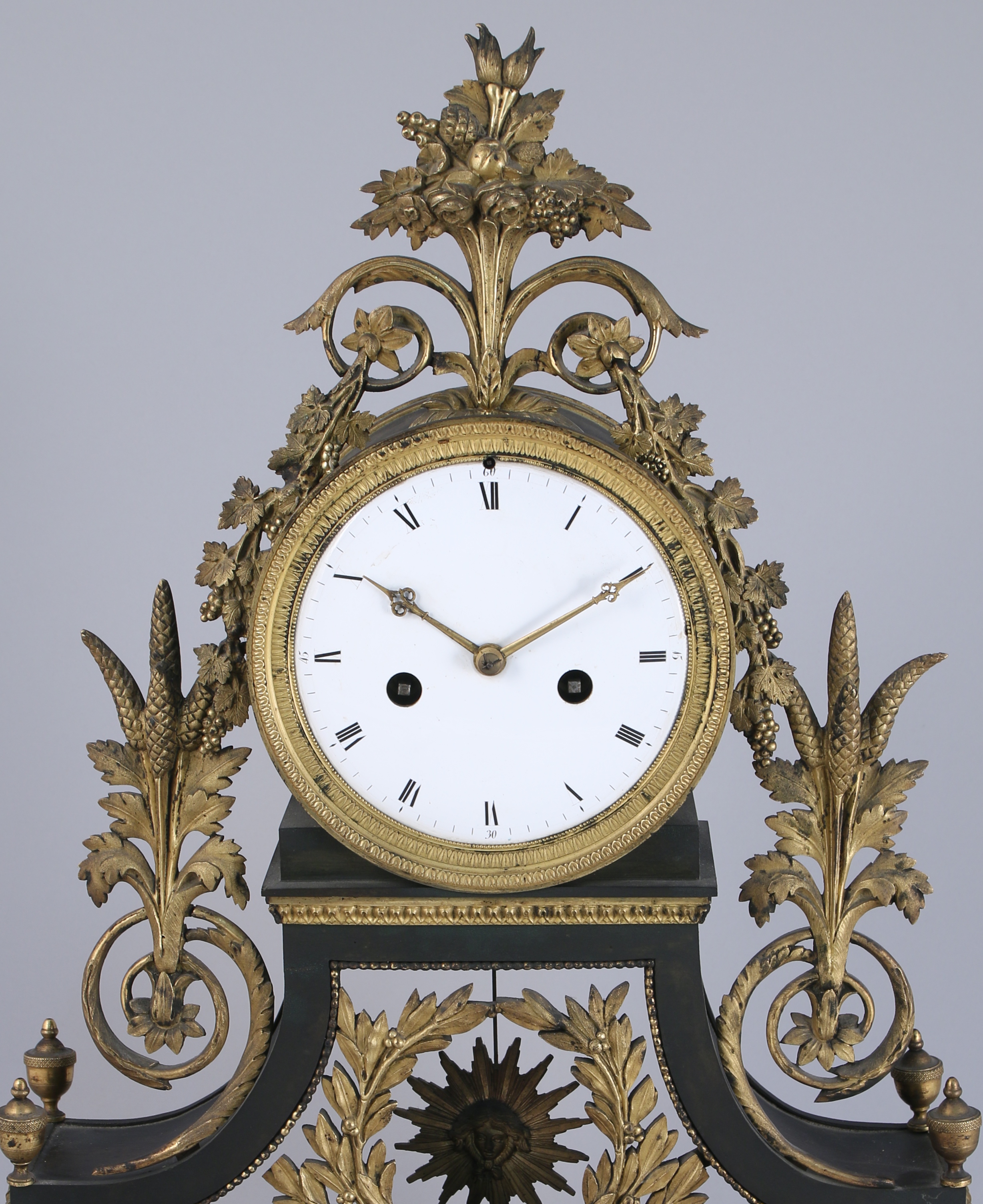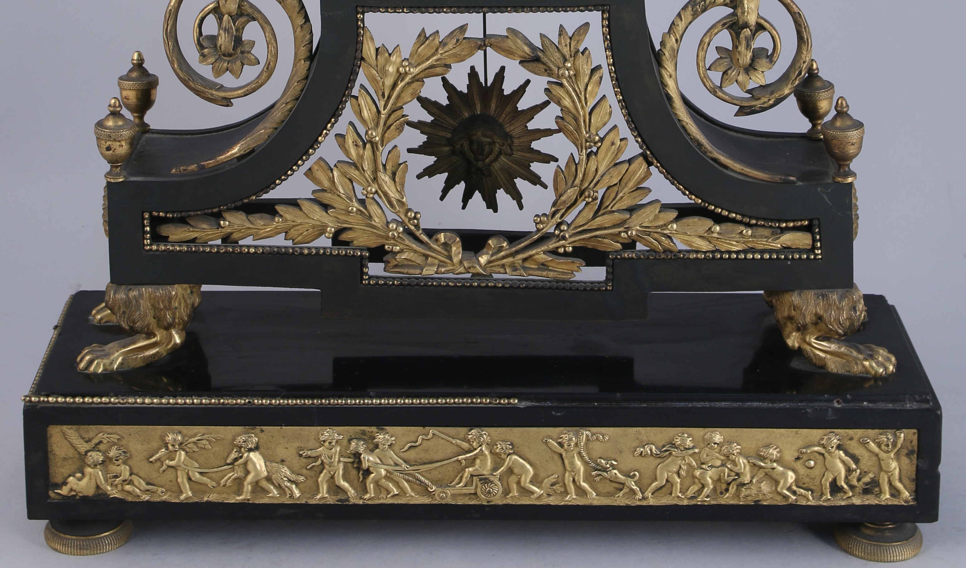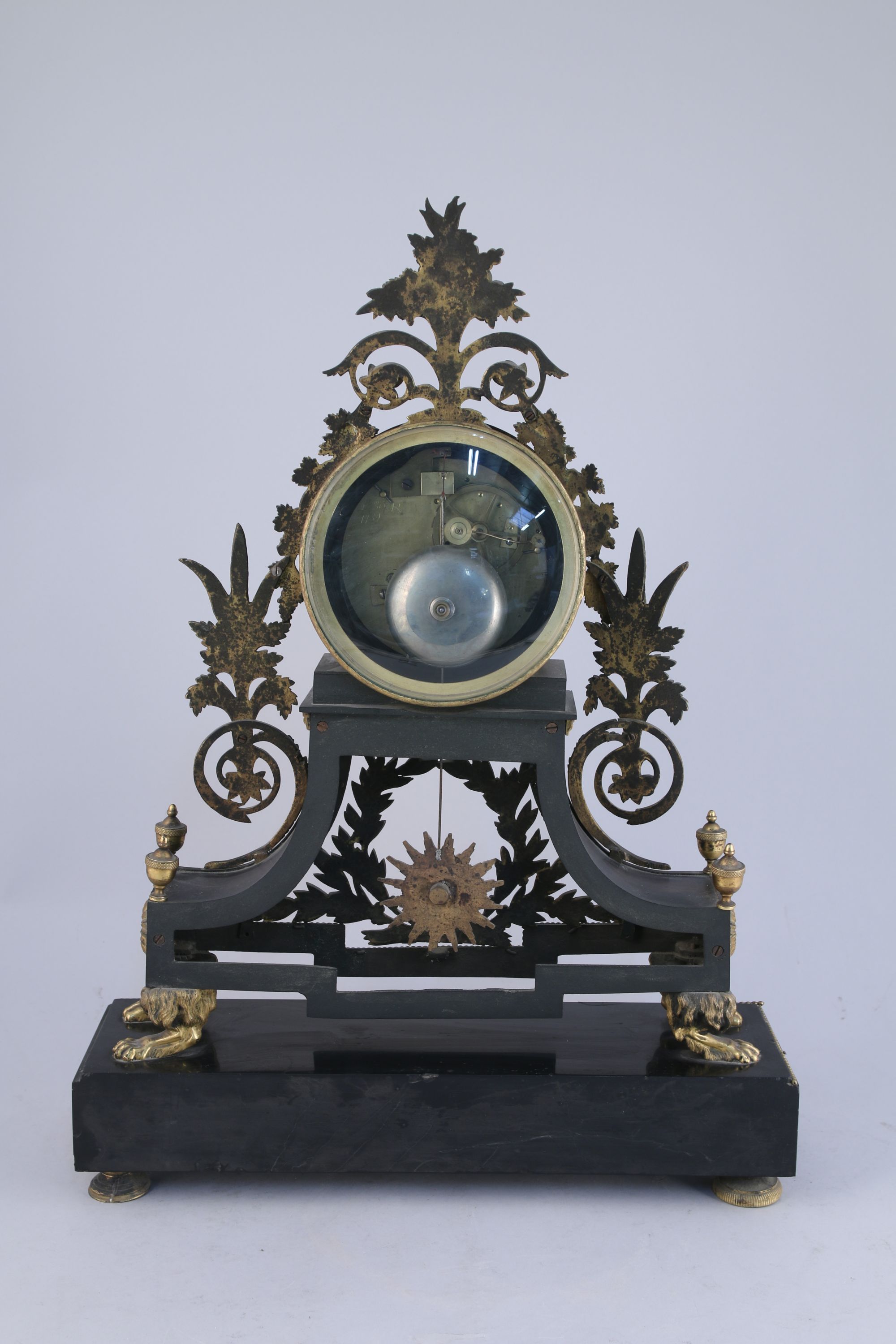 le mouvement circulaire émaillé blanc, figurant les heures en chiffres romains et les heures en chiffres arabes. Accosté de rinceaux végétaux en bouquets et enroulements, surmonté d'un bouquet de fleurs et de fruits à decor ajouré dans la partie basse d'une couronne de laurier. Elle repose sur quatre pieds en pattes de lions. Socle en marbre noir orné d'une frise au char de l'amour. Le balancier présentant un mascaron solaire, mouvement à fil.