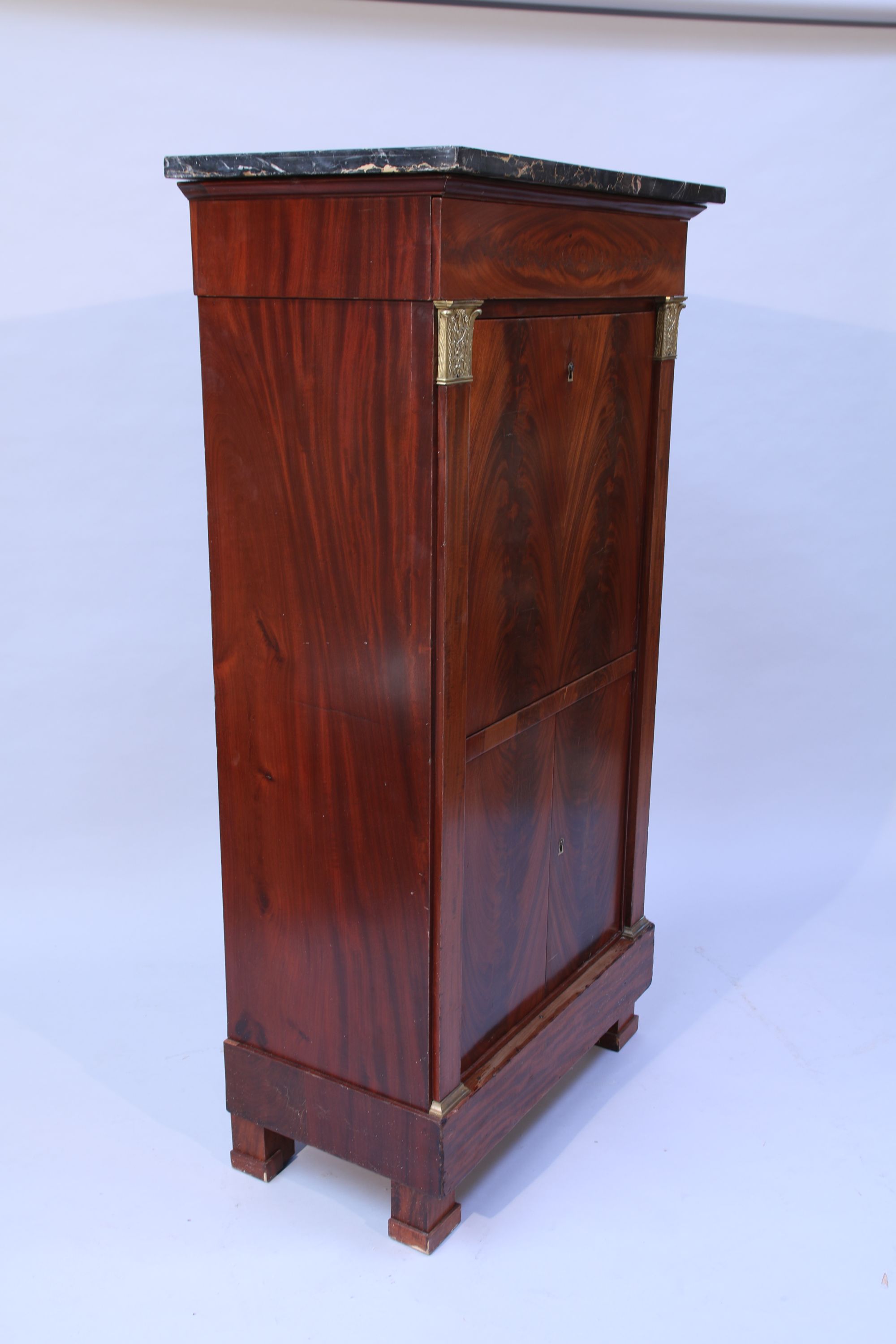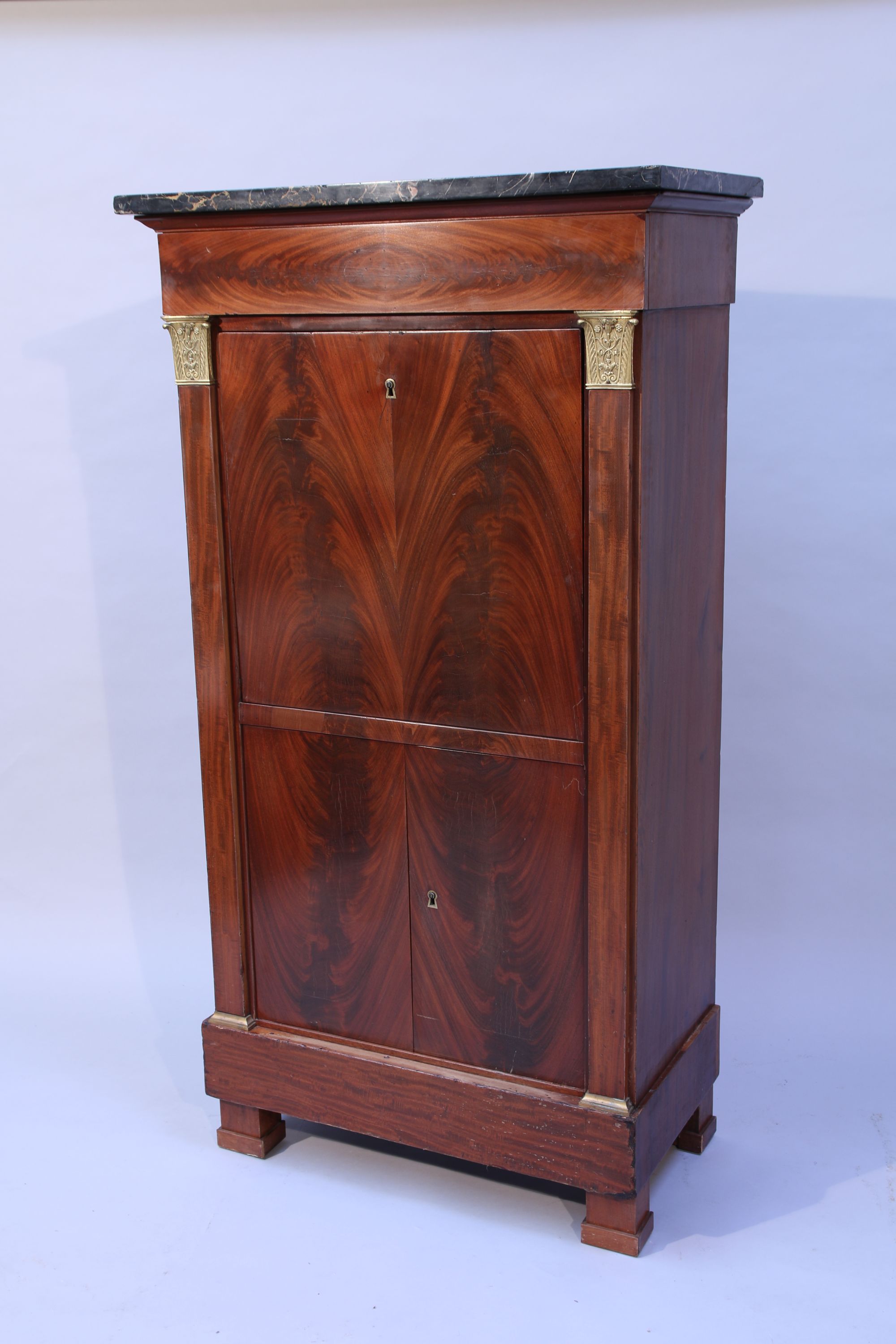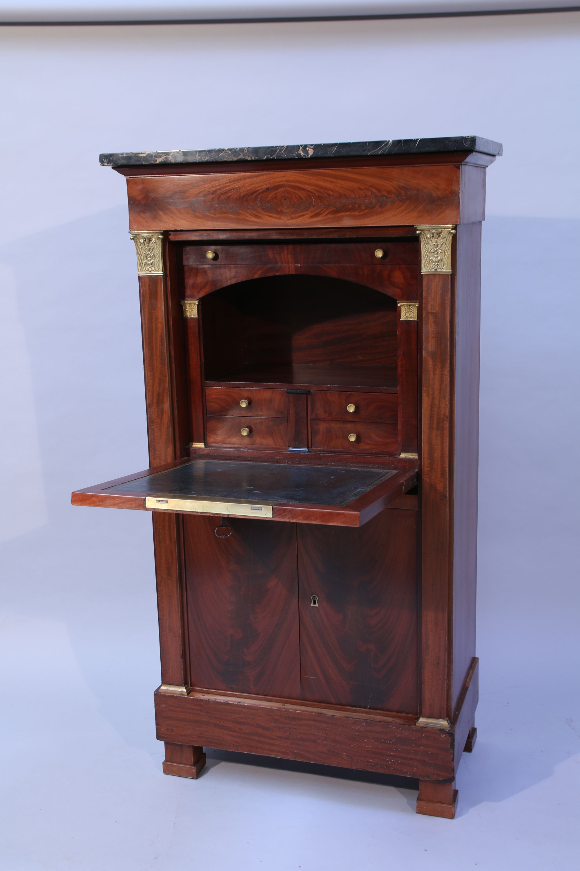 en placage d'acajou flammé. La façade encadrée par deux pilastres ouvre par un tiroir et deux vantaux découvrant trois tiroirs. L'abattant découvre un intérieur architecturé présentant une niche encadrée de cinq tiroirs et d'un secret. Sous-main en maroquin vert. Ornementation de bronzes ciselés et dorés tels que chapiteaux et bases des pilastres, et boutons de tirage. Il repose sur quatre pieds droits. Dessus de marbre Portor (un coin restauré).
