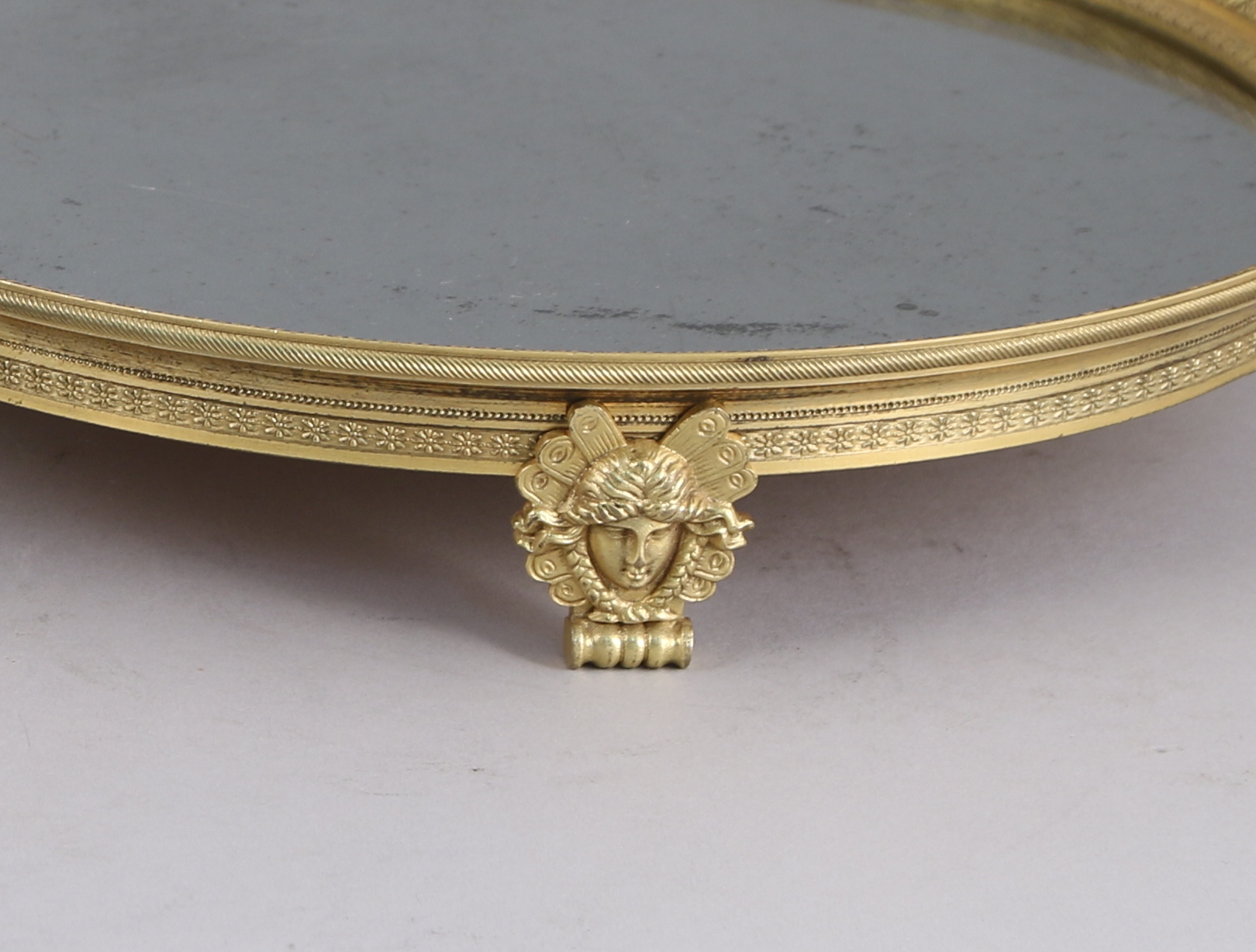 de forme circulaire à fond de glace dans une monture en bronze ciselé et doré à décor de guillochis, rais-de-coeurs, cordes et frise de fleurettes. Ils reposent sur trois pieds à tête de zéphyr.