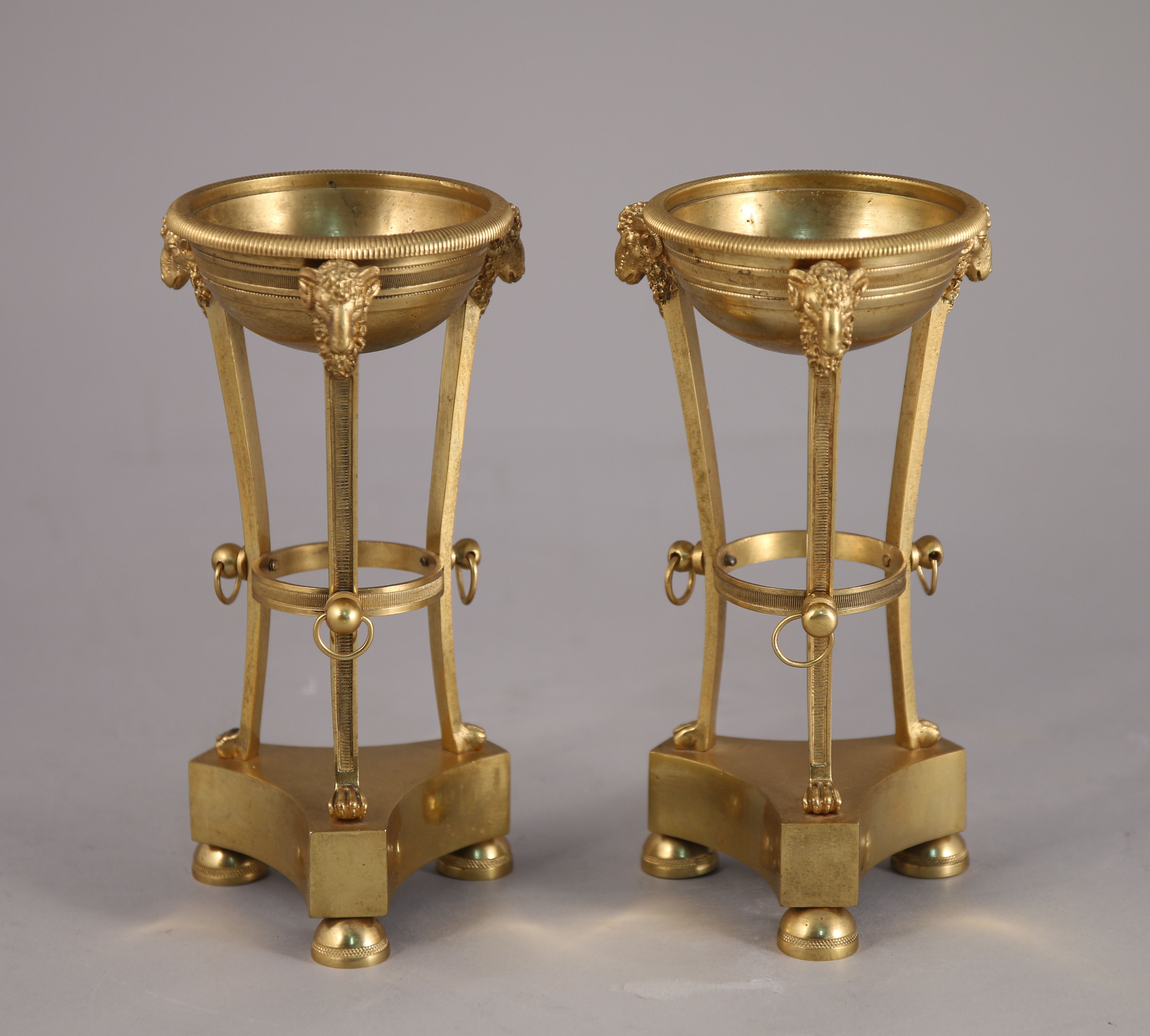 en bronze ciselé et doré en forme d'athénienne. Les trois montants terminés en tête de bélier à pieds griffe reposant sur une base triangulaire échancrée. Piètement tripode en demi-sphères.