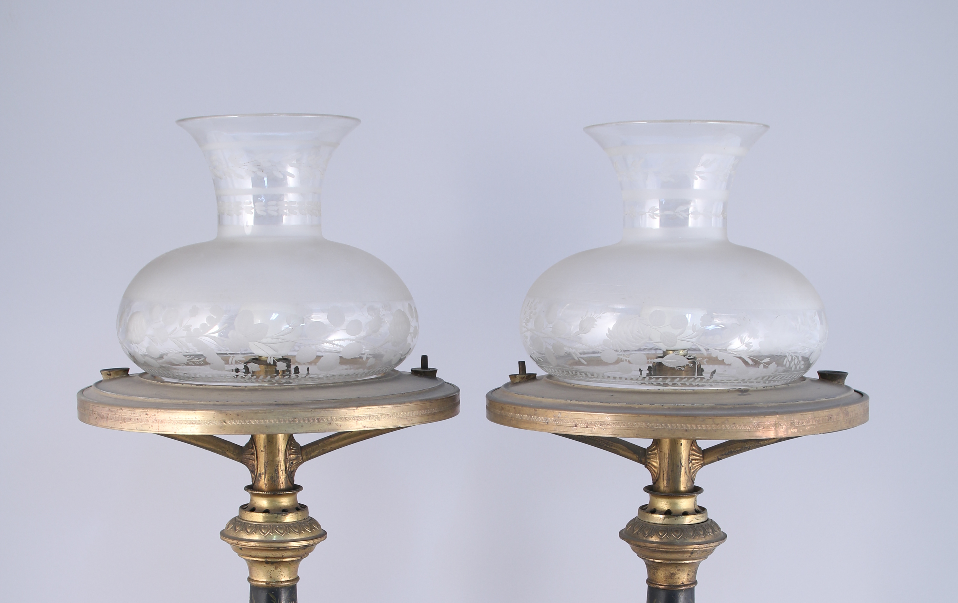 Haut. 69,5 Diam. 26 cm (petits manques et accidents, transformées à l'électricité, sans leurs cheminées).