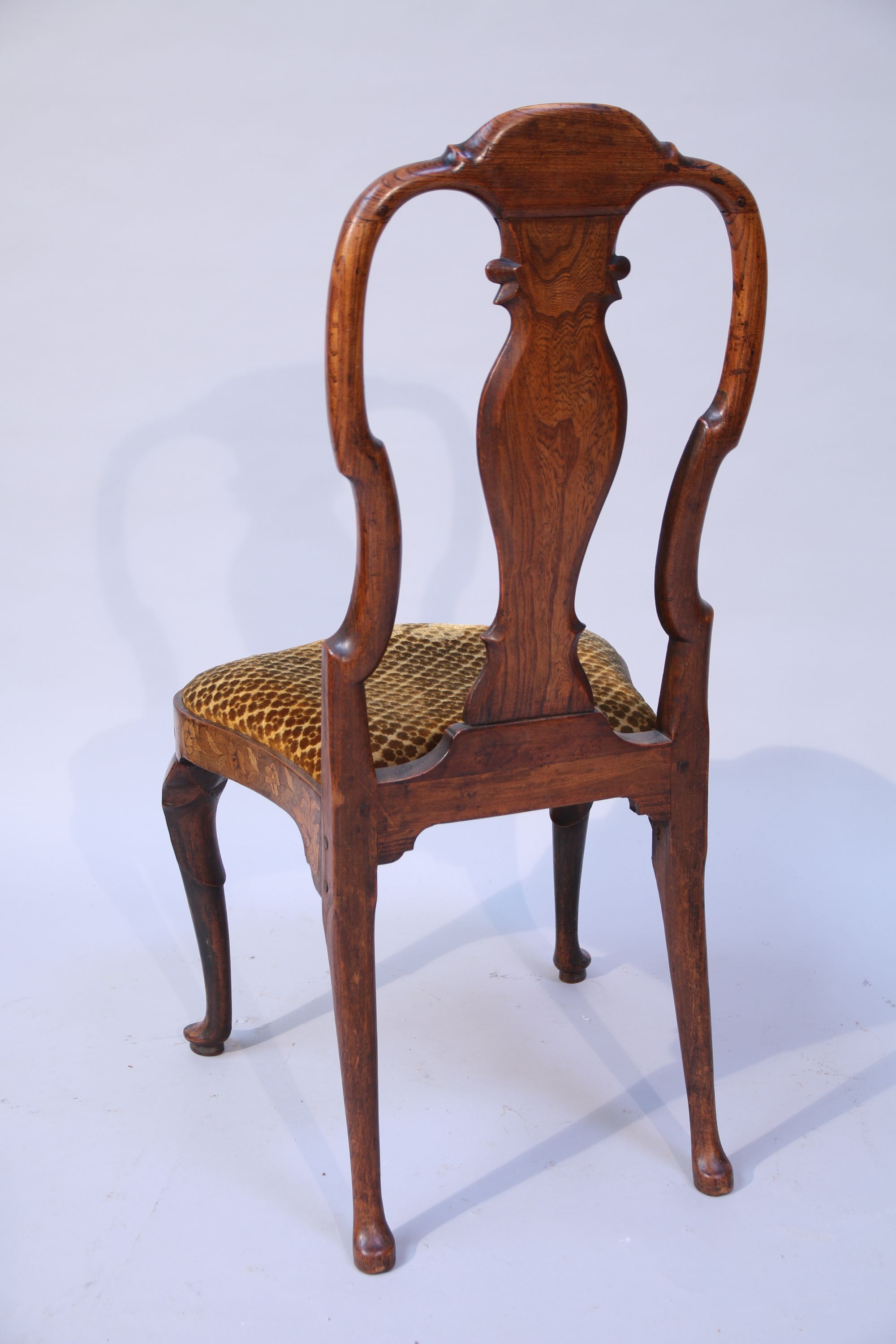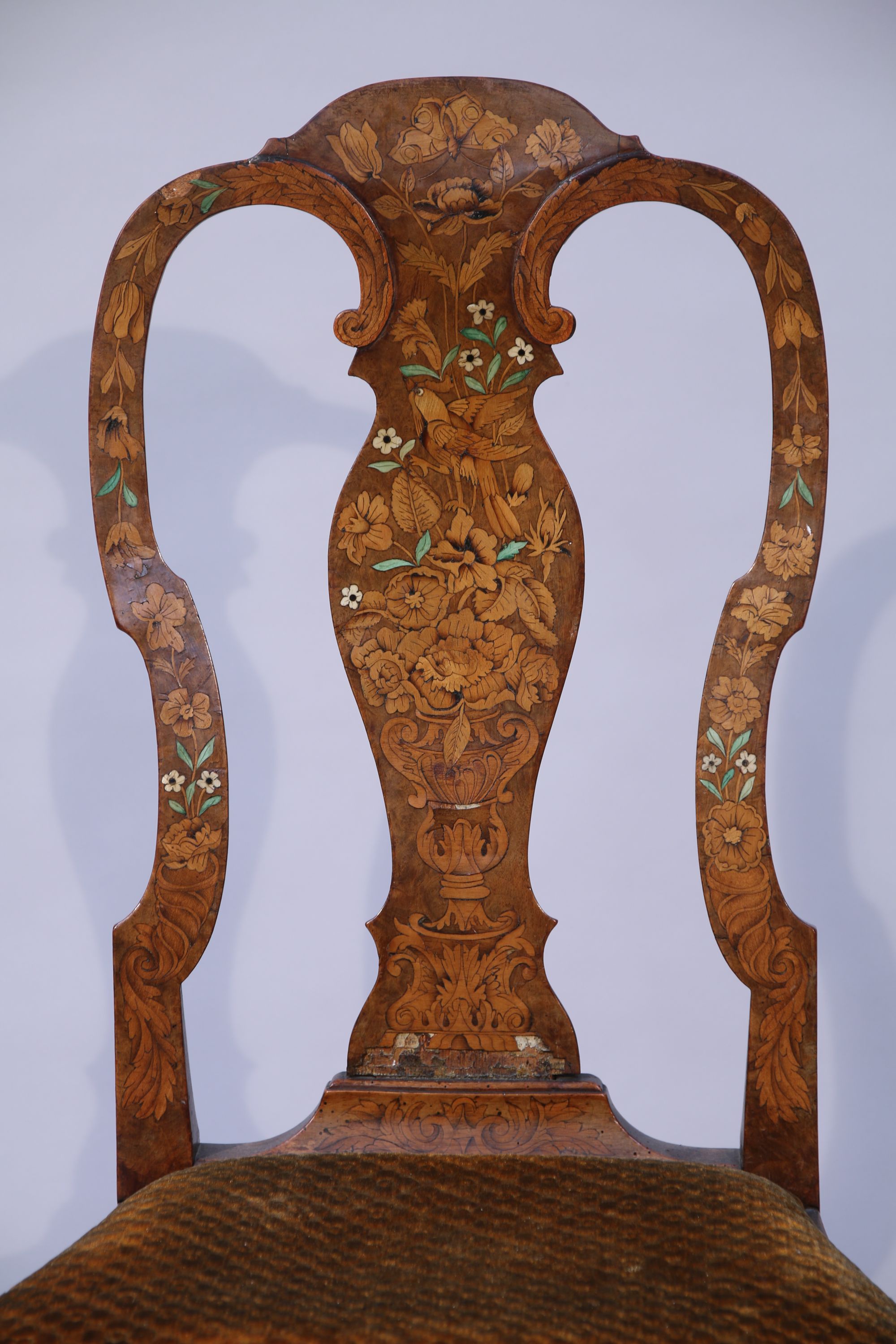 à dossier ajouré légèrement renversé, à décor marqueté d'oiseaux différentiés, de vases fleuris en bois clair, de papillons et de frises végétales aux incrustations vertes et blanches. Les pieds avant galbés.