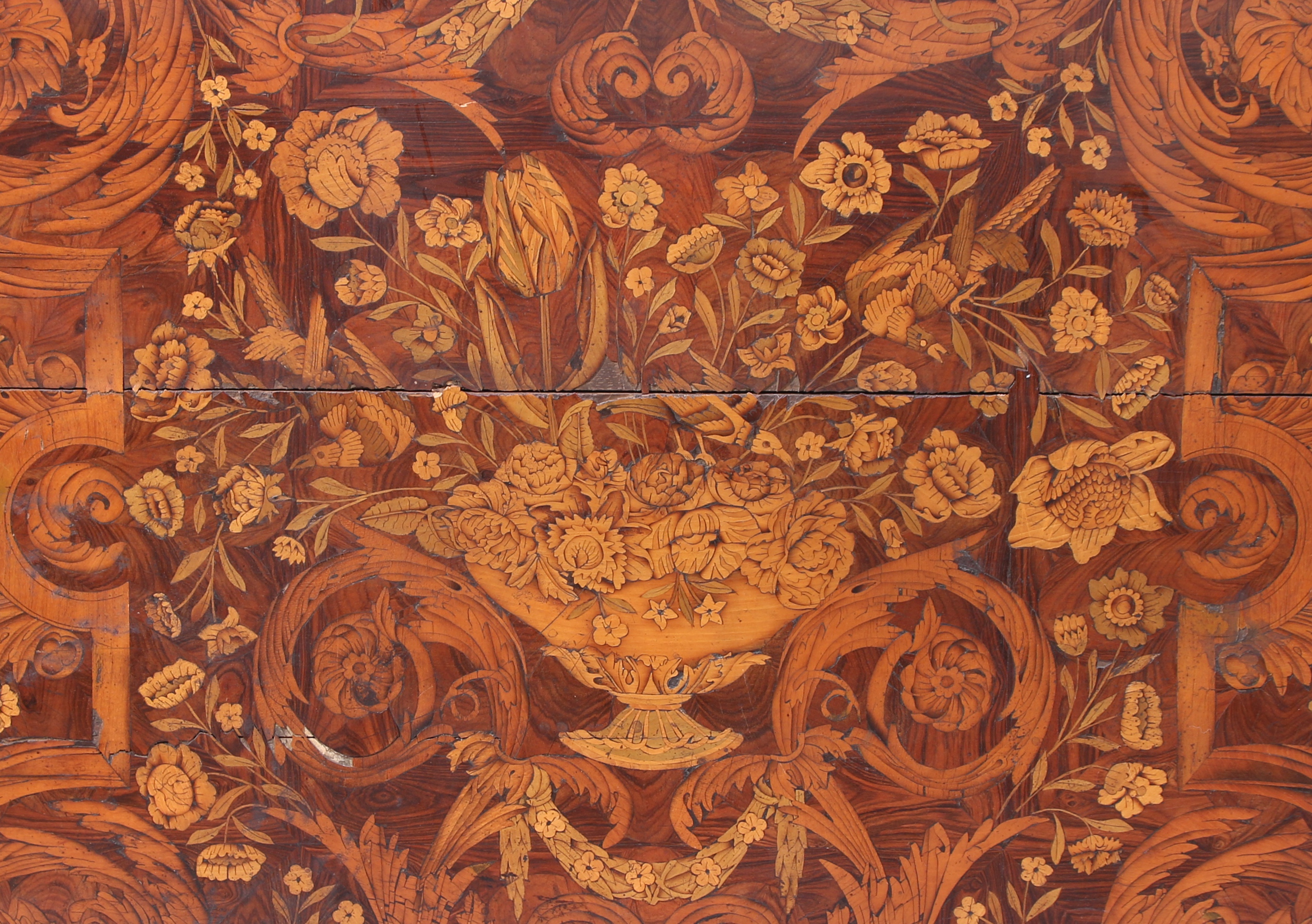 Le meuble entièrement marqueté de bois clair sur fond sombre à la polychromie insolée.