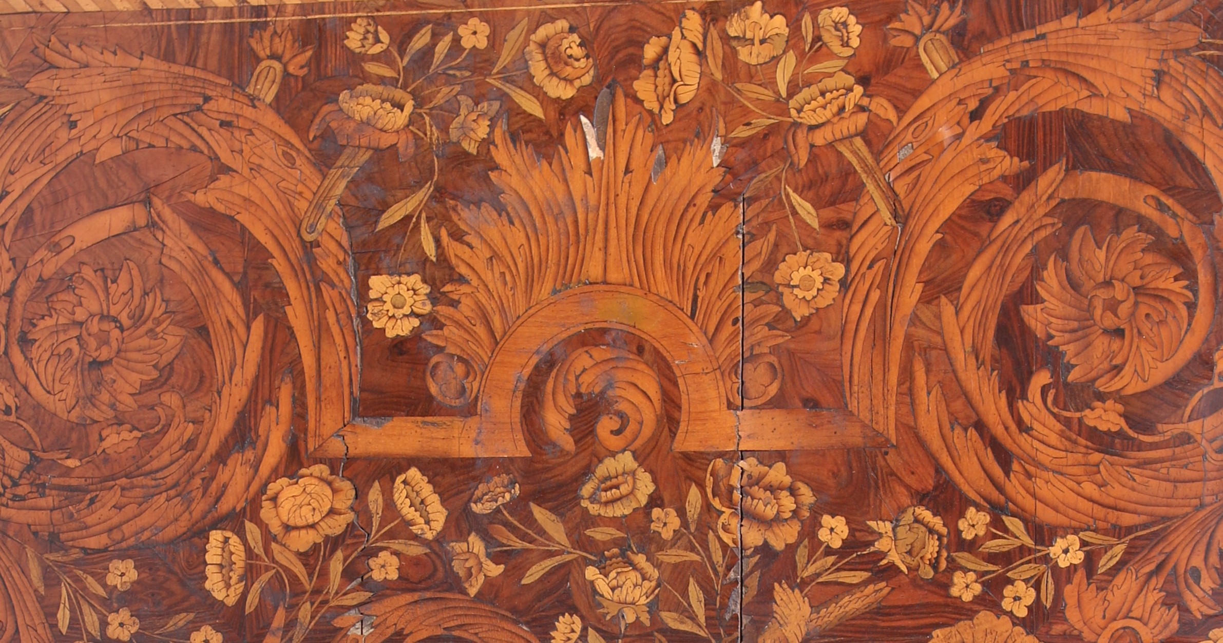 Le riche décor du plateau s'articulant autour d'un vase godronné sur piédouche fleuri d'une tulipe, de rinceaux stylisés et de volatiles, dont un rapace aux ailes déployées sur fond de rosaces naturelles du bois.