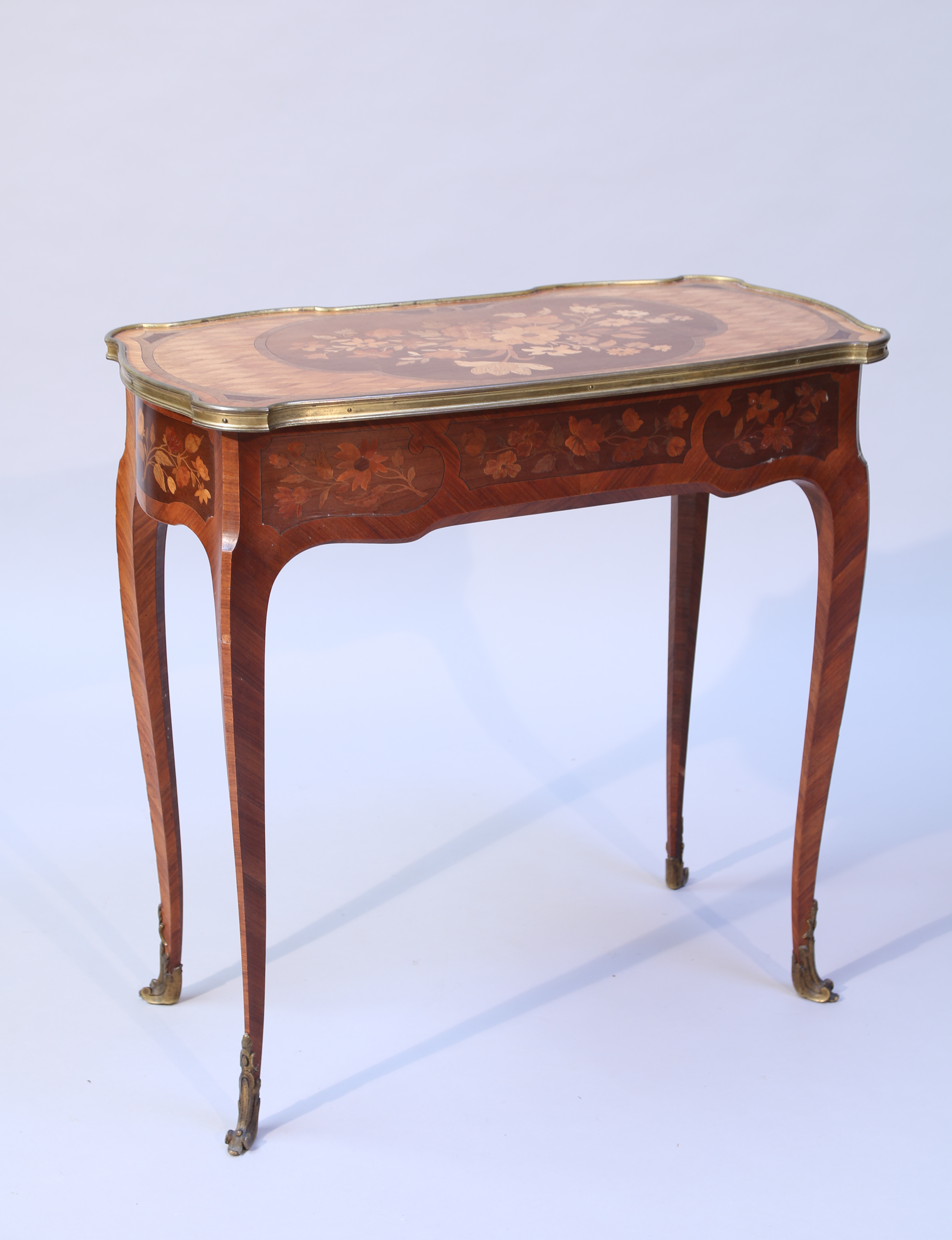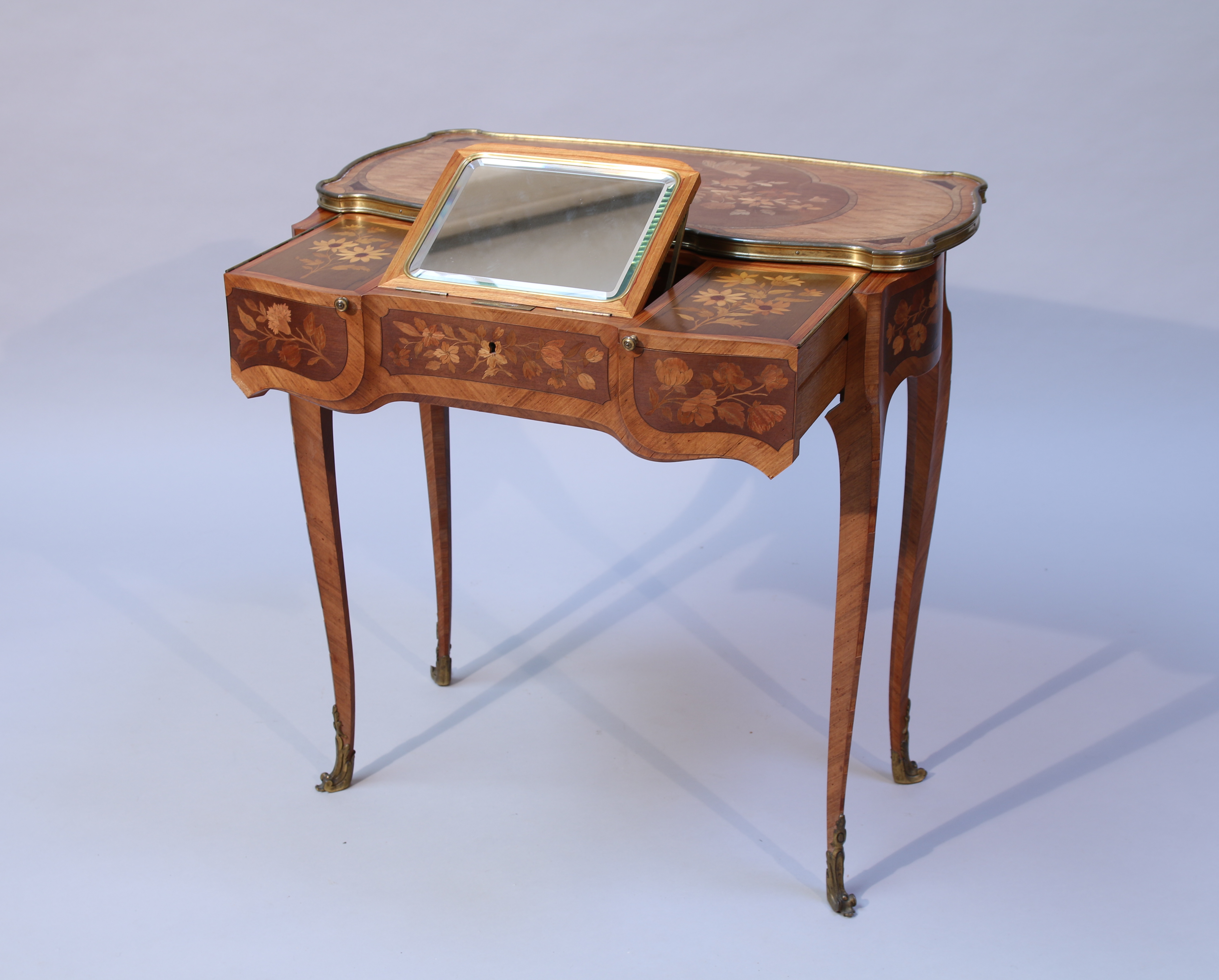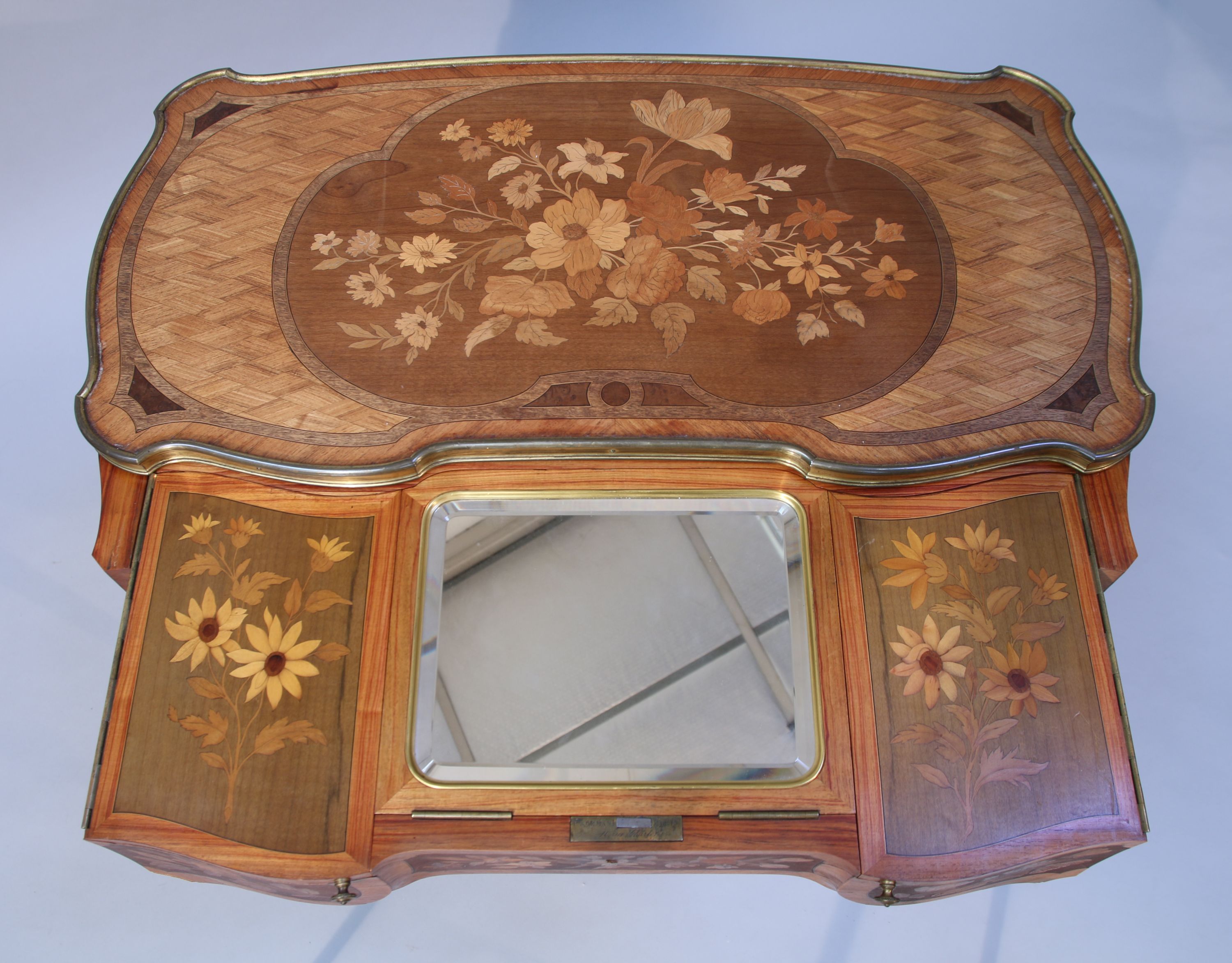 à décrochement central à décor marqueté toutes faces de bouquets floraux dans des réserves en bois de tabac, sur des encadrements en bois de rose. Le plateau ceint d'une lingotière de bronze reçoit en outre un frisage de losanges en bois de rose. Il coulisse pour découvrir trois compartiments, celui du centre est foncé d'un miroir biseauté. Elle repose sur quatre pieds cambrés terminés par des sabots de bronze ciselé et doré.