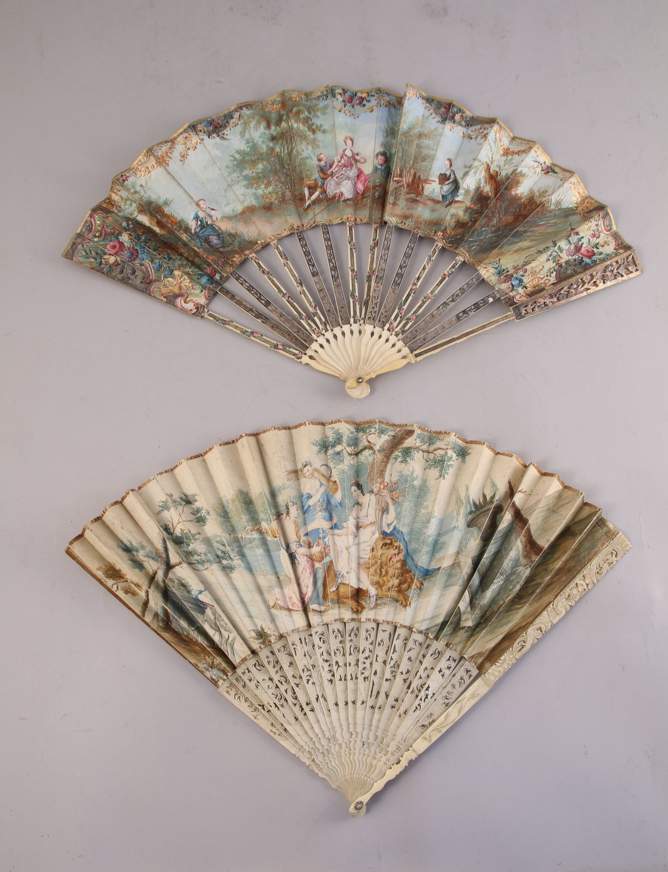 - ÉVENTAIL plié. La feuille en papier peint à la gouache d'une allégorie de l'abondance sur fond paysagé. Revers muet. Monture à brins ajourés de rinceaux et personnages XVIIIe. Haut. 30, Larg. 51 cm. (petits accidents, usures, manque un strass à la rivure)