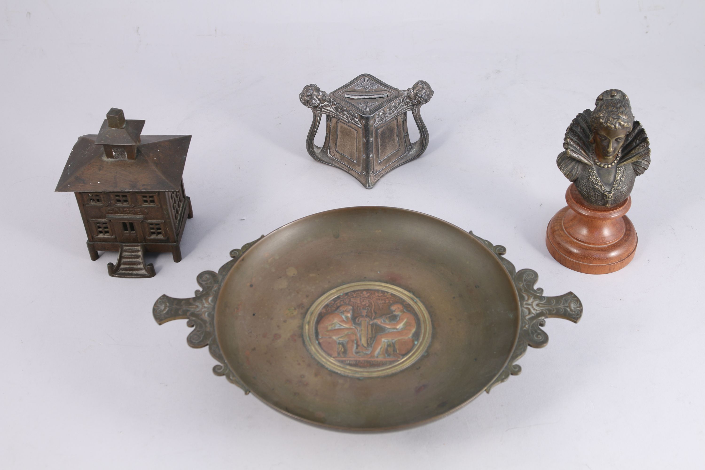 COUPE à l'ANTIQUE en bronze par Barbedienne d'après B. Levilain (Diam. 21 cm), un BUSTE de FEMME en bronze dans le goût de la Renaisssance, sur un socle en bois tourné (Haut. totale 14,5 cm) et deux TIRELIRES en métal.