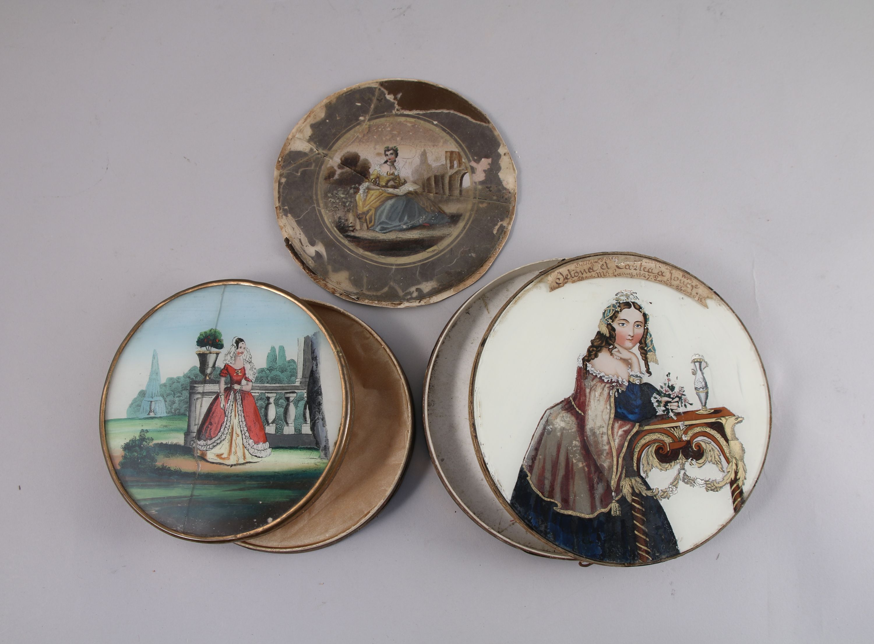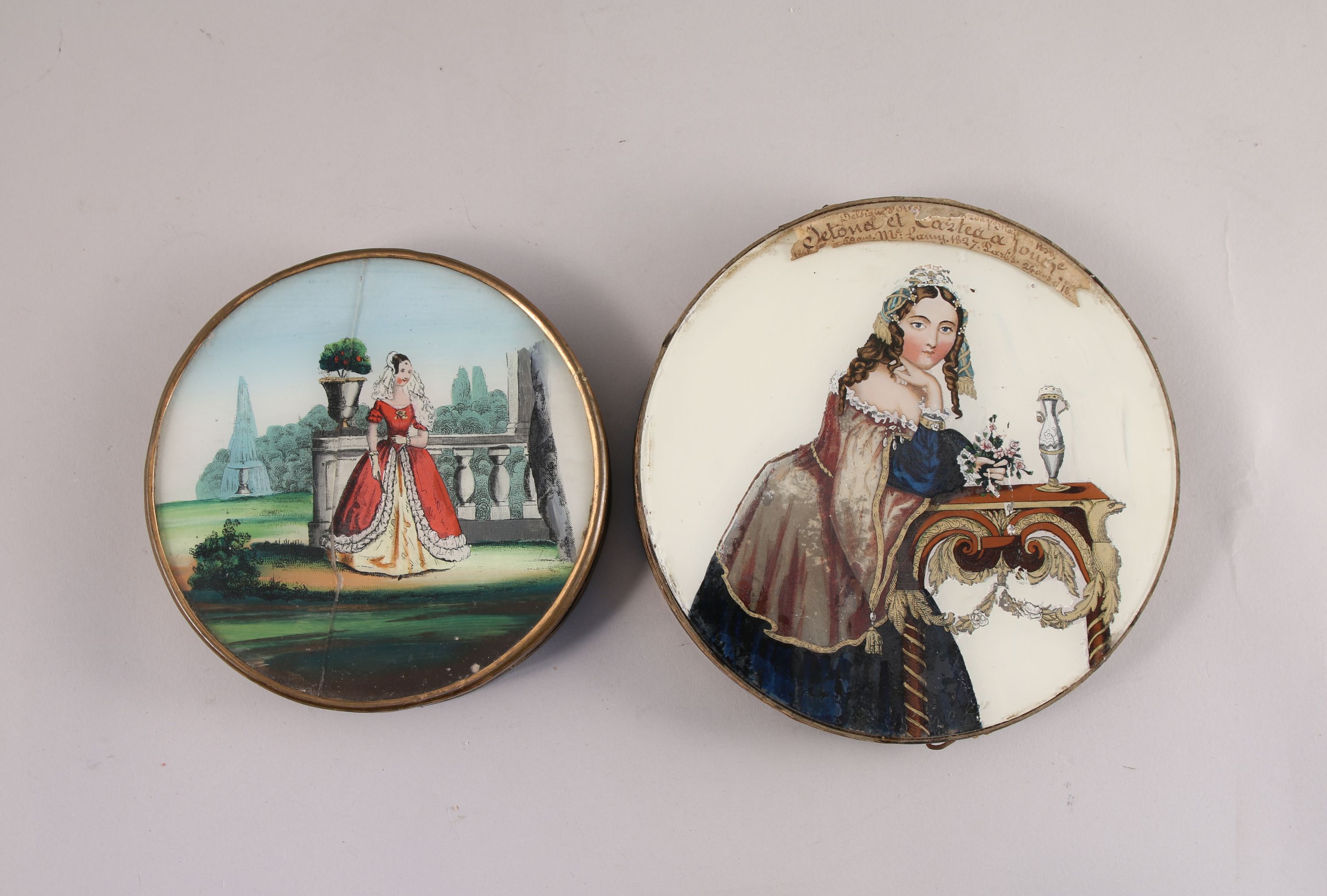 Deux BOÎTES circulaires avec un décor en FIXÉ sous verre.