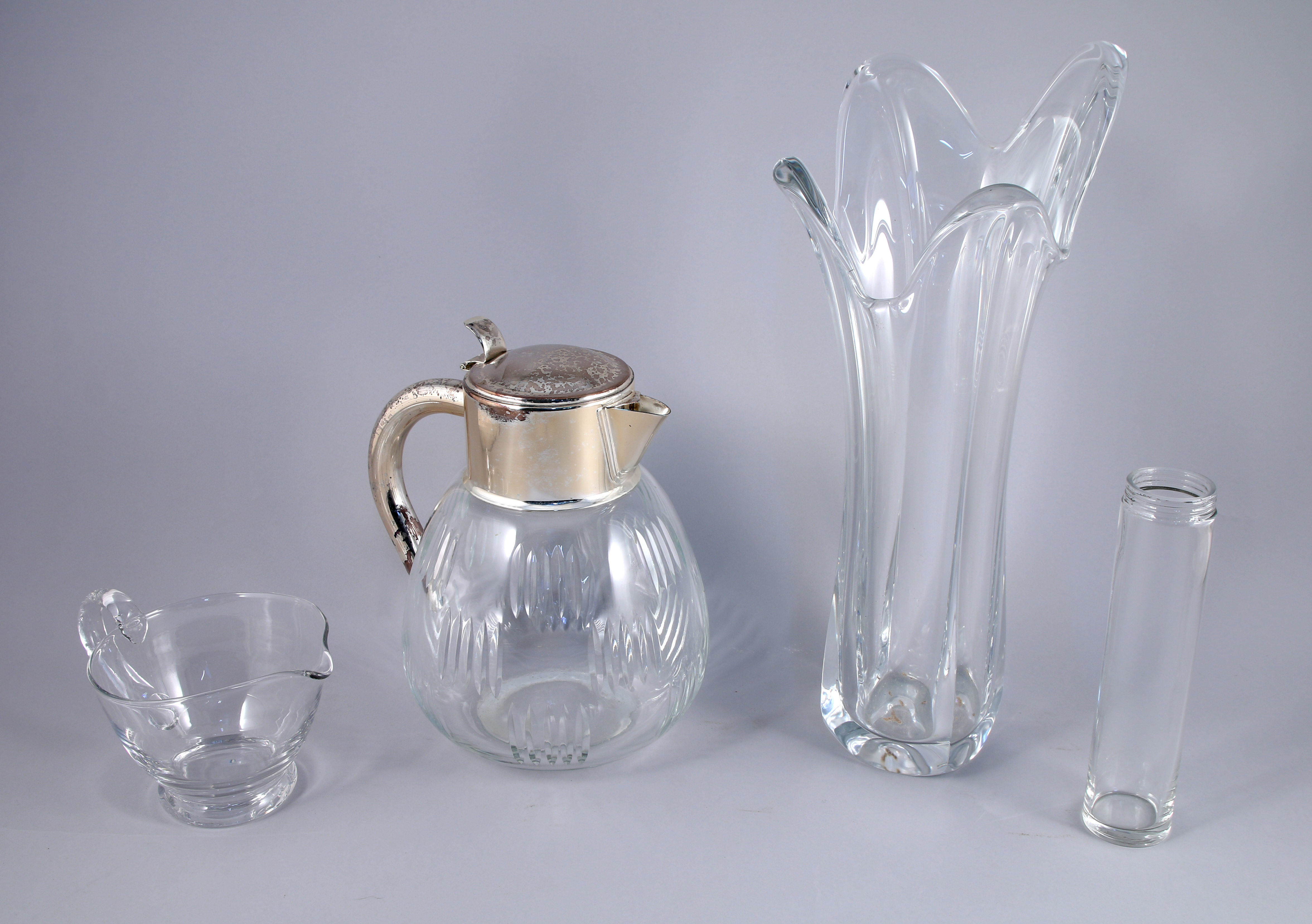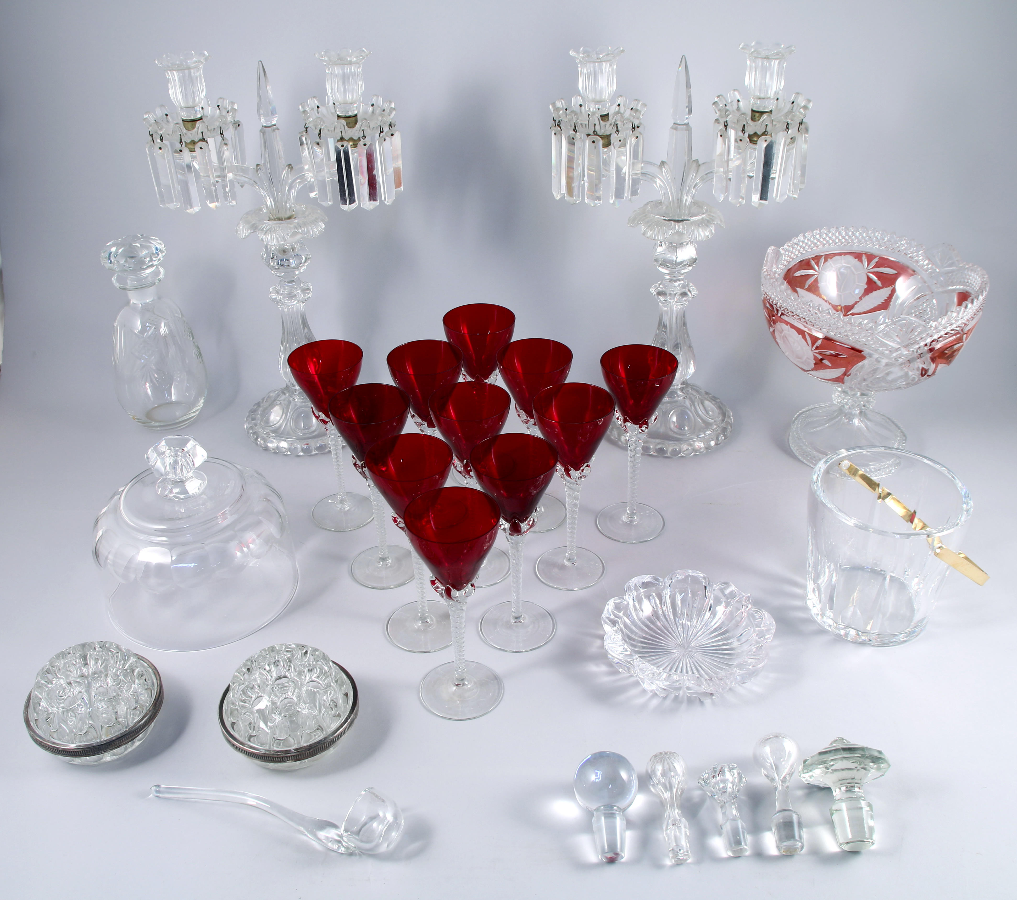 dont une paire de candélabres en verre à deux bras de lumière ornés de pampilles en cristal (Haut. 39,5 cm); vase en cristal; seau à glace en cristal, cloche en verre; coupe en cristal de Bohème à réserves roses; suite de 11 verres à pied torsadé, réceptacle rouge; broc à monture en métal argenté.